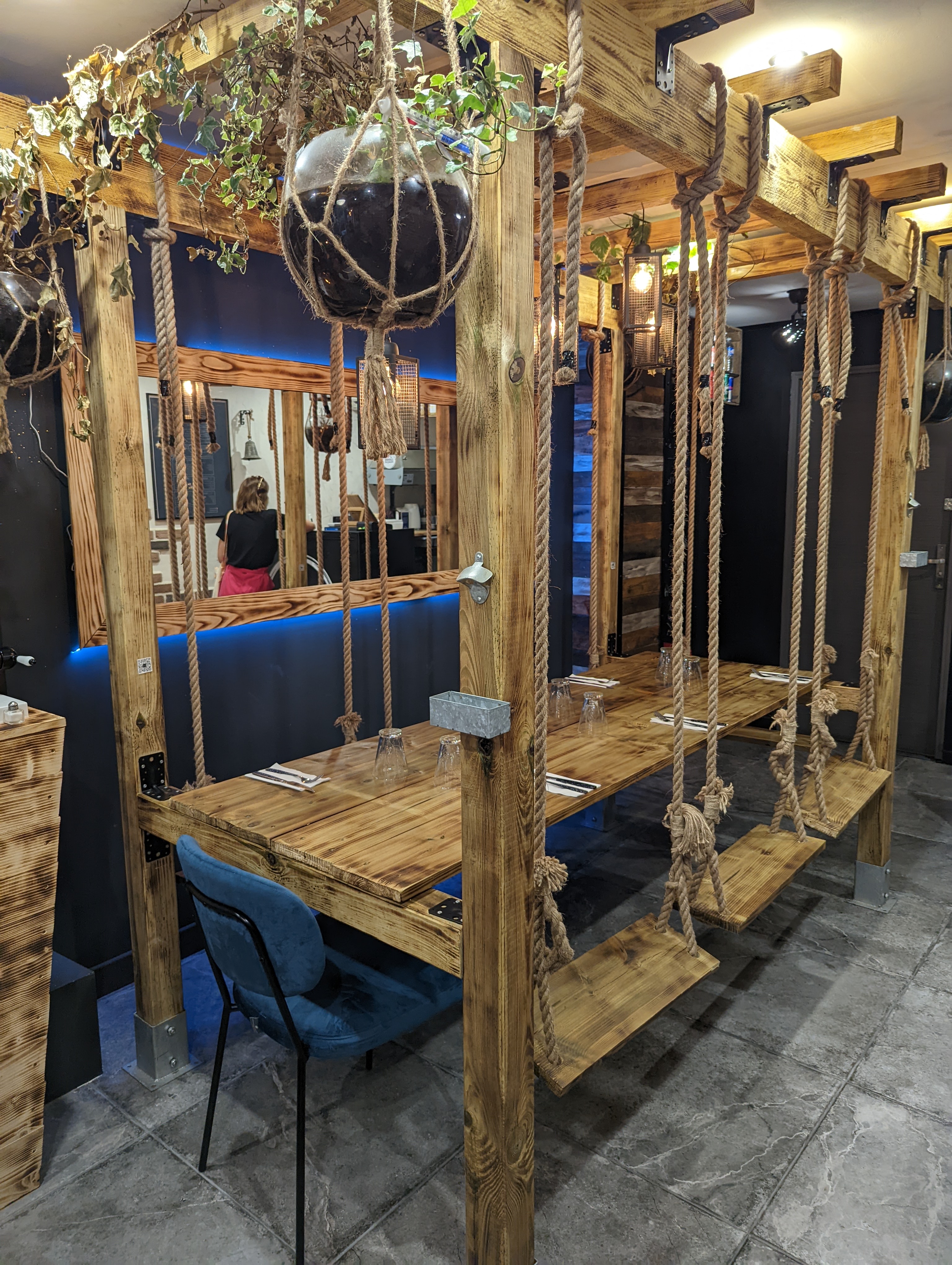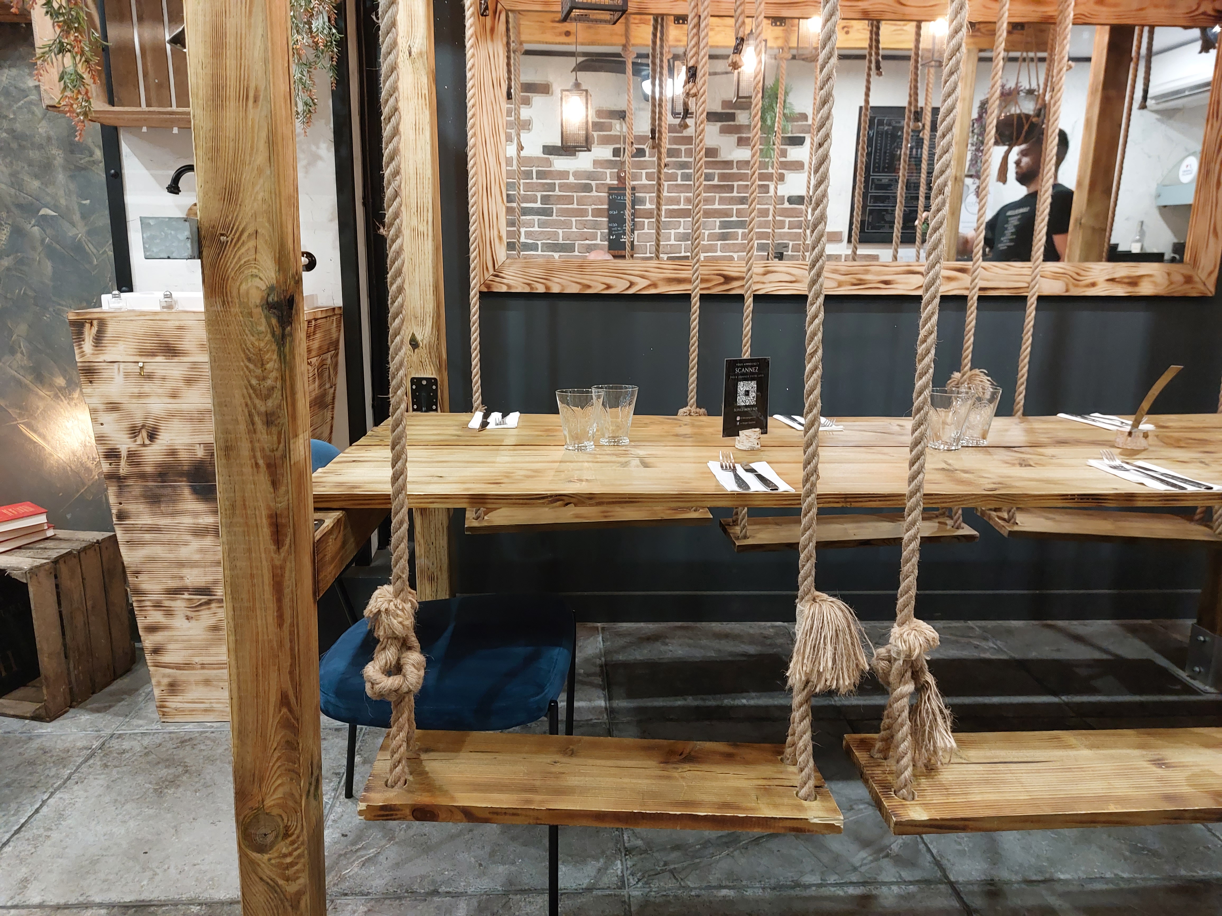 Cadre hyper sympa et très originale avec ses balançoires , on a adoré se balancer en mangeant de super hamburger vraiment délicieux et originaux 💖 ,le personnel en plus est hyper sympa.