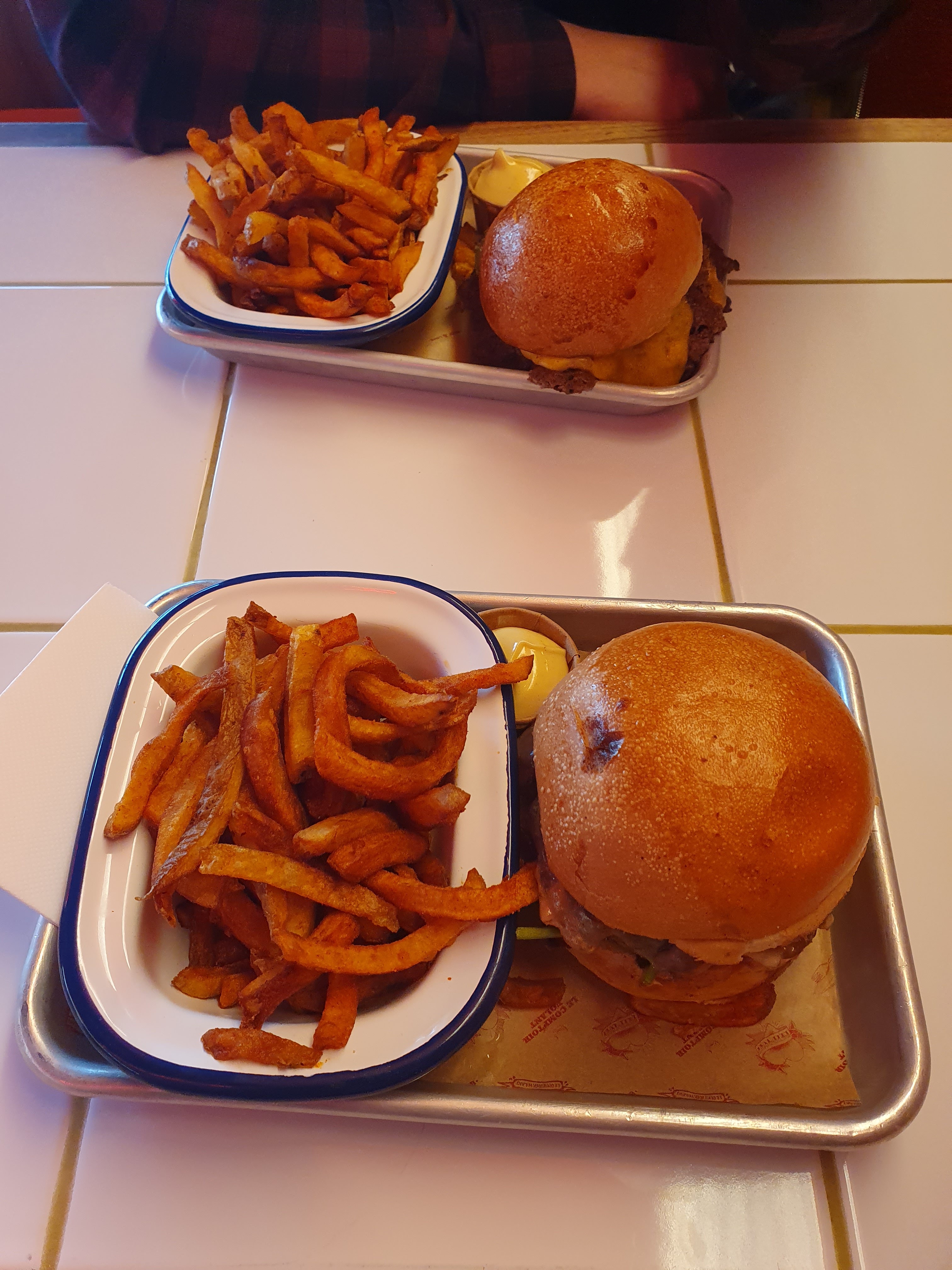 Les hamburgers sont très bons, par contre les frites 😐 Fines, trop cuites comme si c'était le fond de la cuve d'huile. Dommage. L'attente était un peu long.