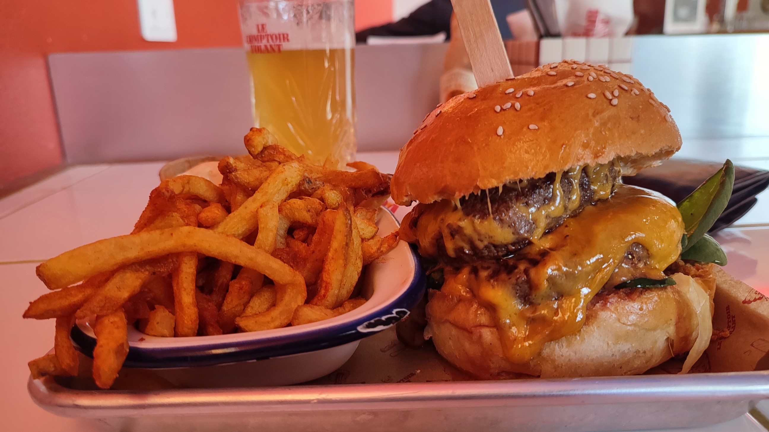 Deuxième fois que je viens manger au comptoir volant, deuxième fois que je suis pleinement satisfait, des burgers copieux avec de très bons ingrédients frais et goûteux, des frites épicées juste comme il faut, avec du cheddar coulant dessus, un régal. Et pour couronner le tout de bonnes bières artisanales et locales 👍 Pour terminer le cadre est vraiment sympathique et original.