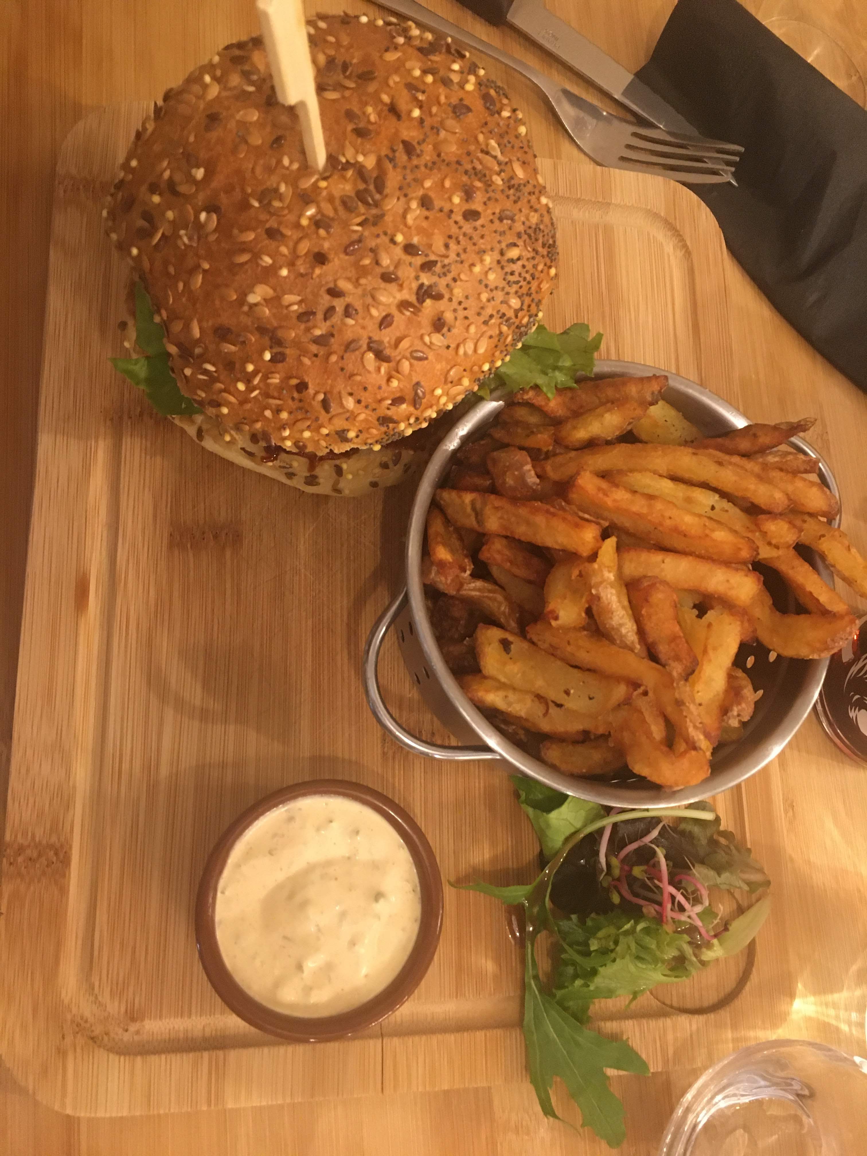 1er avis que je mets sur internet pour un restaurant qui le vaut bien. Que dire?ou plutôt rien a redire. Burgers parfaits ,frites maison comme je les aime,sauce exquise. Salade délicieuse en alternative au burger Nous n' avons pu tester les desserts par faute de temps;promis la prochaine on fera la totale. Personnel accueillant,sympathique et qui n 'en rajoute pas. Excellent rapport qualité/prix Allez y les yeux fermés.