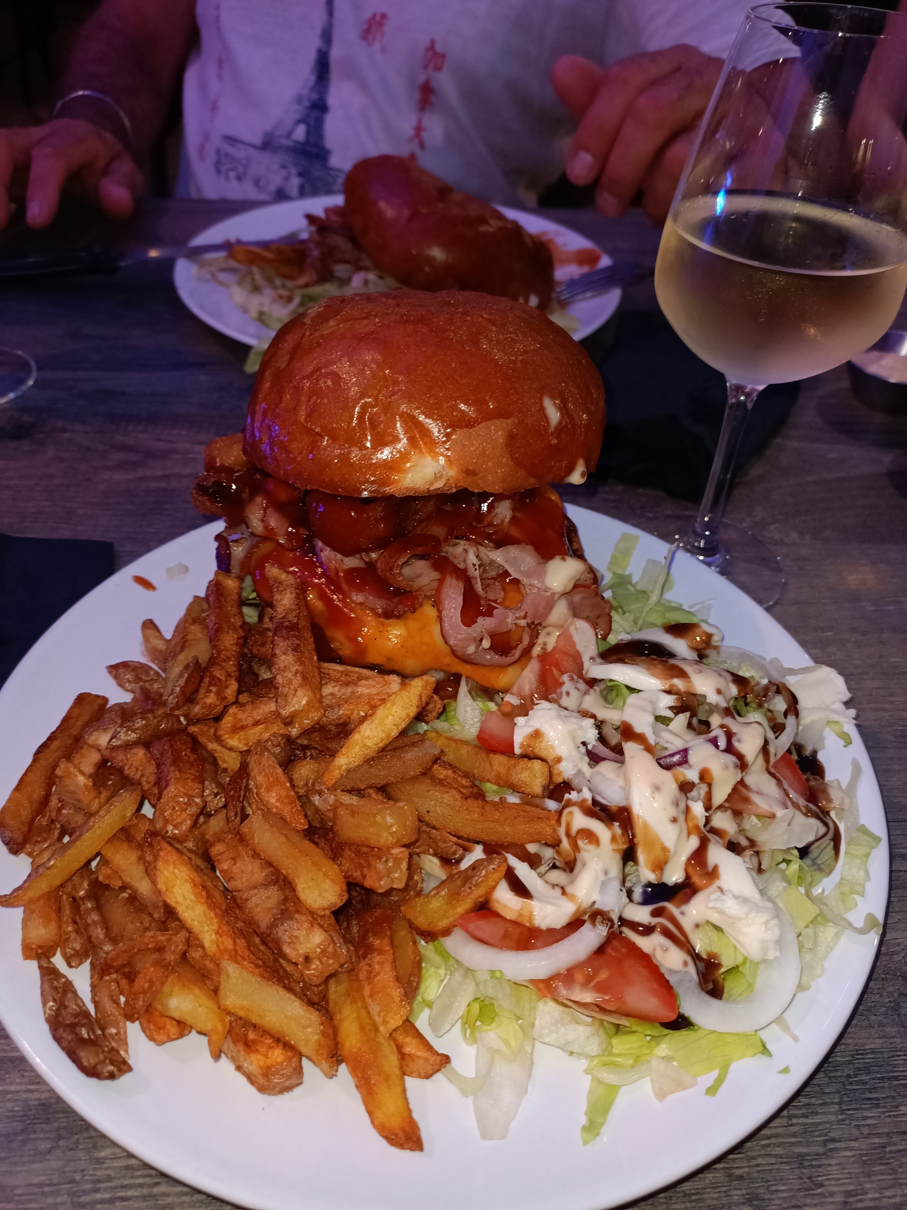 Critique culinaire de passage ce jour dans le beaujolais. Contact par téléphone avec une dame agréable qui me confirme qu’il n’y a pas de carte sur internet et qui me l’envoie donc par sms. ( pourquoi pas).je désir donc emporter mon repas et cette dernière m’informe qu’il ne font que du « à emporter » aujourd’hui car absence de cuisinier. Commande donc prévu pour 12h45 et prête à 12h35. Repas bon avec pain bun’s fait maison ainsi que les frites ( très bonnes). Points négatifs pas de serviette dans mon sac, pas de sauce pour les frites mais je m’en passe bien car excellentes. Prix assez haut mais « raisonnable » pour du fait maison. Cheveux dans mon Burger bien vouloir vérifier avant d’envoyer les plats. Devanture sympathique, restaurant sympathique, propre, climatisé, petit mais convivial. Bonne adresse à recommander sur place.