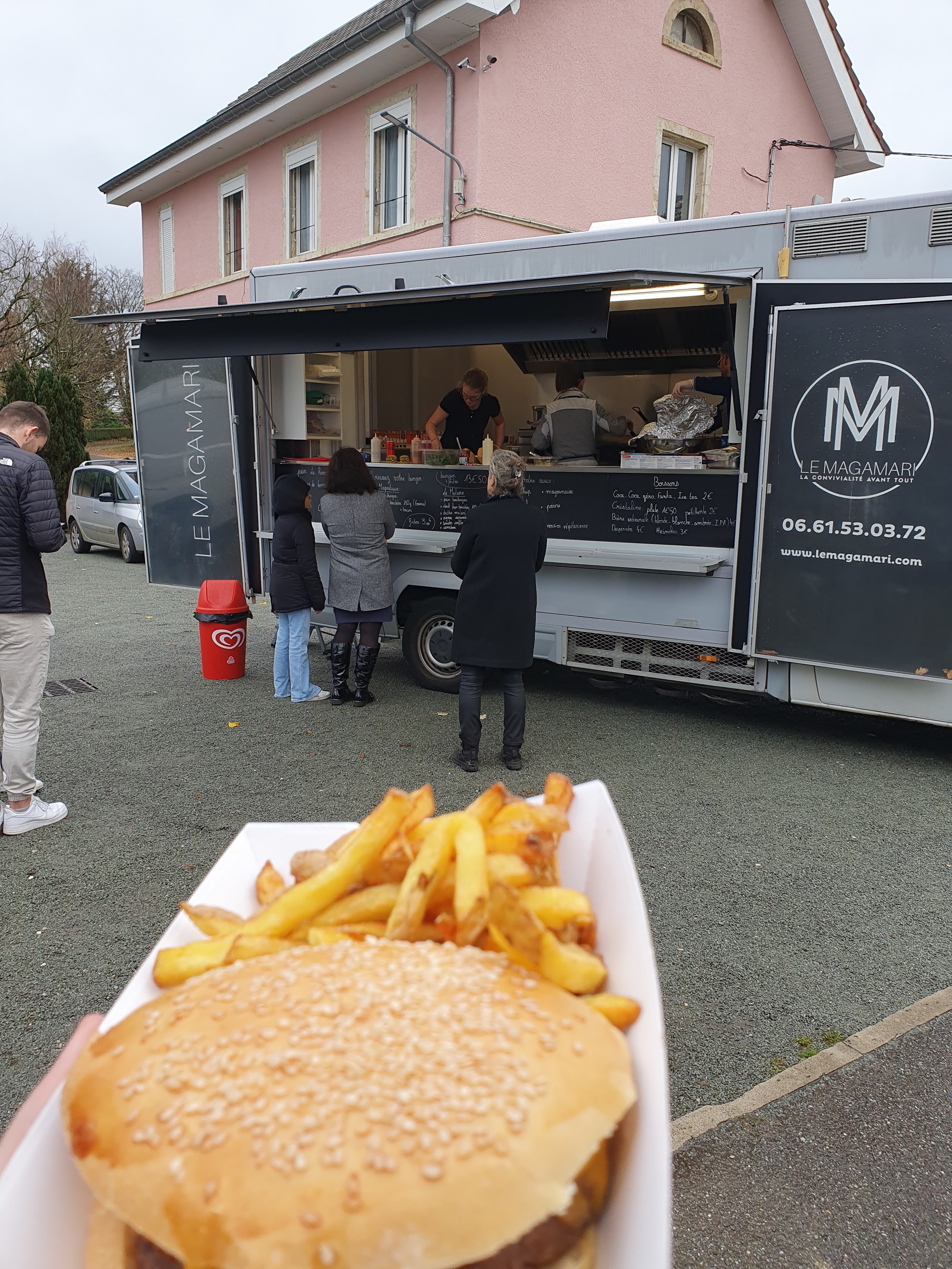 Nous avons bénéficié du service Foodtruck le Magamari pour une soirée d'anniversaire, avec plus de 60 personnes. Aucune fausse note, service professionnel , convivial, des plus agréable et rapide. Des hamburgers et frites de qualité et délicieux. Également des hamburgers spéciaux pour les végétariens ainsi que pour les vegans. Une cuisine de qualité. Je recommande les services de Magali et Marine. Nous nous sommes régalés. Bravo et merci à elles!!!