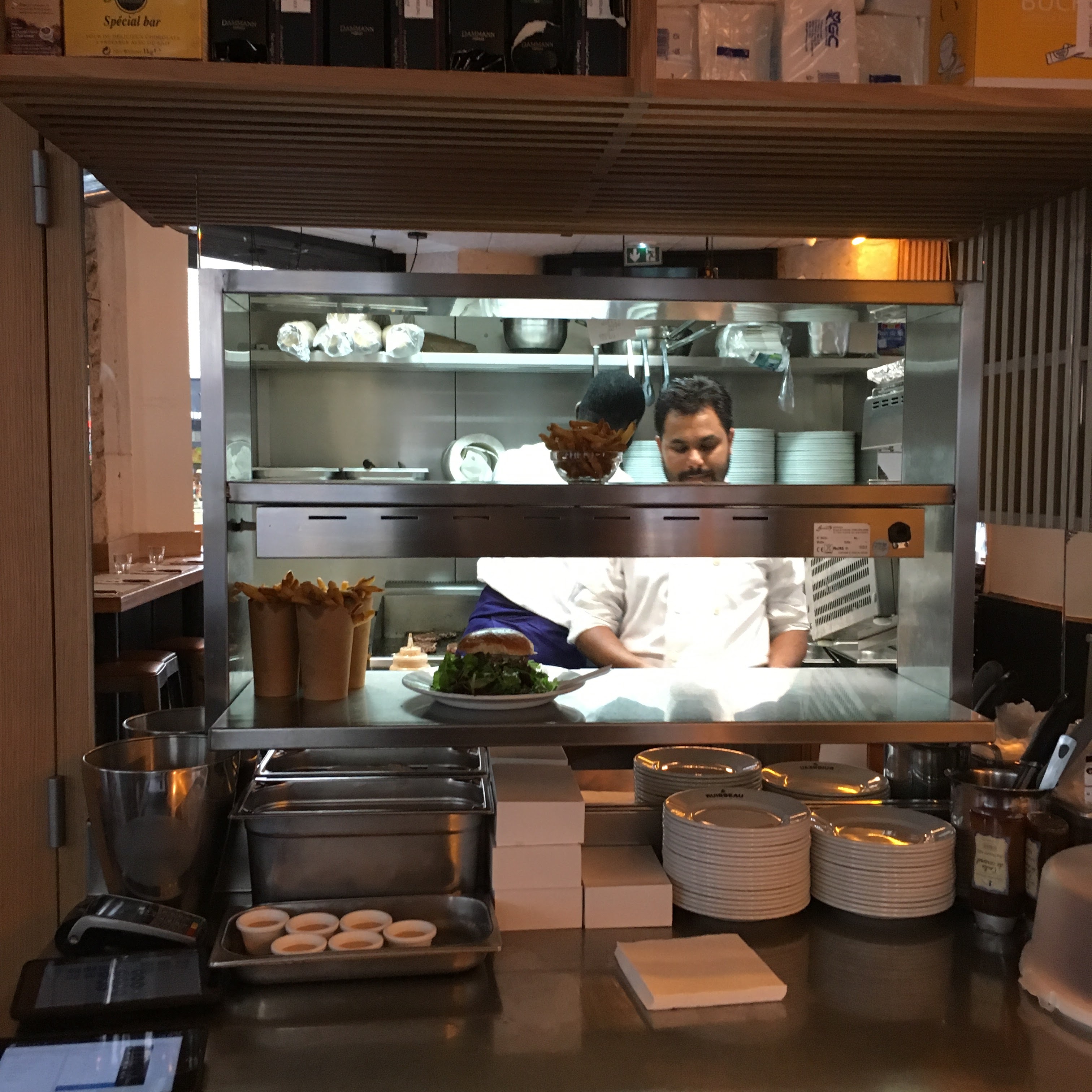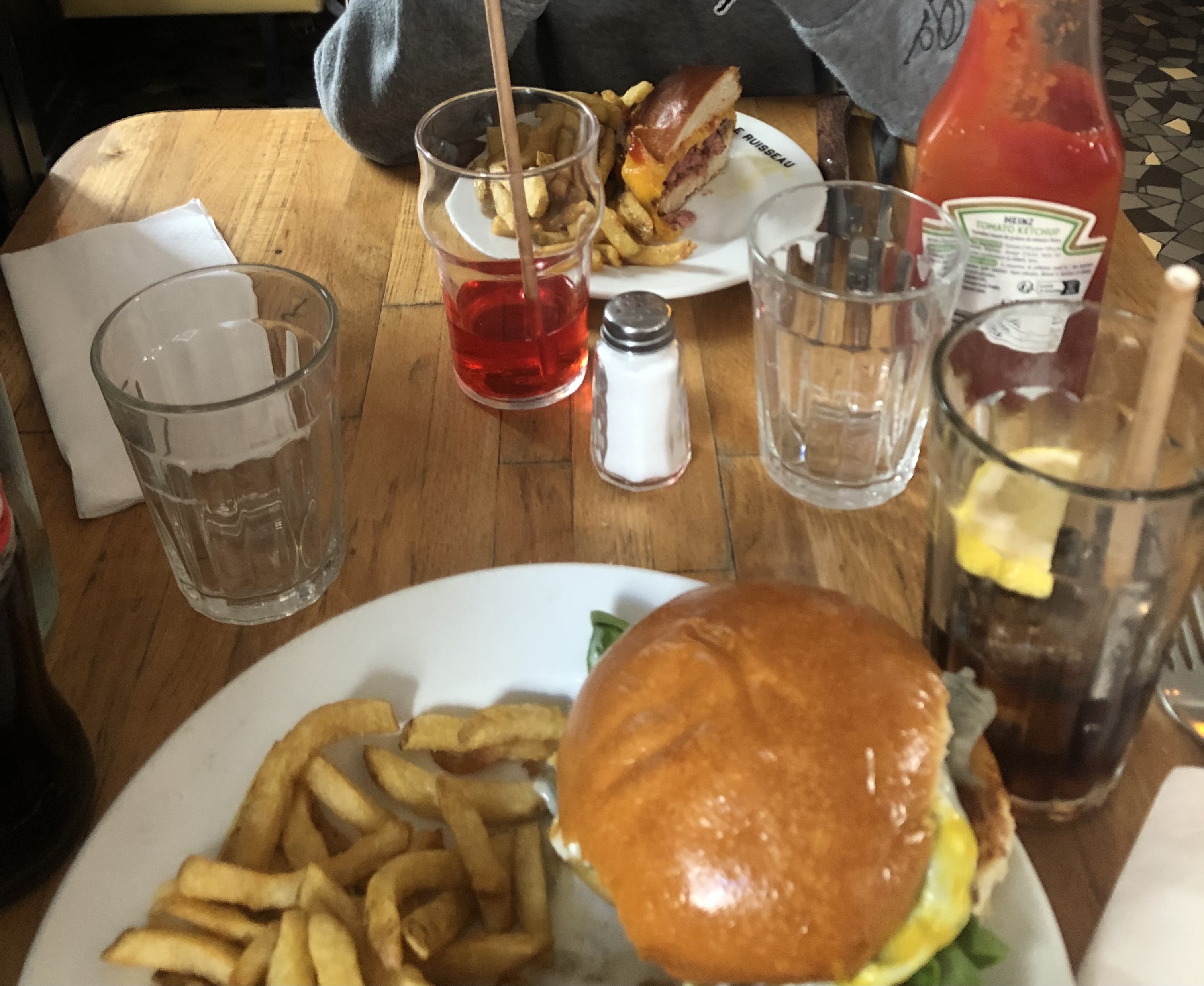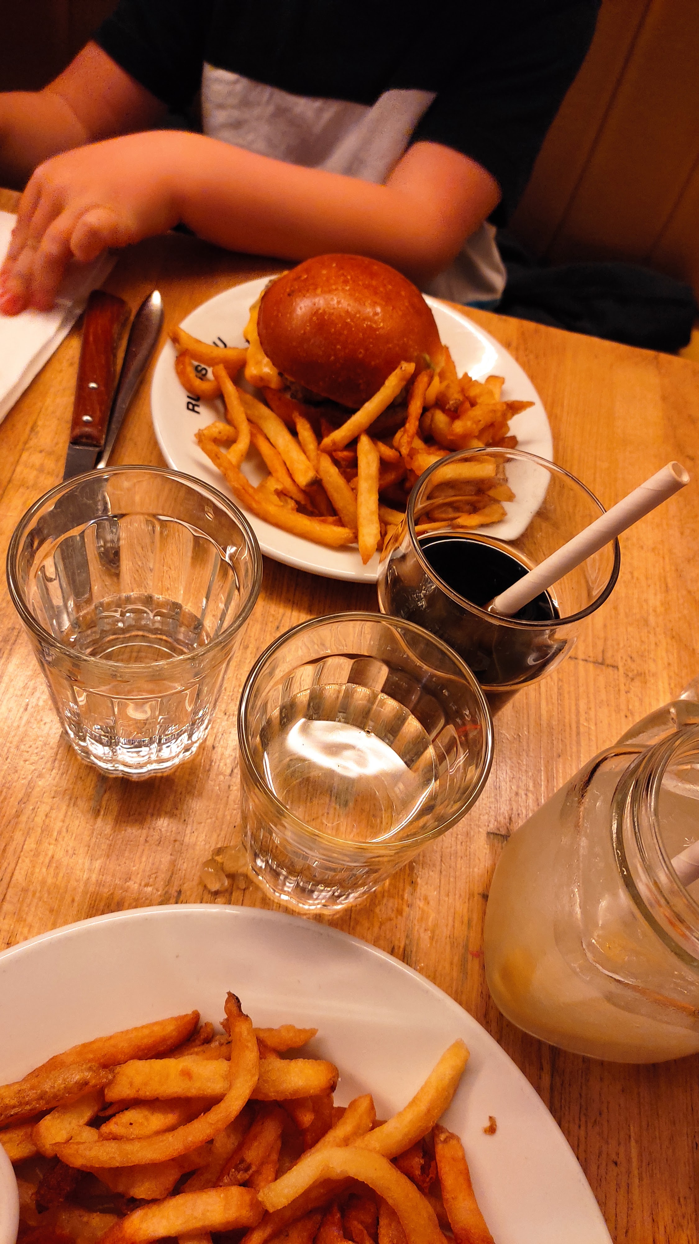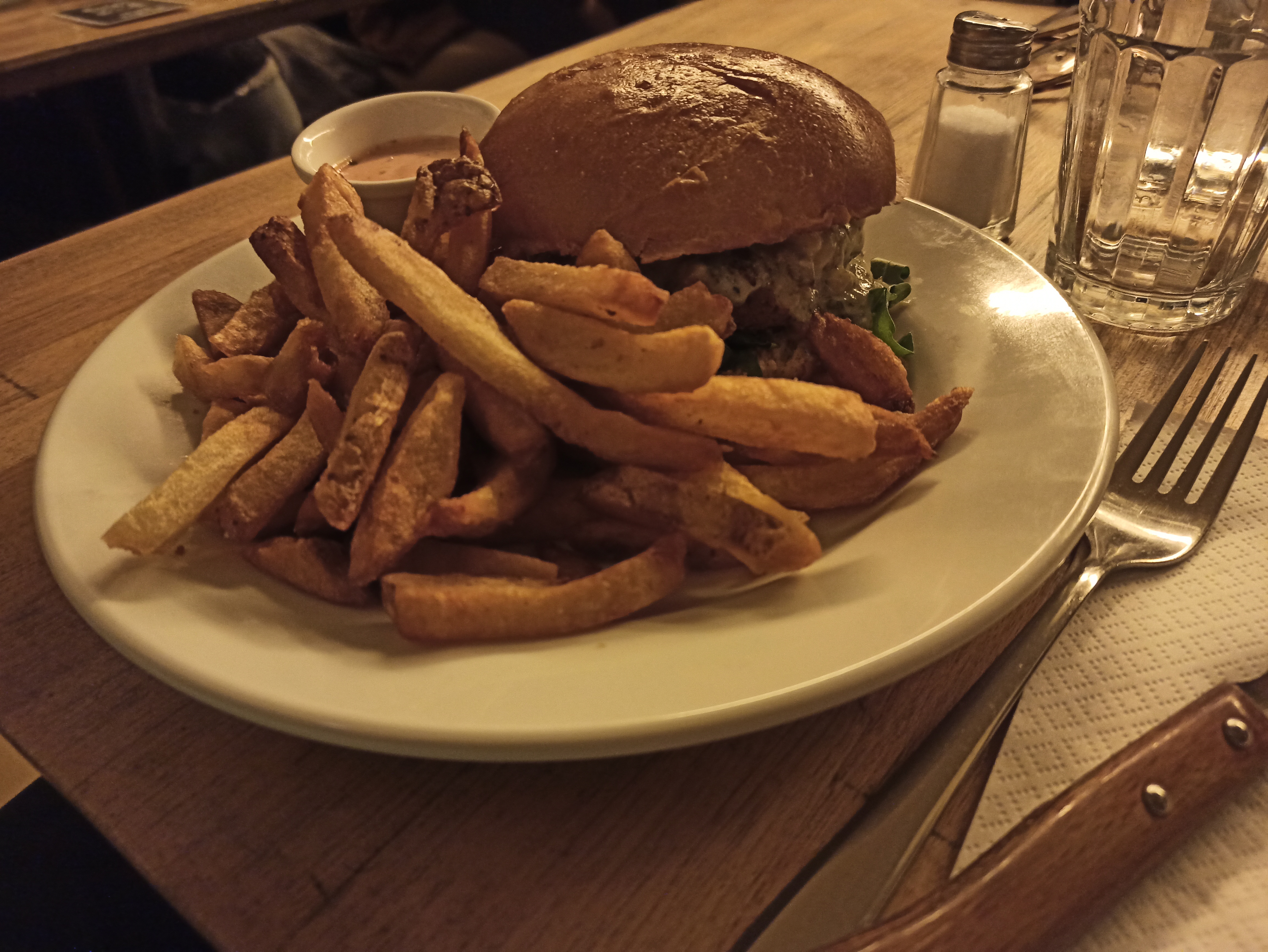 Les hamburgers, de ce que j'ai pu goûter ainsi que celui de mon fils sont délicieux ! Incomparable avec ceux des chaînes de fait food, on ne joue vraiment pas dans la même catégorie. Les frites tiennent la route, la cuisson est maîtrisé. Au dessert panna cotta au coulis de framboises. Je ne sais pas si c'est fait maison, mais dans tout les cas, un régal. Seul bémol, le cadre, l'agencement surtout. Vous mangez réellement coudes contre coudes avec vos différents voisins de table. J'ai pu remarquer que d'autres tables étaient plus aérées, sans doute pour les groupes de 4 ou plus, mais si vous venez à deux ça sera bien moins intime du coup.