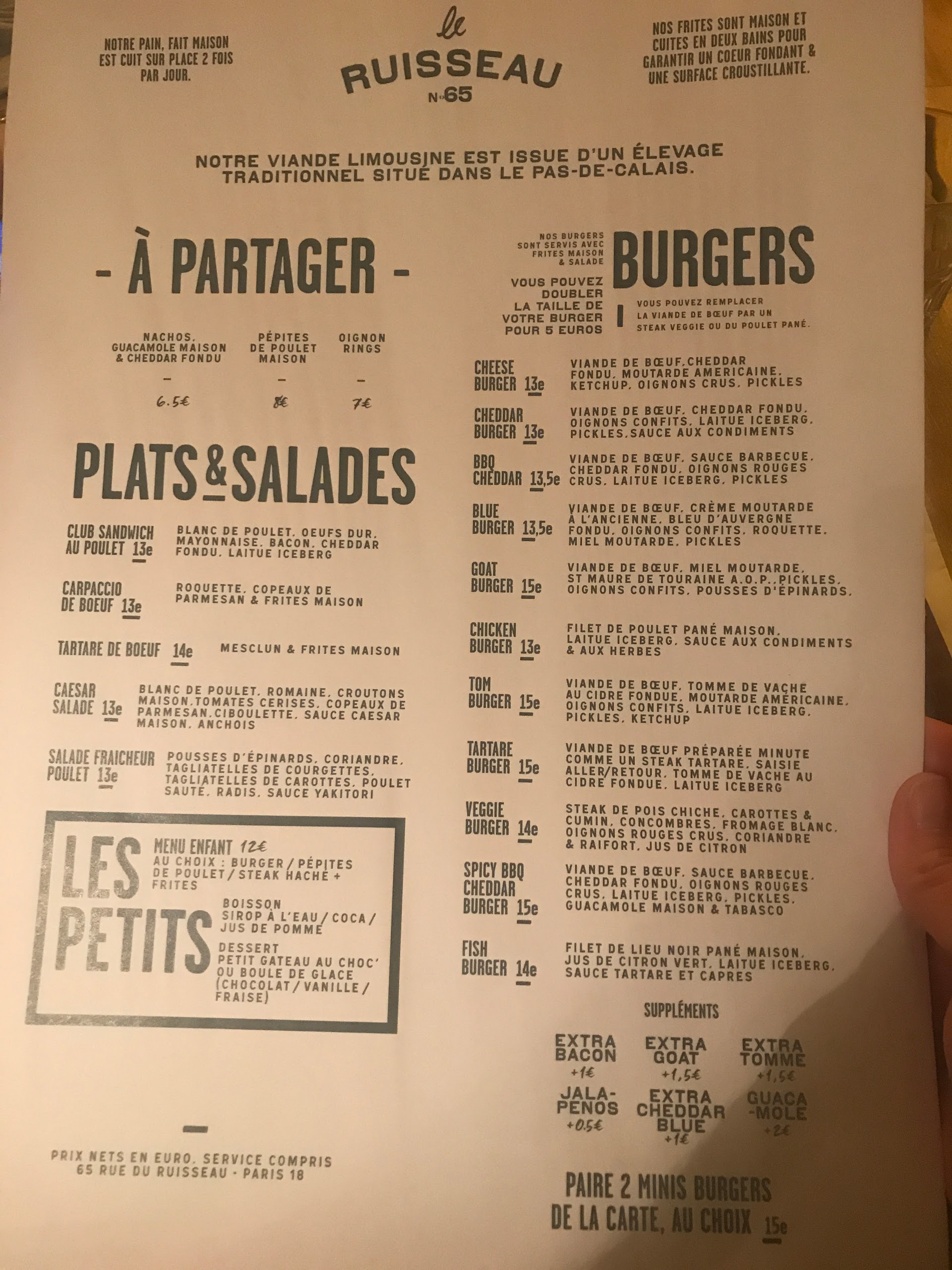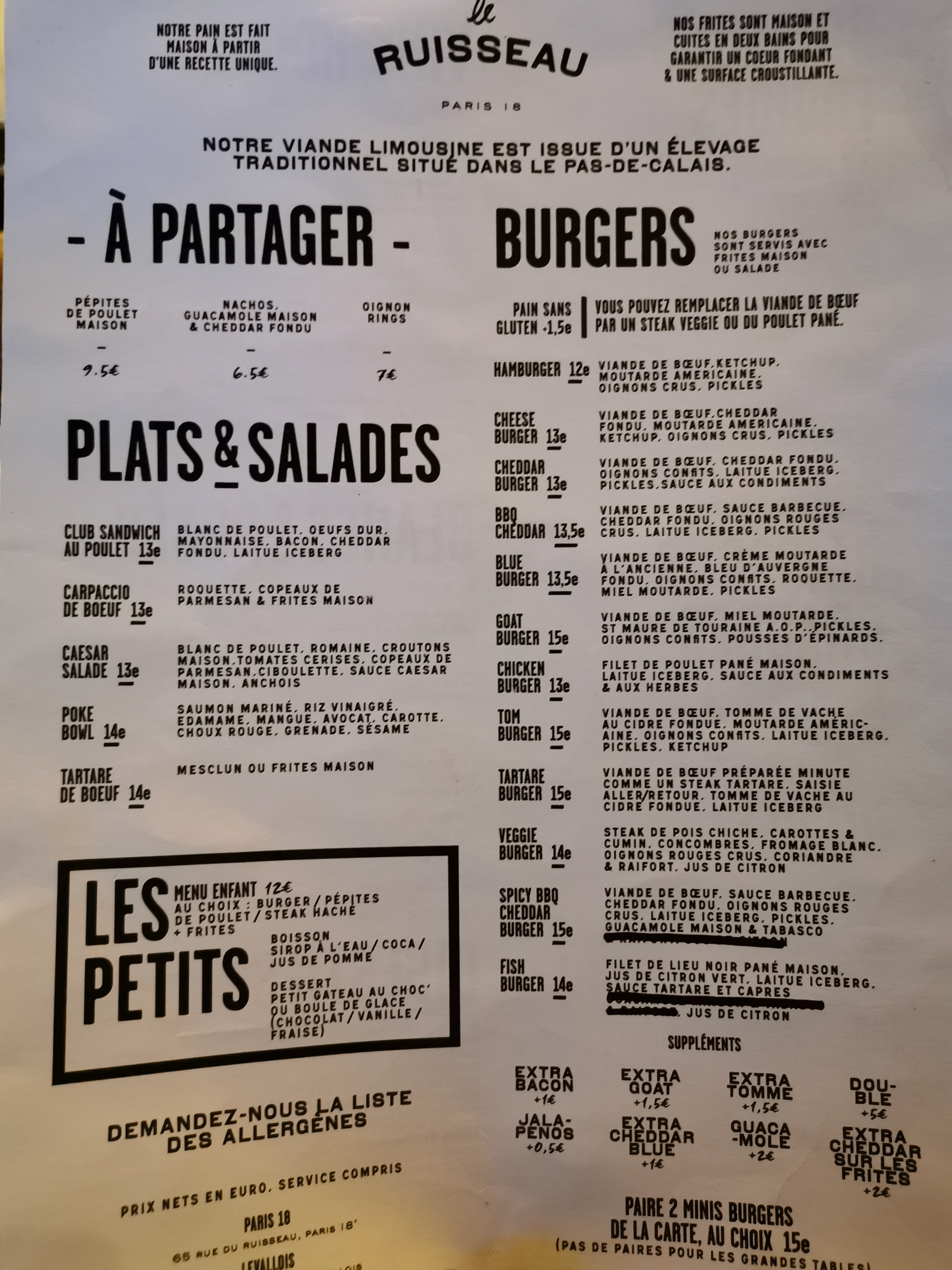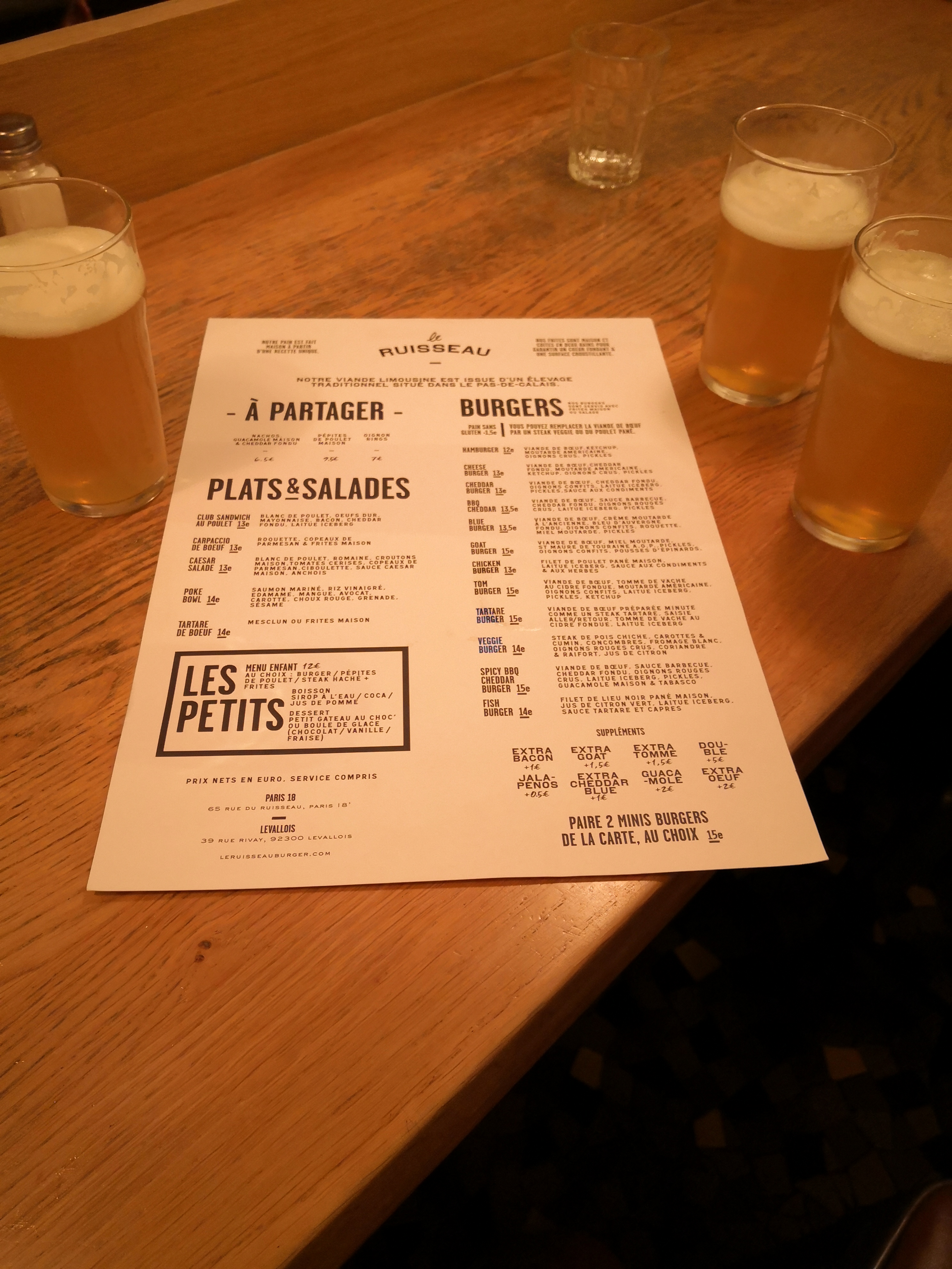 Le ruisseau à ses débuts aura été pour moi le meilleur burger de Paris pour la qualité des produits et pour les prix pratiqués à l'époque ! mais beaucoup de choses ont changé depuis ... les plats sont trop gras ( burger, frites et sauce ) c'est dommage car on ne sent plus les saveurs alors que les produits semblent toujours de qualité, Les prix ont augmentés et le service a diminué. Que ce soit sur place ou à emporter vérifiez toujours si on ne vous a pas oublié le fromage, le supplément bacon ou le coca que vous aviez commandé !