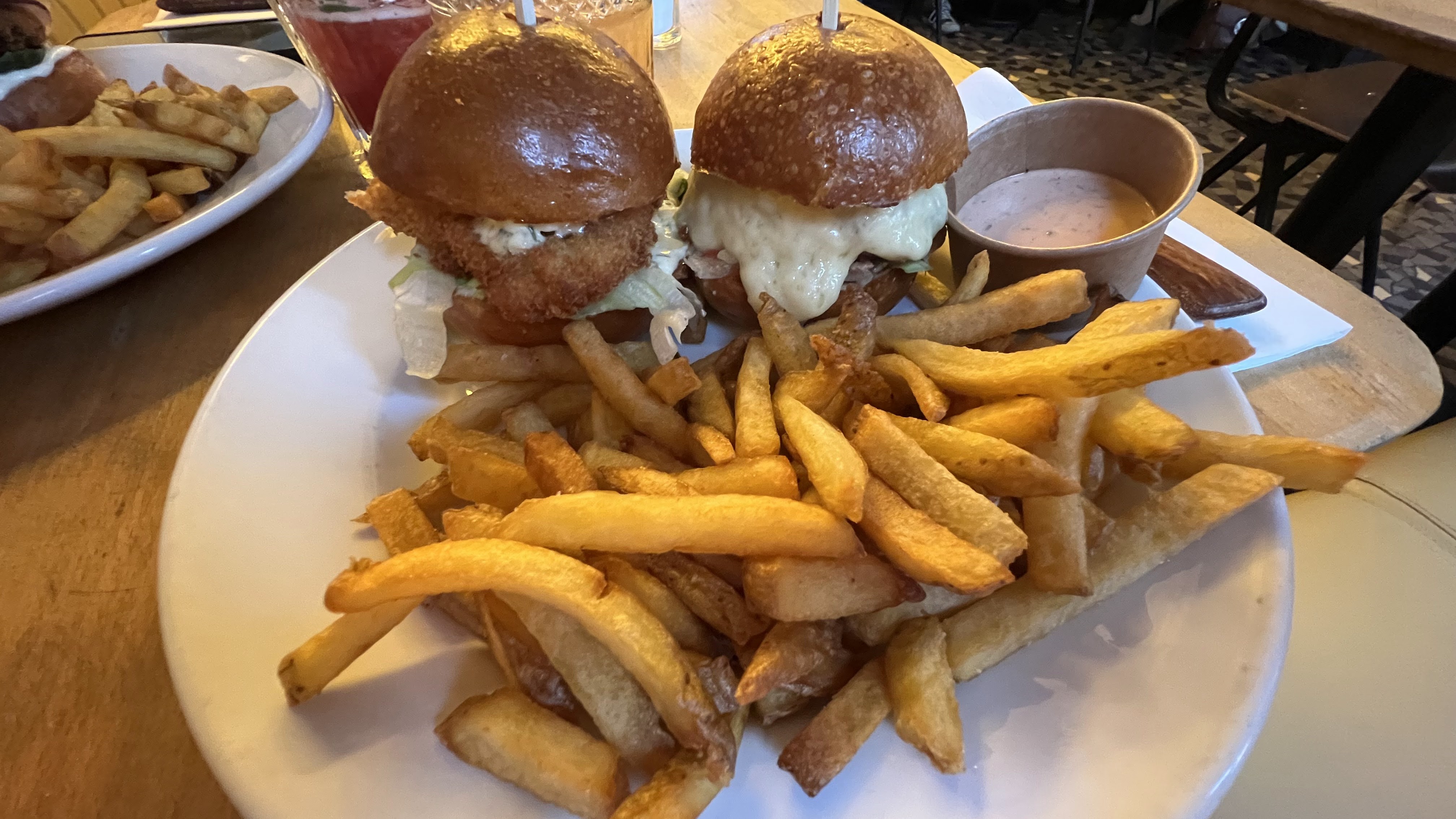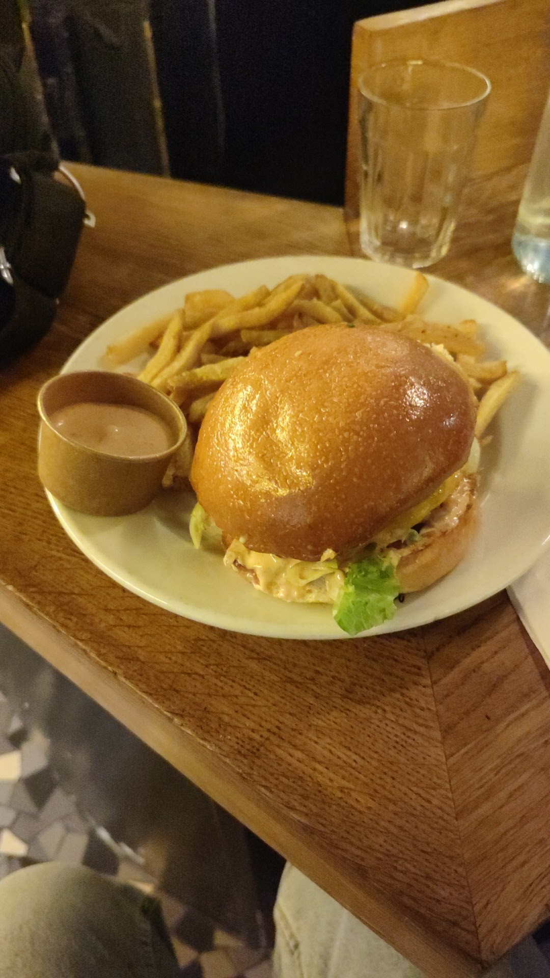 Burger miam miam frites miam miam Bonnes bieres, bon vin, cocktailssssss. Service sympa, non service hyper sympa souriant dansant musical. Enfant famille amis tous le monde se mélange ! Bon resto de quartier. Et ils ont de bons desserts aussi.. On y rencontre le quartier et des touristes vraiment sympa. A manger a toute heure. 🫶🏻🫶🏻🫶🏻