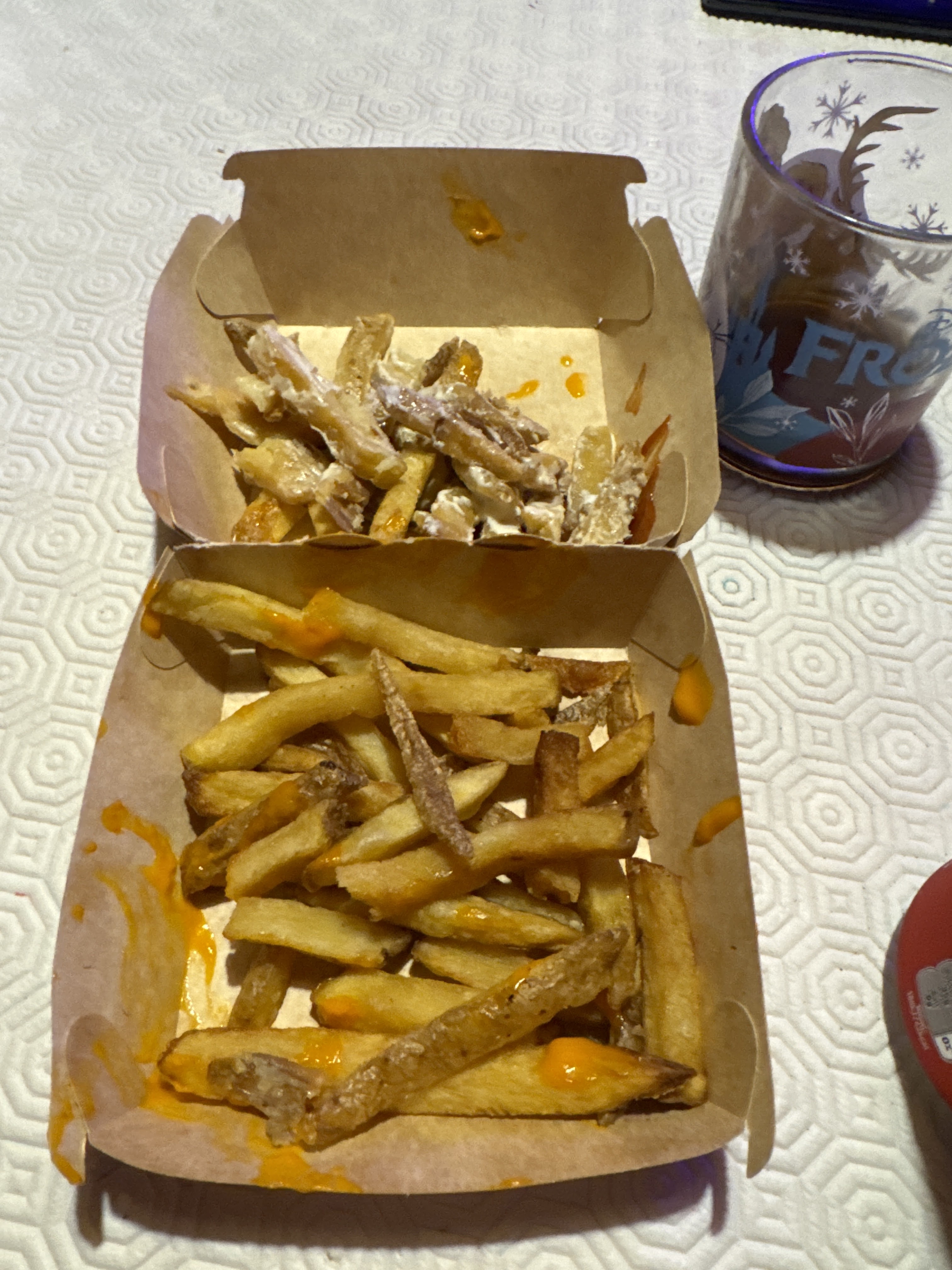 commande passé sur uber eat pour 30€ et le restau est sous le nom de La Cabane aux Poutines sur l'appli, donc ce n'est pas un vrai restau canadien, quasiment aucun gout les poutines, la Montréal mangeable peu de gout, la québécoise j'ai du jeter inmanageable et ça ne donne pas envie au visuel ni à l'odeur avec des oignons qui avait l'air de daté de plusieurs jours, à éviter