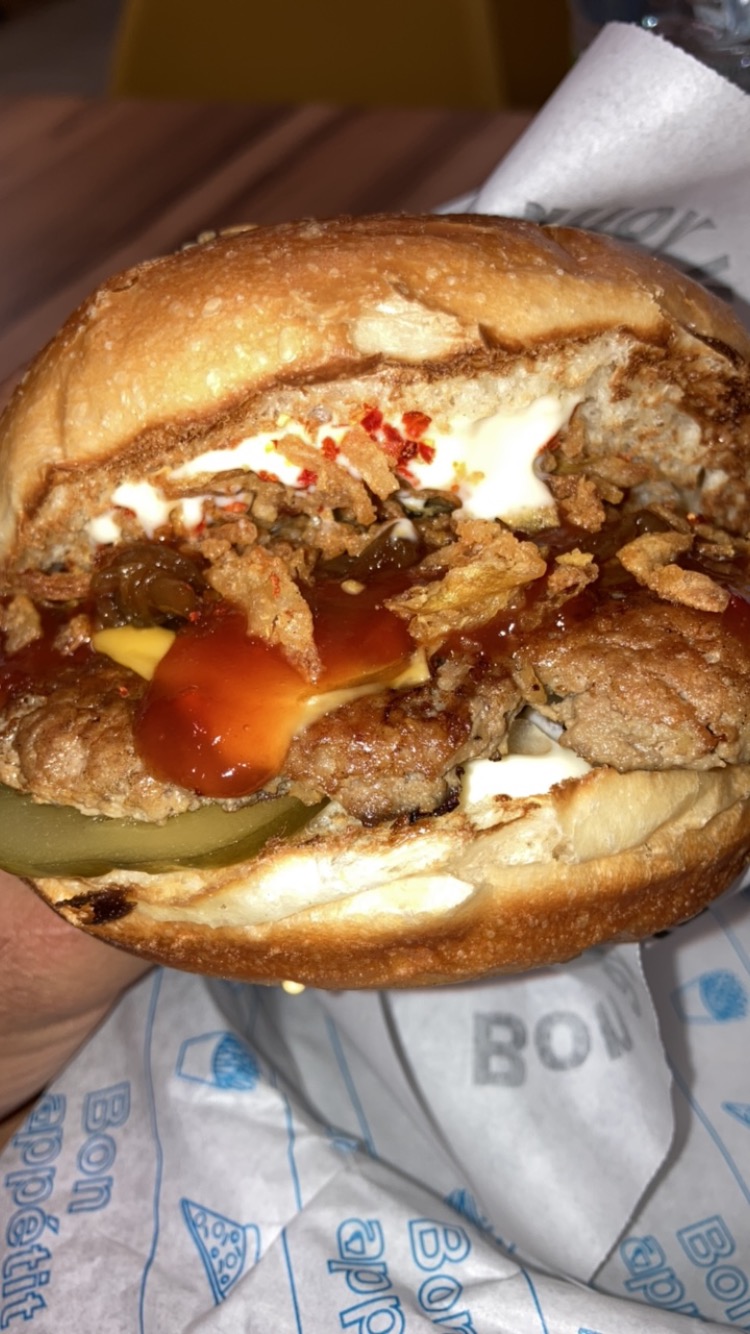Franchement c'était extrêmement bon burger super garni avec beaucoup de sauce les morceaux de tenders sont énormes et délicieux ils sont fondants en bouche pas trop gras et pas du tout sec j'ai vraiment adoré la cuisine tout était propre le le responsable était super aimable avec nous il nous a parlé il est super rapide et très accueillant les toilettes aussi étaient limites brillante hygiène +++ fast food à recommander( le critique gastronomique qui filmait 😁)