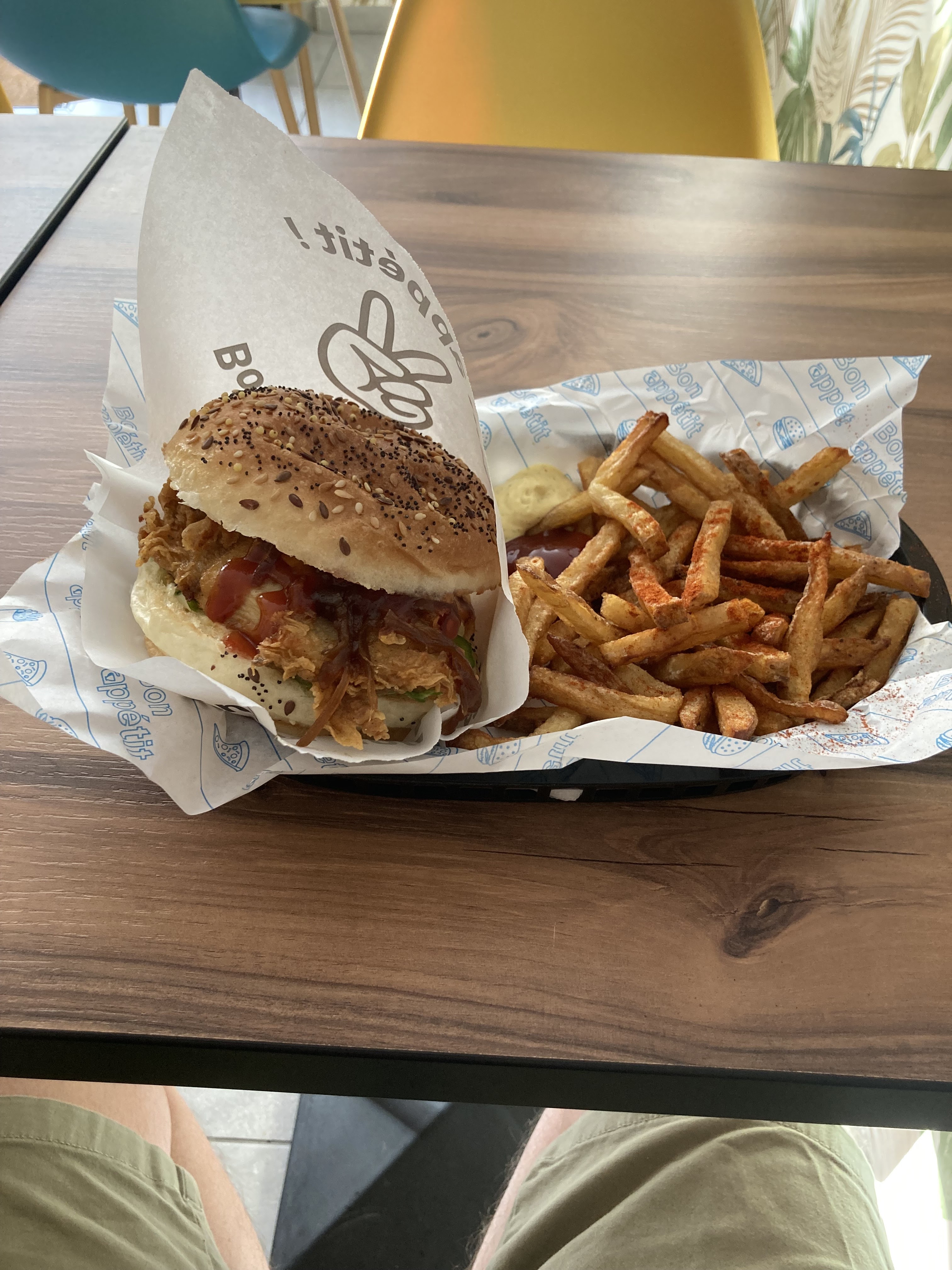 Une arrivée tardive et par le plus grand des hasards. Un snack hyper propre, un accueil très agréable. J'aime beaucoup le concept et de voir des pains briochés artisanaux, frites maison.... 😍😍