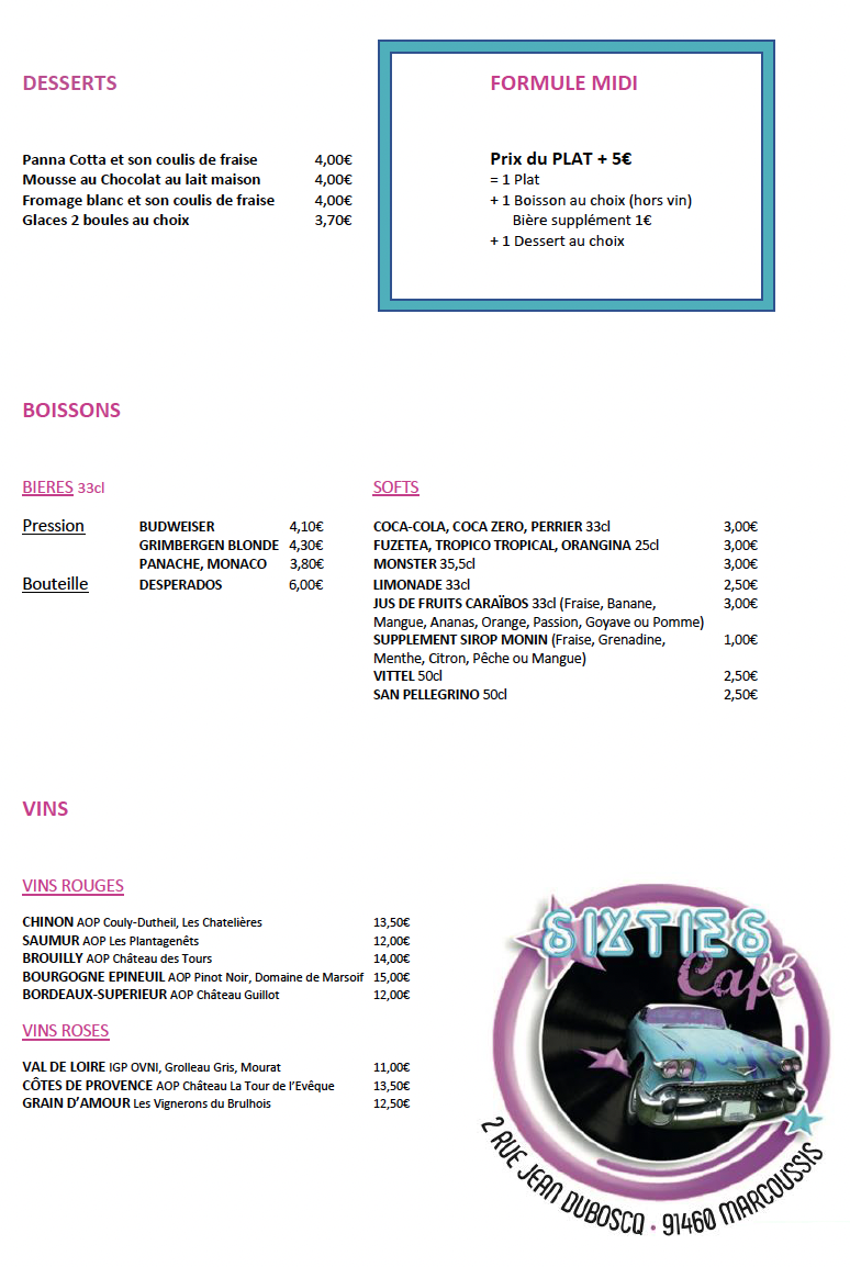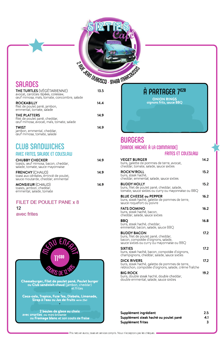 Si vous cherchez un restaurant pour déguster un délicieux burger, le sixties est le lieu adéquat. Son ambiance vous transportera en plus comme si vous étiez aux États-Unis !