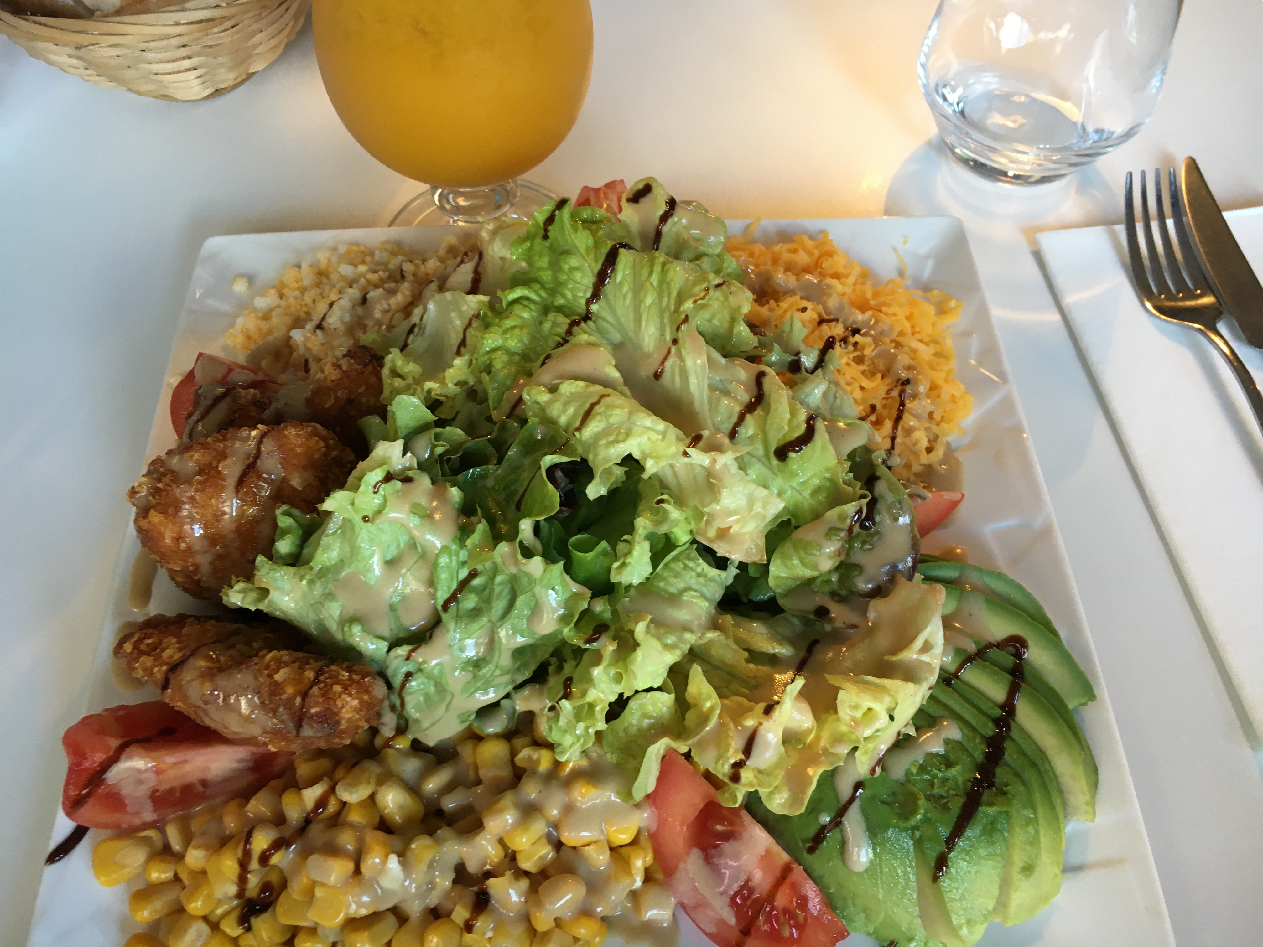 Très convivial. Super déco. Cuisine plus que généreuse même avec une simple salade qui était excellente tant par la présentation que par la composition: poulets panés, oeuf mimosa, avocat, tomates et cheddar.