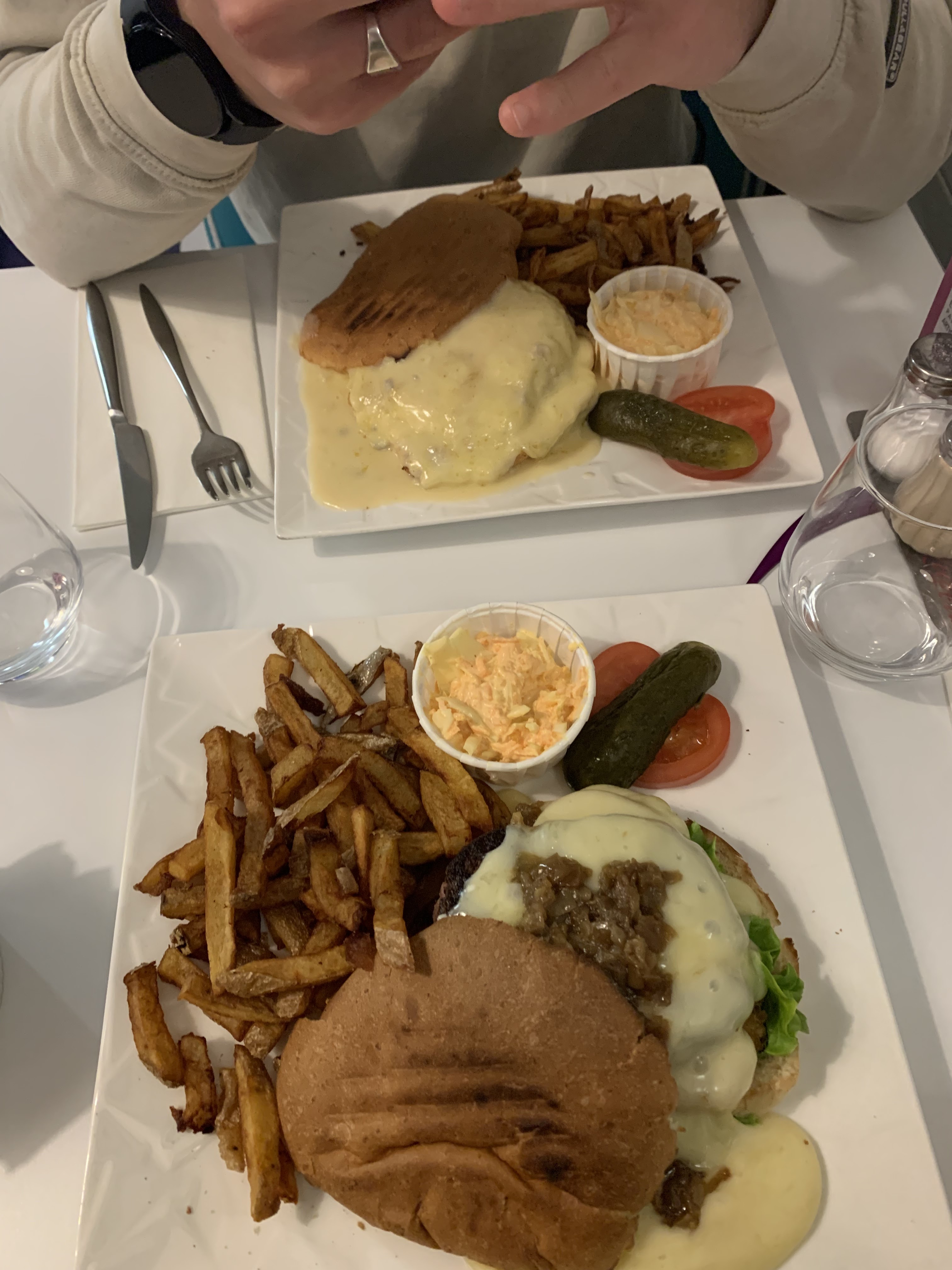 burgers corrects Patrone très nulle. Nous avons mangé avec des amis et 2 autres personnes nous ont rejoint en fin de repas pour prendre un café et un dessert avec nous. ils ont été refusés sous prétexte qu on ne pouvais pas rajouter une chaise a notre table alors qu il y avait de la place a notre table. Nous nous sommes fait «engueulé» par la patrone car il fallait les prévenir a l avance...bref la patronne n est pas commerçante et n est pas aimable du tout.... a fuir malgré les burgers corrects. Je n y retournerai jamais.