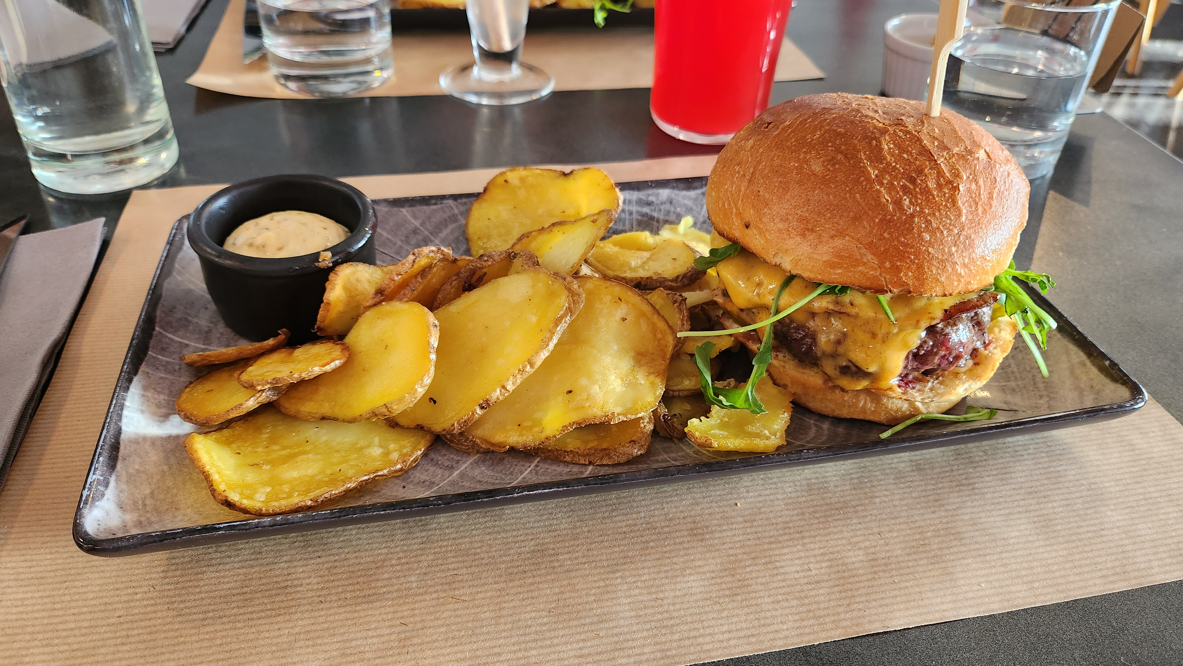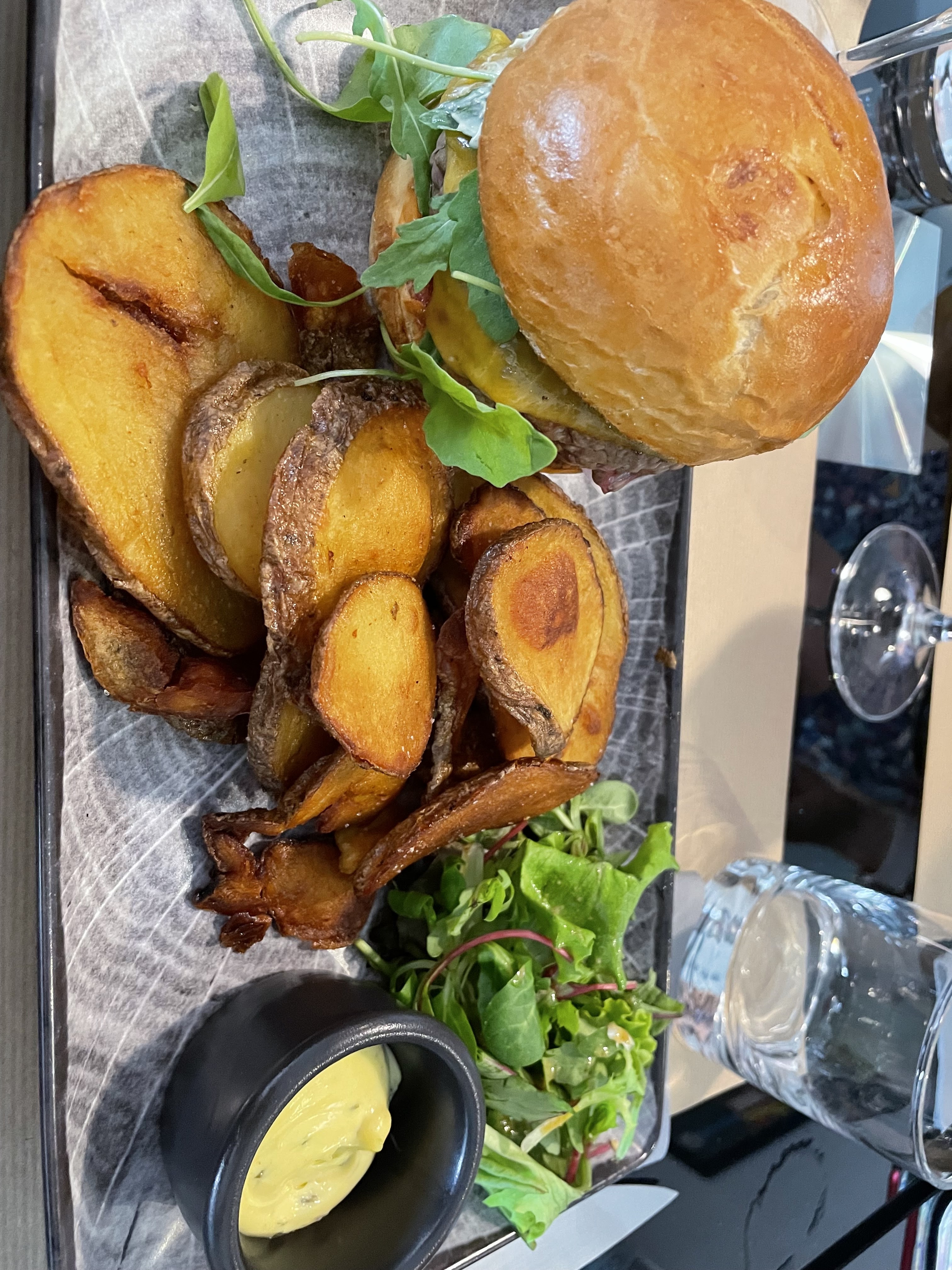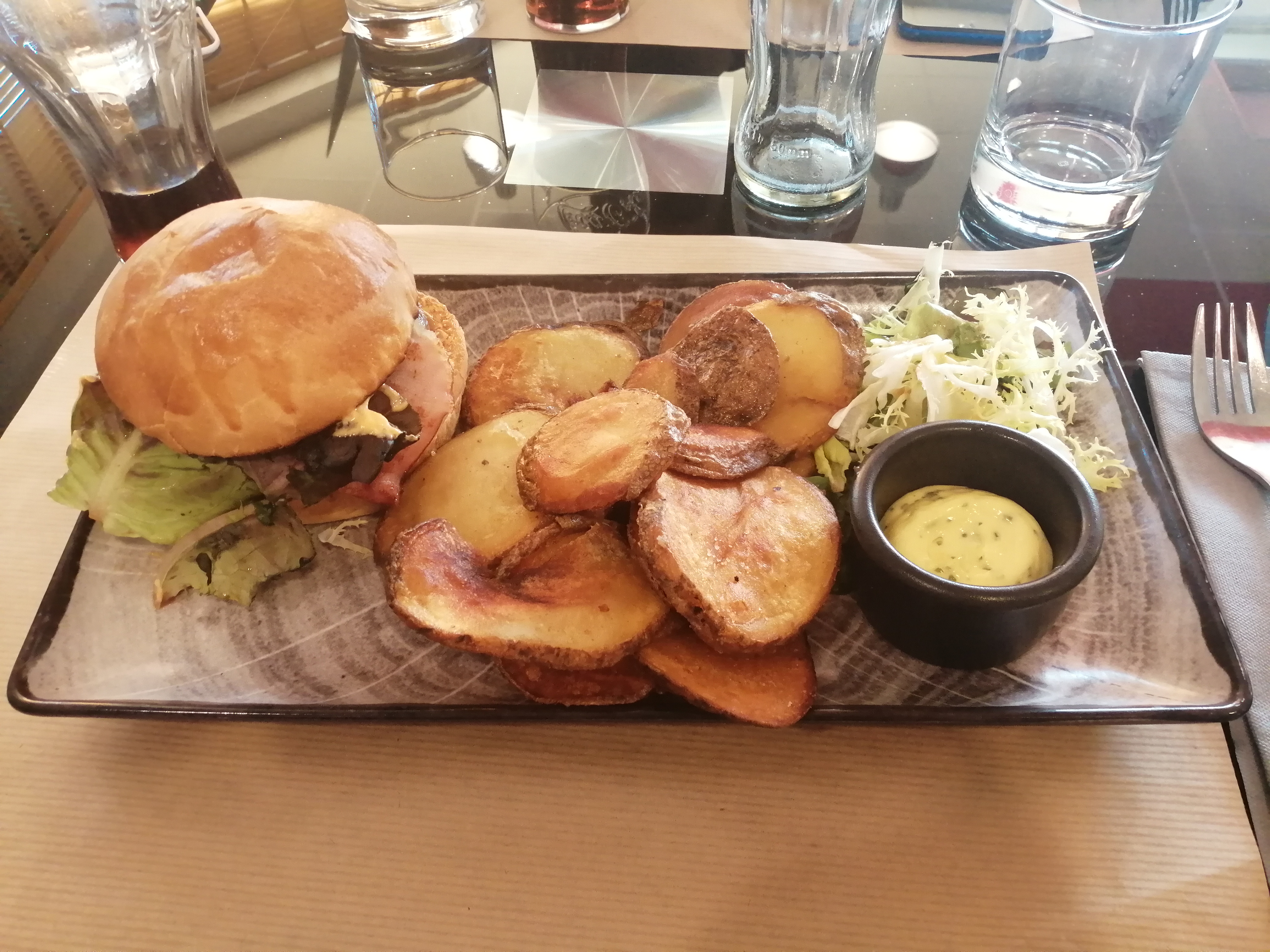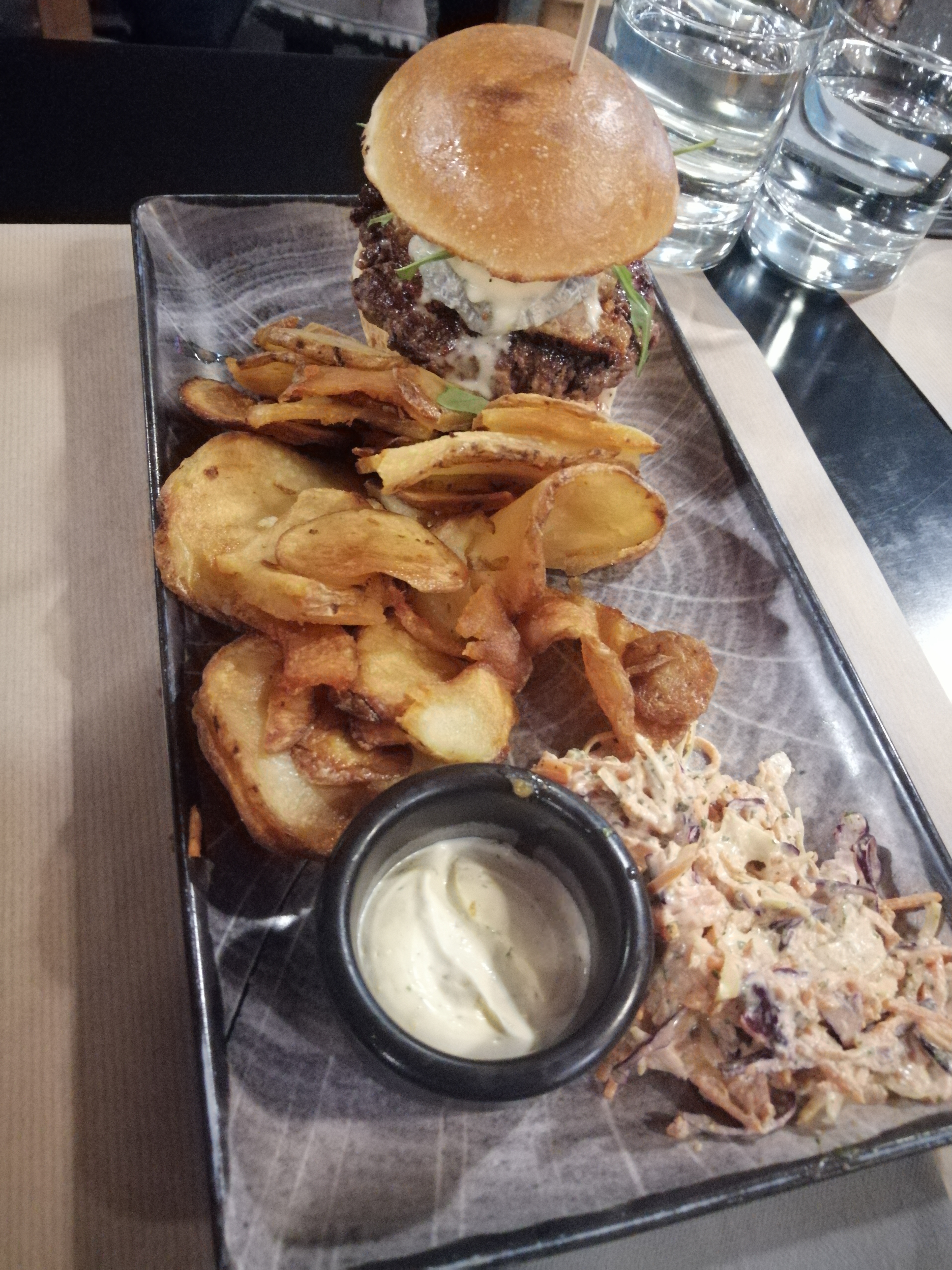 Parfait ! Un burger goûteux et copieux, des pommes de terres façon chips et une sauce à tomber ( seul bémol il n'y en a jamais assez) Je n'ai pas aimé le dessert mousse chocolat cacahuète, mais ça c'est un avis personnel, pas un souci de qualité. Le bun perdu au rhum est à tomber en revanche !