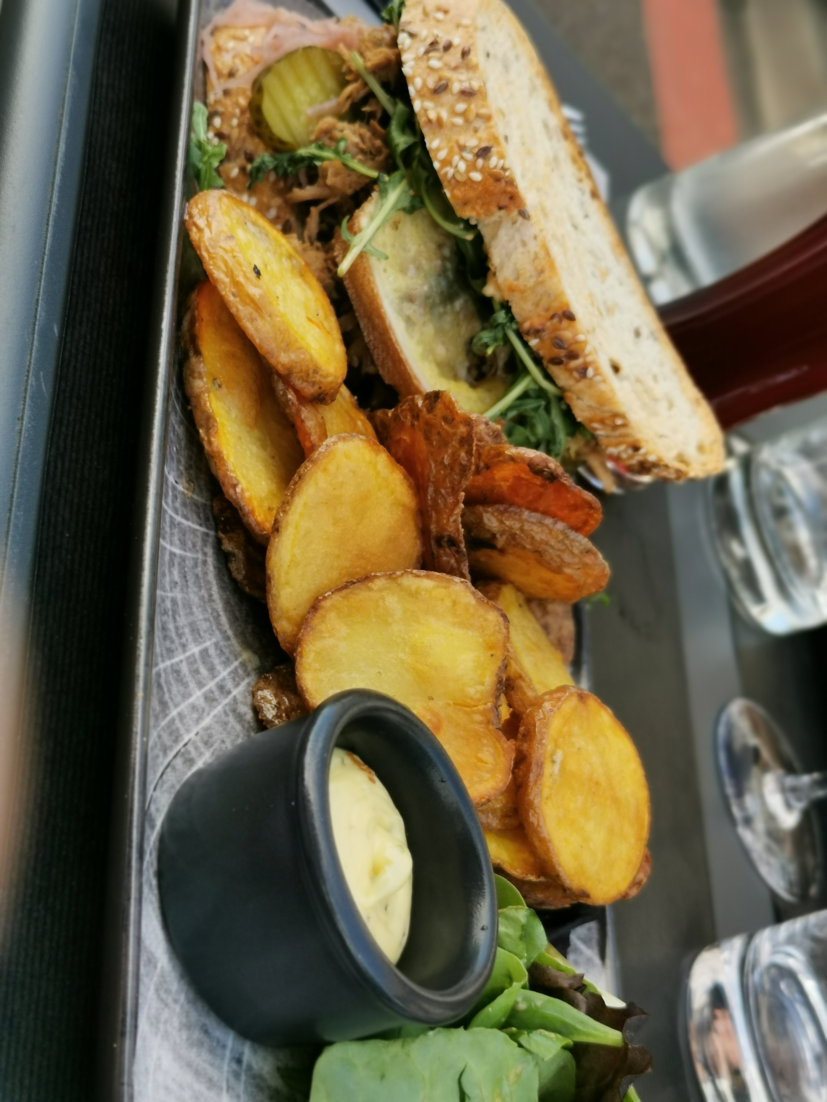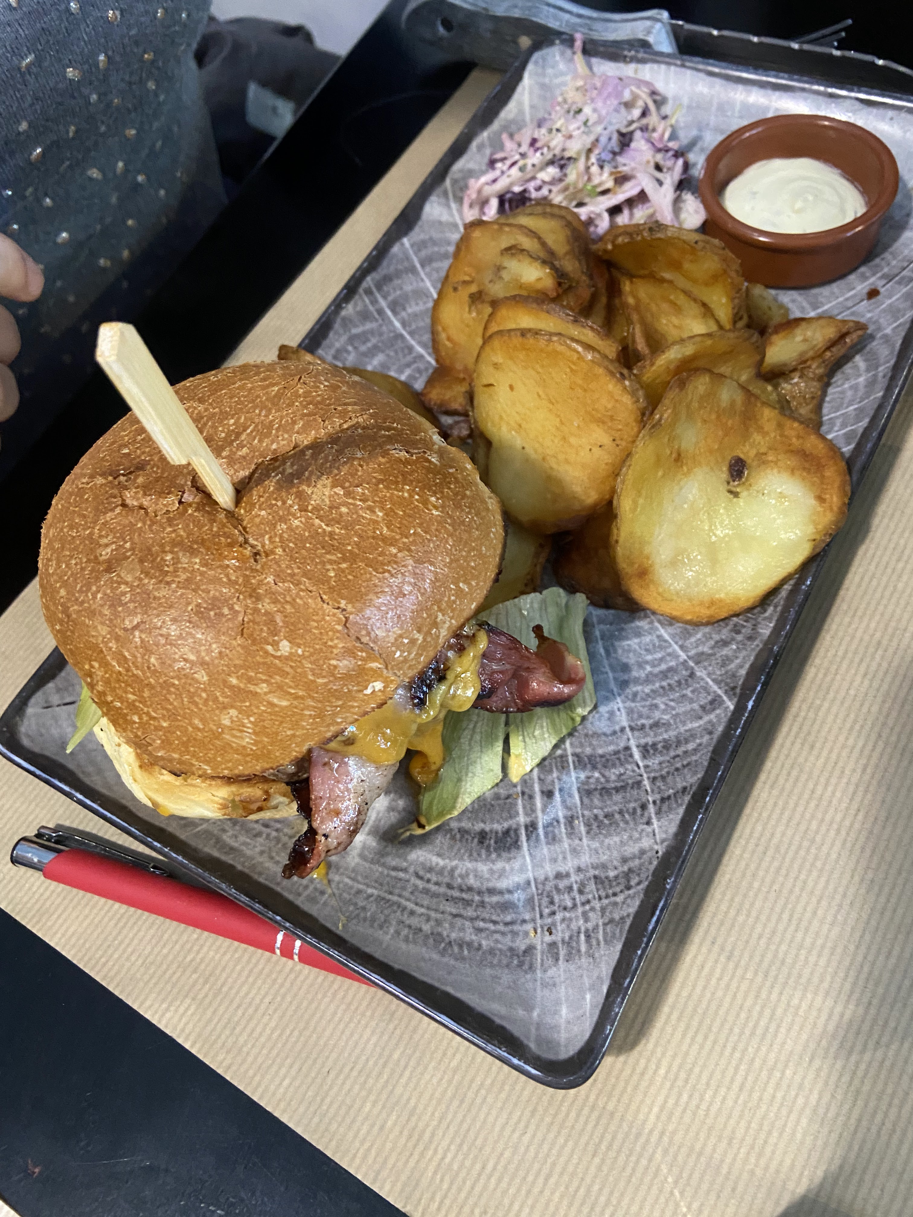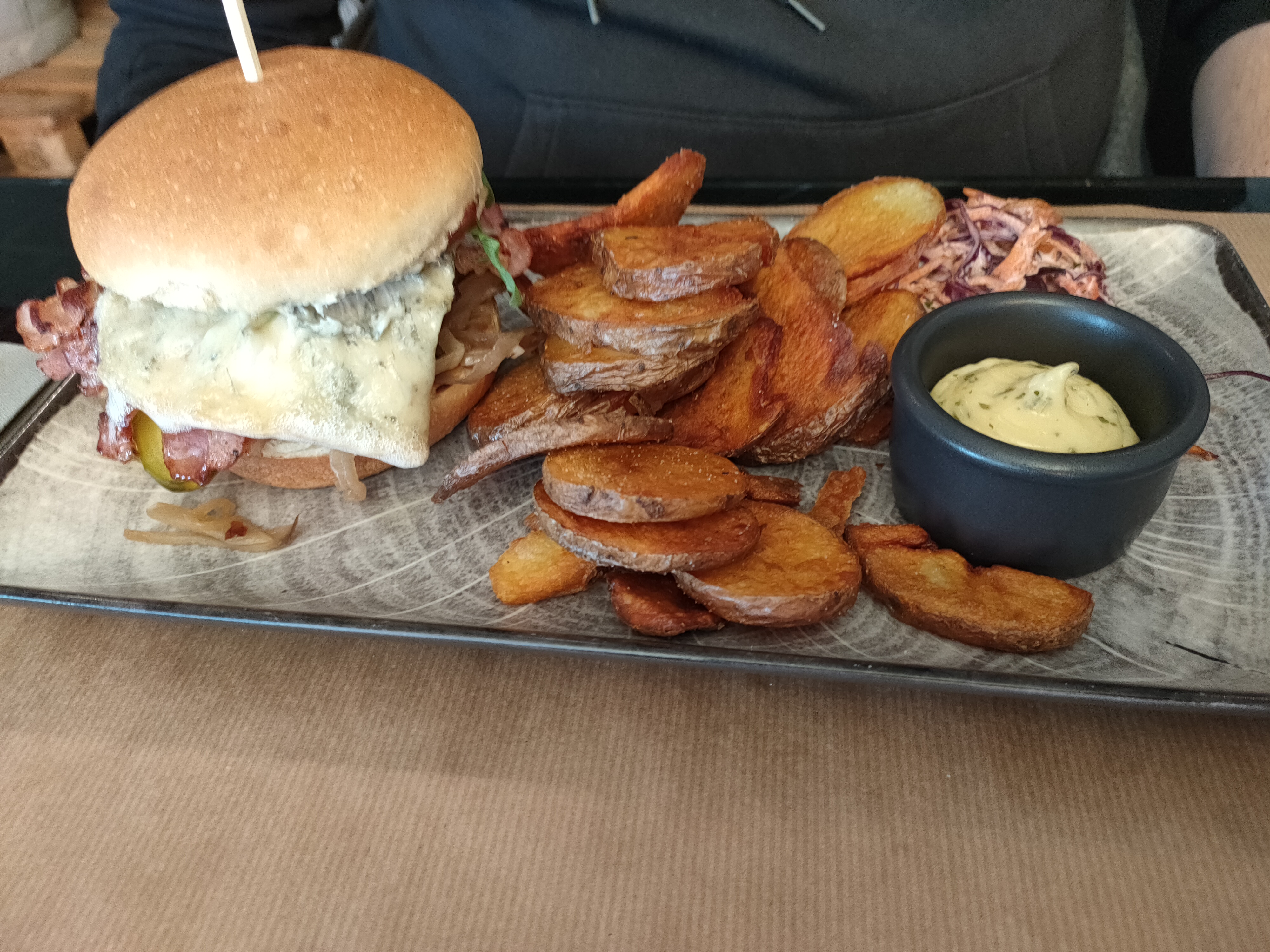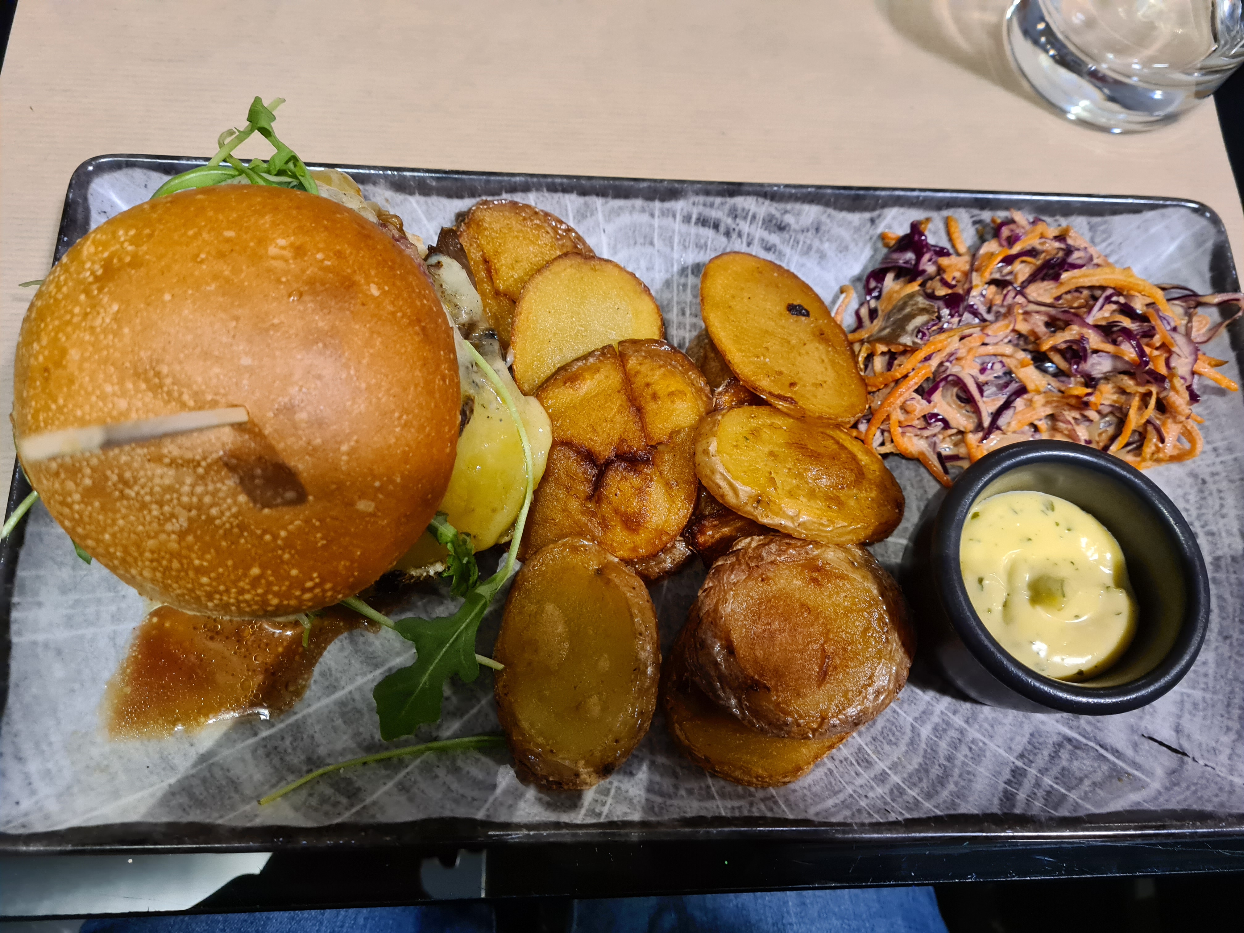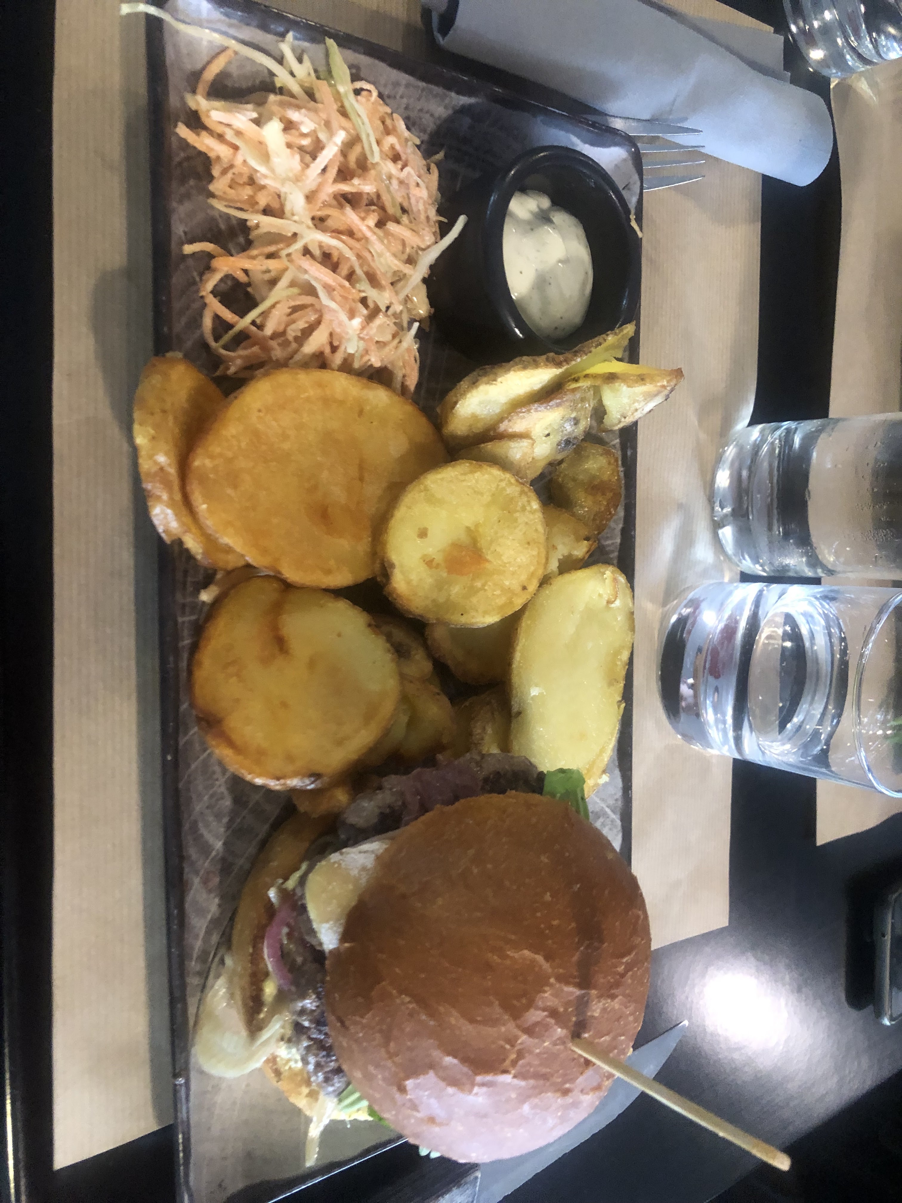 Parfait ! Un burger goûteux et copieux, des pommes de terres façon chips et une sauce à tomber ( seul bémol il n'y en a jamais assez) Je n'ai pas aimé le dessert mousse chocolat cacahuète, mais ça c'est un avis personnel, pas un souci de qualité. Le bun perdu au rhum est à tomber en revanche !