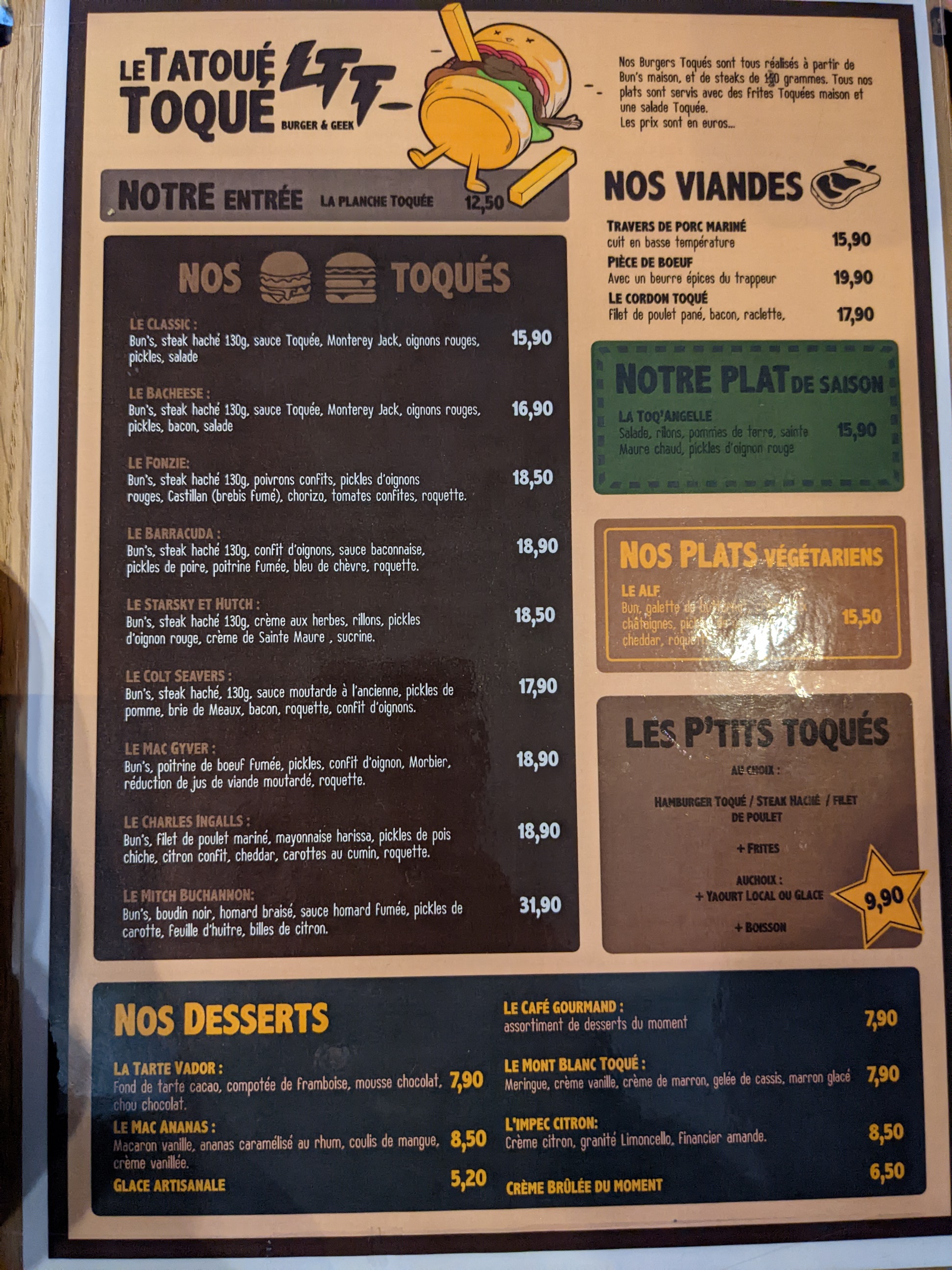 Attention ce n’est plus le tatoué toqué! Beaucoup de gens se trompent comme nous… À part cela, nous sommes quand meme restés et avons goûté aux burgers foie gras qui étaient un peu trop secs à mon goût et les desserts un peu mou, mais tout cela est subjectif bien entendu ! Le service était impeccable, serveuses très agréables et serviables 😊