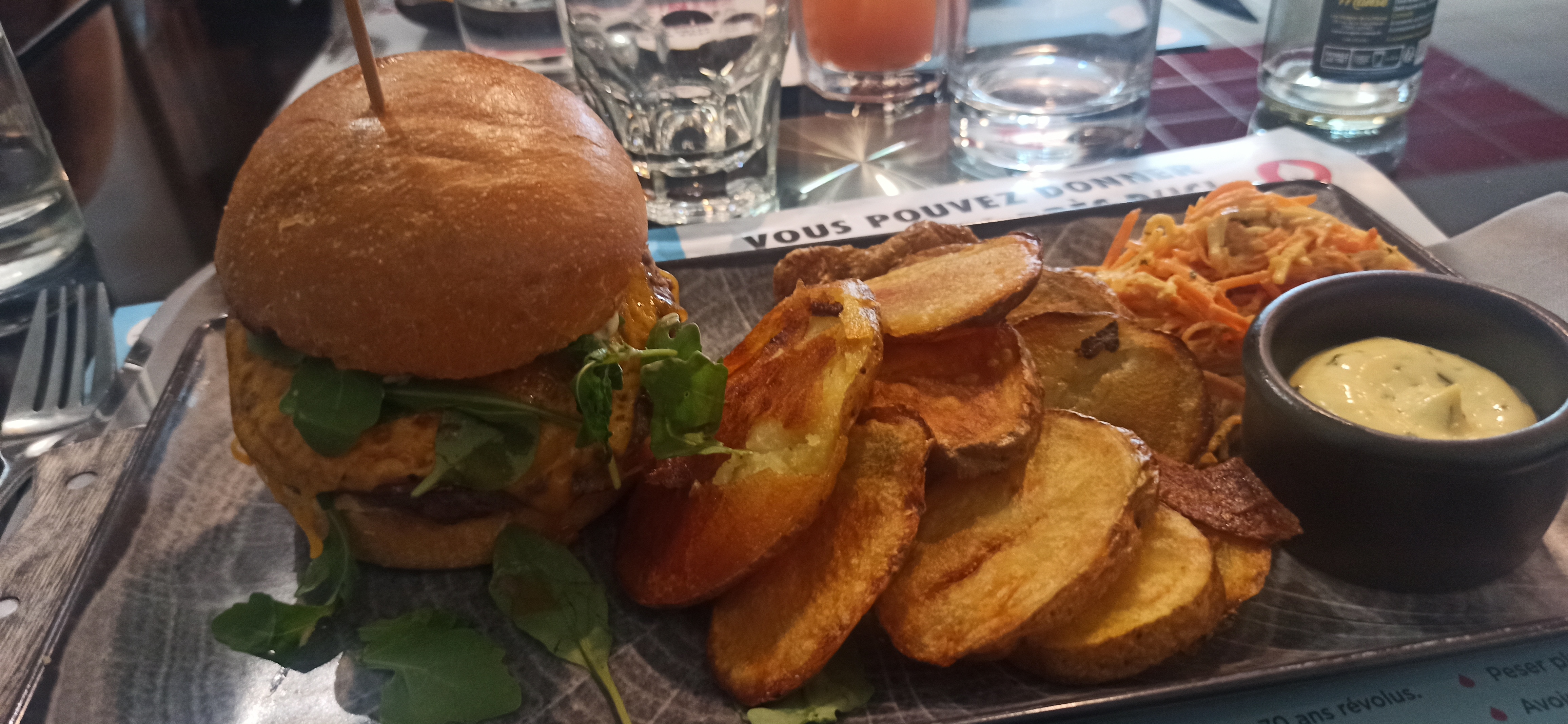 Des burgers excellent ! Les desserts étaient très bon également. On en a pour son argent. Personnel agréable. Une attente tout de même assez longue pour que notre commande soit prise. Il manquait pas mal de choses (rupture) de la carte, c'est dommage. Une remarque sur le fait que je ne prenne pas une boisson alcoolisé assez limite, il serait bien d'évoluer sur ce sujet là. La décoration est sympa. Présence d'un parking. Je recommande !