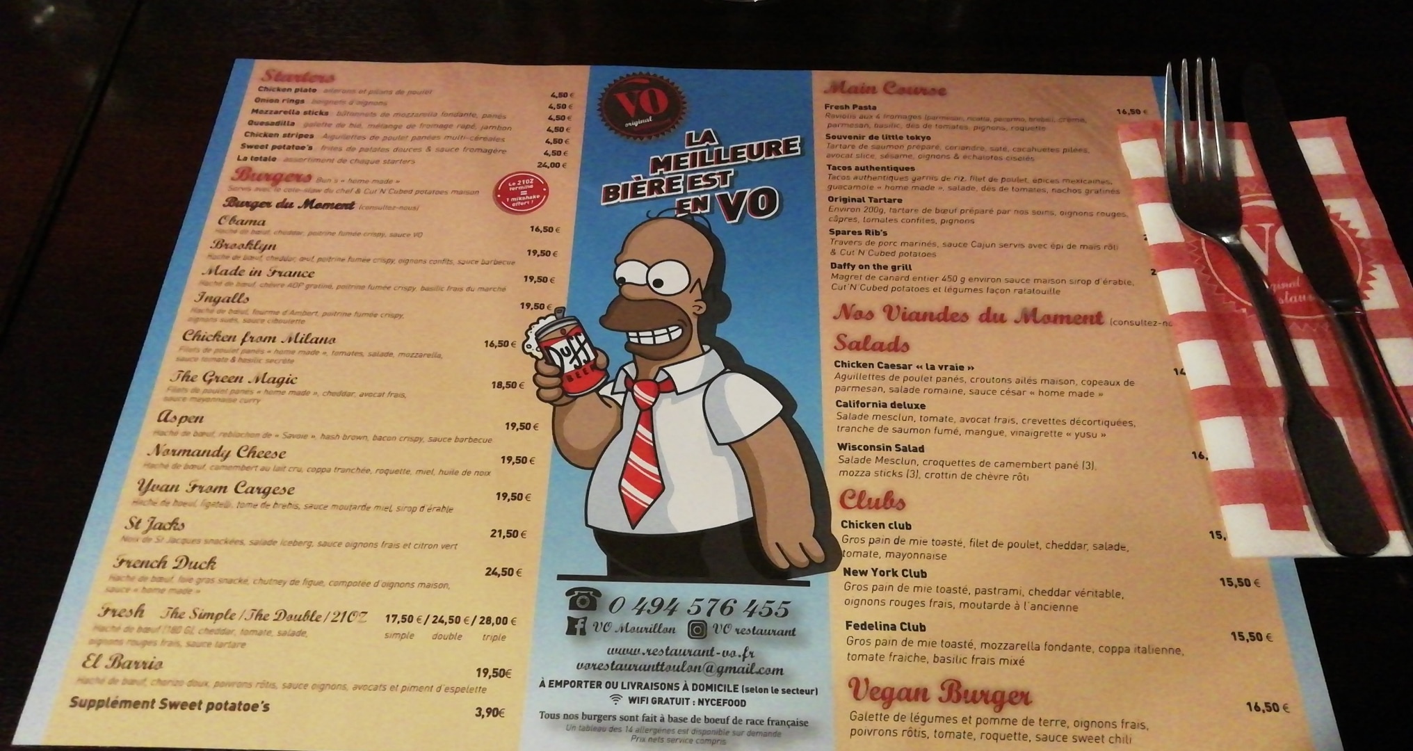 Unique en son genre et incontournable pour les amateurs de burger Toulonnais, seul bémol le prix un peu élevé pour un restaurant de Burger et j’ai enlevé un gros moucheron noyé dans Budweiser Pression mais le bon accueil et le sourire de l’équipe du VO font oublier ces quelques points noir !