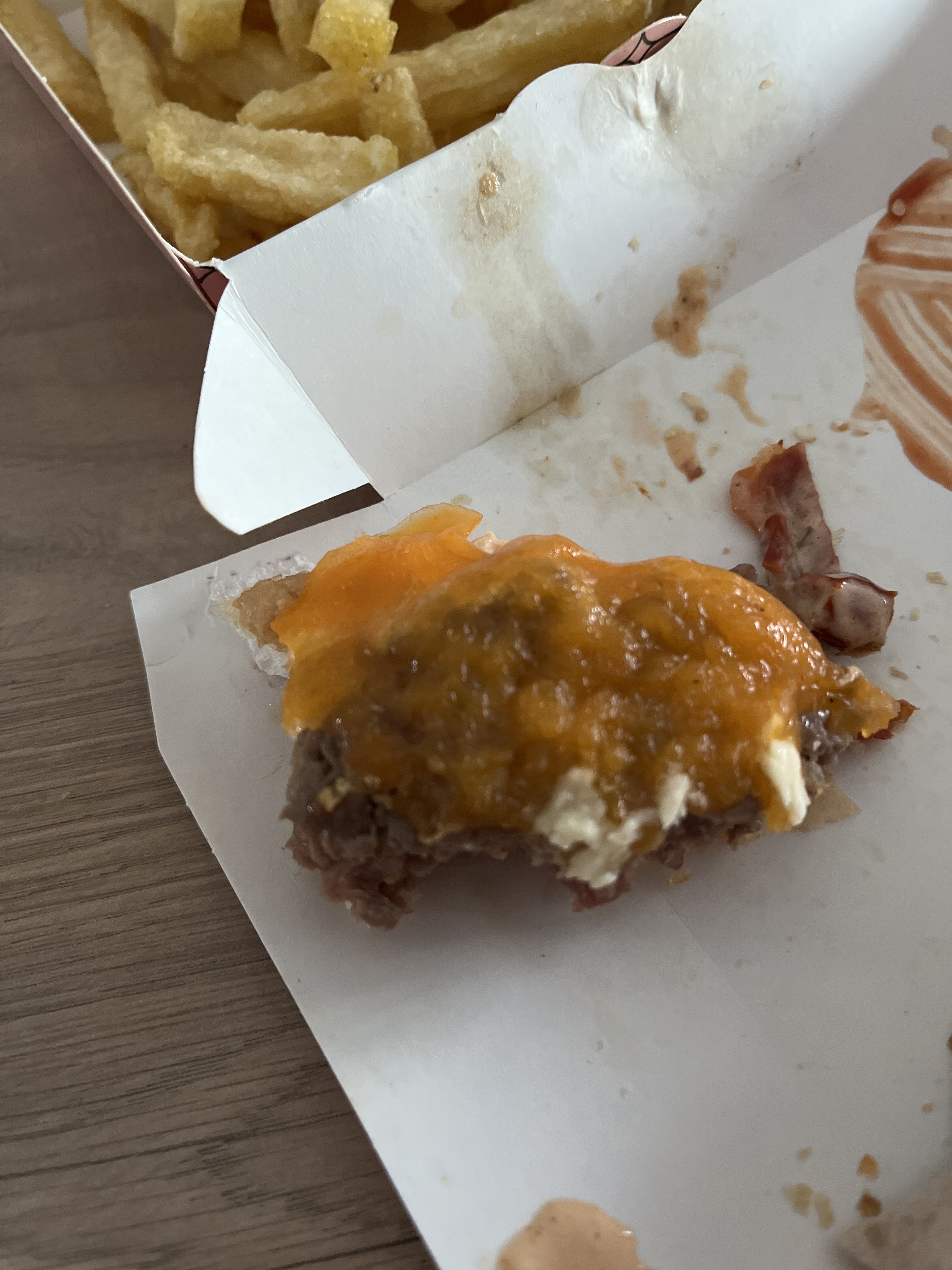Comandé sur Uber Eats, j'ai rarement été aussi déçu par un burger ! Le pain est mou et insipide, sans aucune saveur. Le steak est d'une finesse désespérante, avec pour seul accompagnement trois cornichons sans intérêt. Quant aux frites, elles sont sèches, clairement loin de ce qu'on attend d'une bonne expérience de burger. Franchement, vu le prix, on se sent arnaqué. À fuir