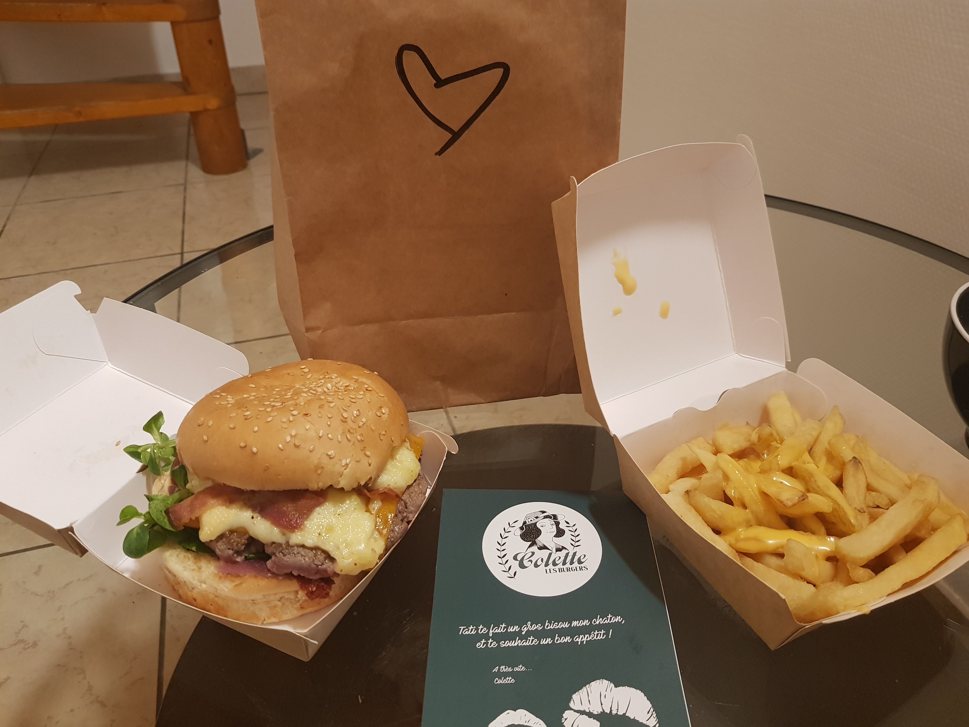 J'ai pris un burger Colette, Plutôt pas mal. La viande est bonne et on peut choisir la cuisson. Je voulais min steak saignant et c'était cuit comme il faut. Par contre les frites archi cuites, à la limite du cramé, et donc amères en bouches et ramollos. Sans doute parceque je me suis fait livré. De plus pas fan du fromage fondu sur les frites, trop gras à mon goût. Mais c'est apparemment à la mode dans tous les burgers aujourd'hui. Rien ne vaut la moutarde Mayo !