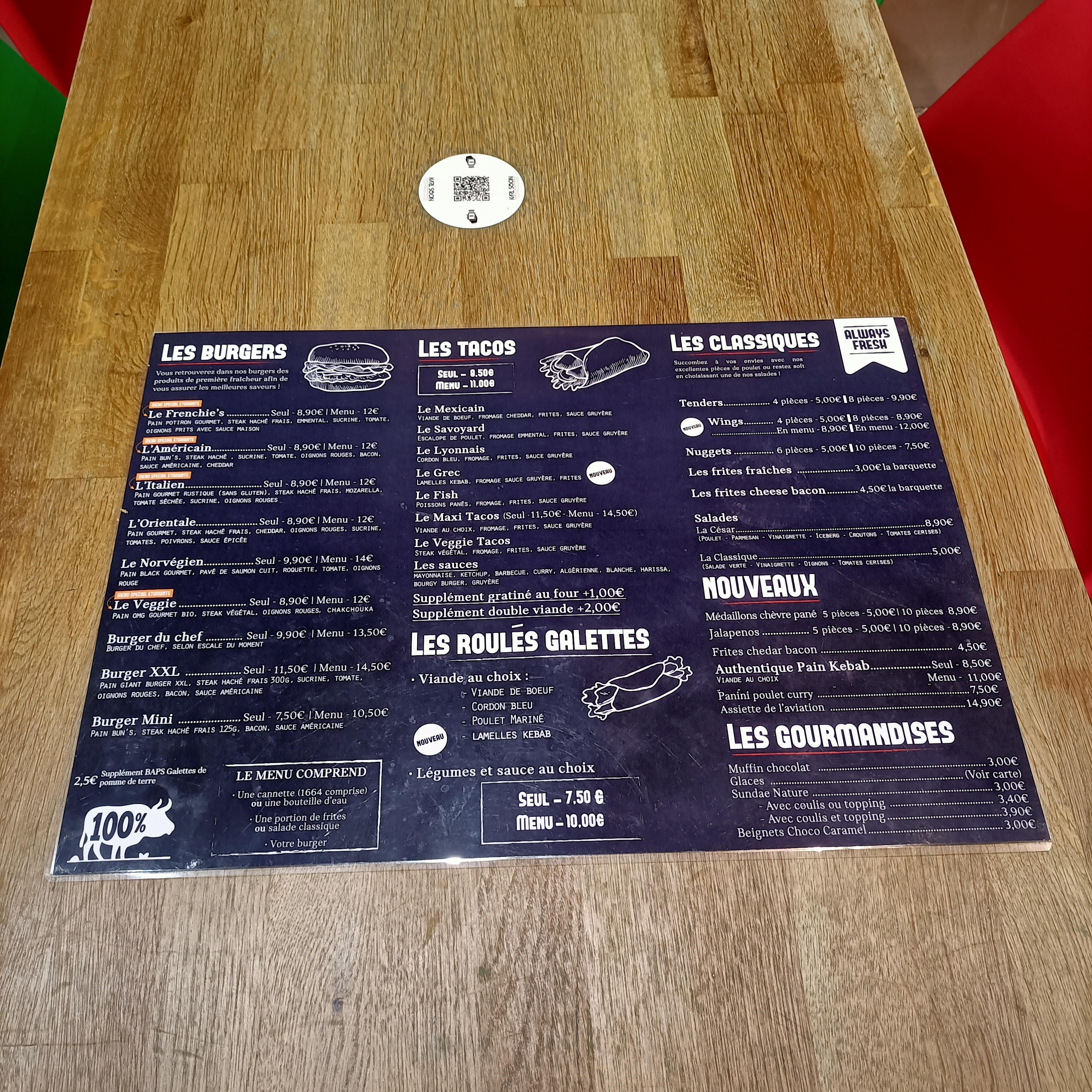 Cela fait 2 ans que j'y vais 2-3 fois par mois Et je vois la différence au niveau tarif qui a augmenté considérablement .on arrive maintenant à un menu à 12€ pour un menus tacos Cela dit les burgers sont très bons et les frites sont fraîches mais les vendre à 3,50 € la petite barquette je trouve ça quand même abusé
