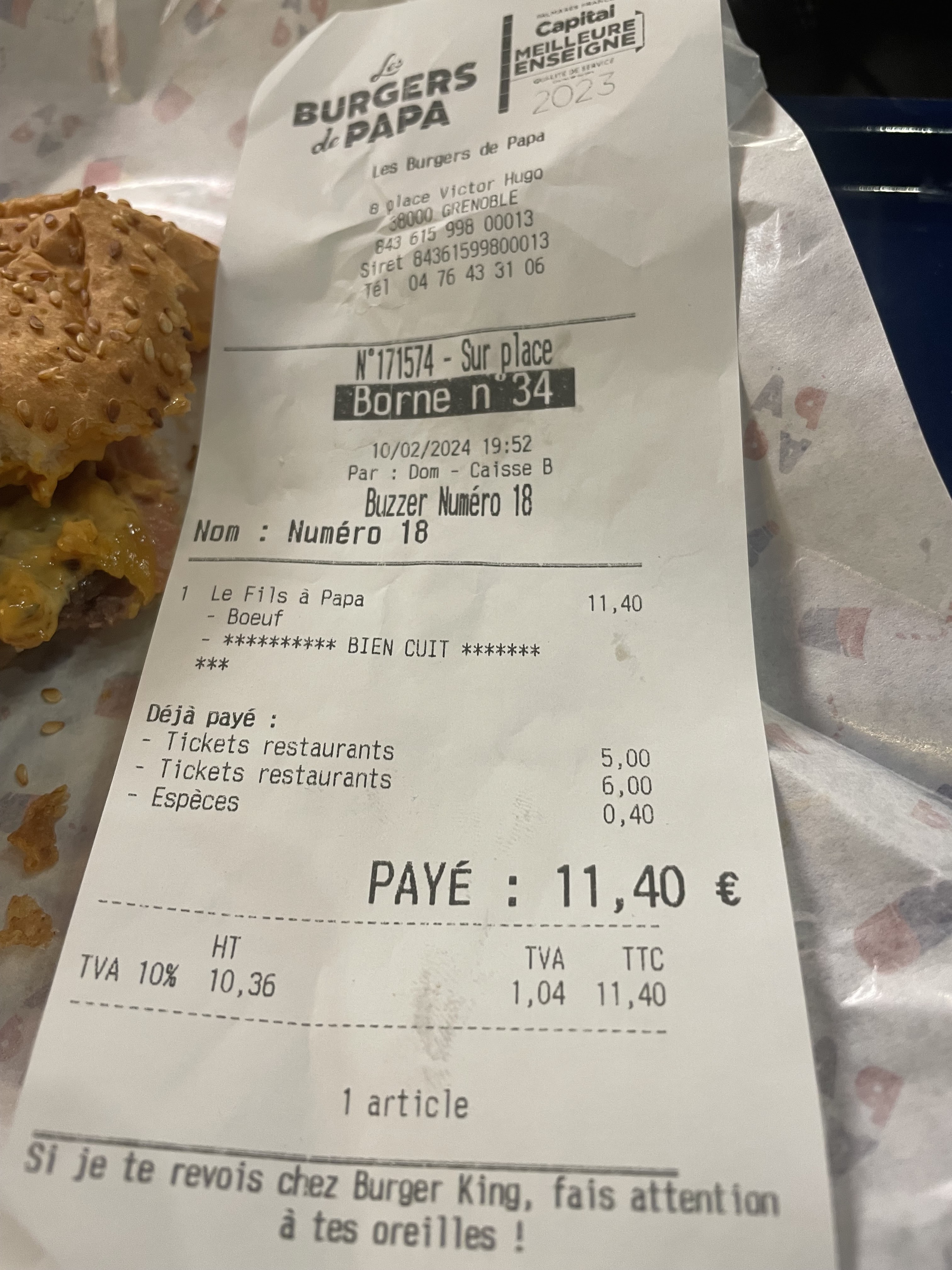 Toutes nos excuses pour cette mauvaise expérience. Je vous invite a venir manger un Burger a notre restaurant. Il suffit de vous présenter à l'acueil et donner votre nom, je vous offre le burgers de votre choix. Merci de me dire quel jour vous souhaitez passez en nous contactant sur le mail: [email protected] L'équipe Les Burgers de Papa Grenoble