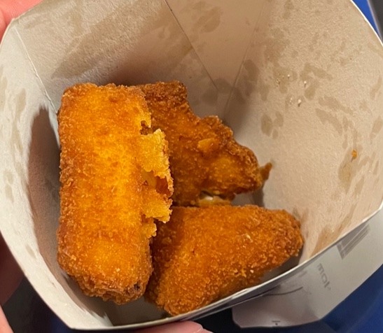 Frite froide avec sauce gelée, on a demandé de les refaires chauffer elles sont revenu froide ! Nuggets,correct Burger ,bon mais manque de garniture Je m attendais à mieux que Burger King mais on y ai pas