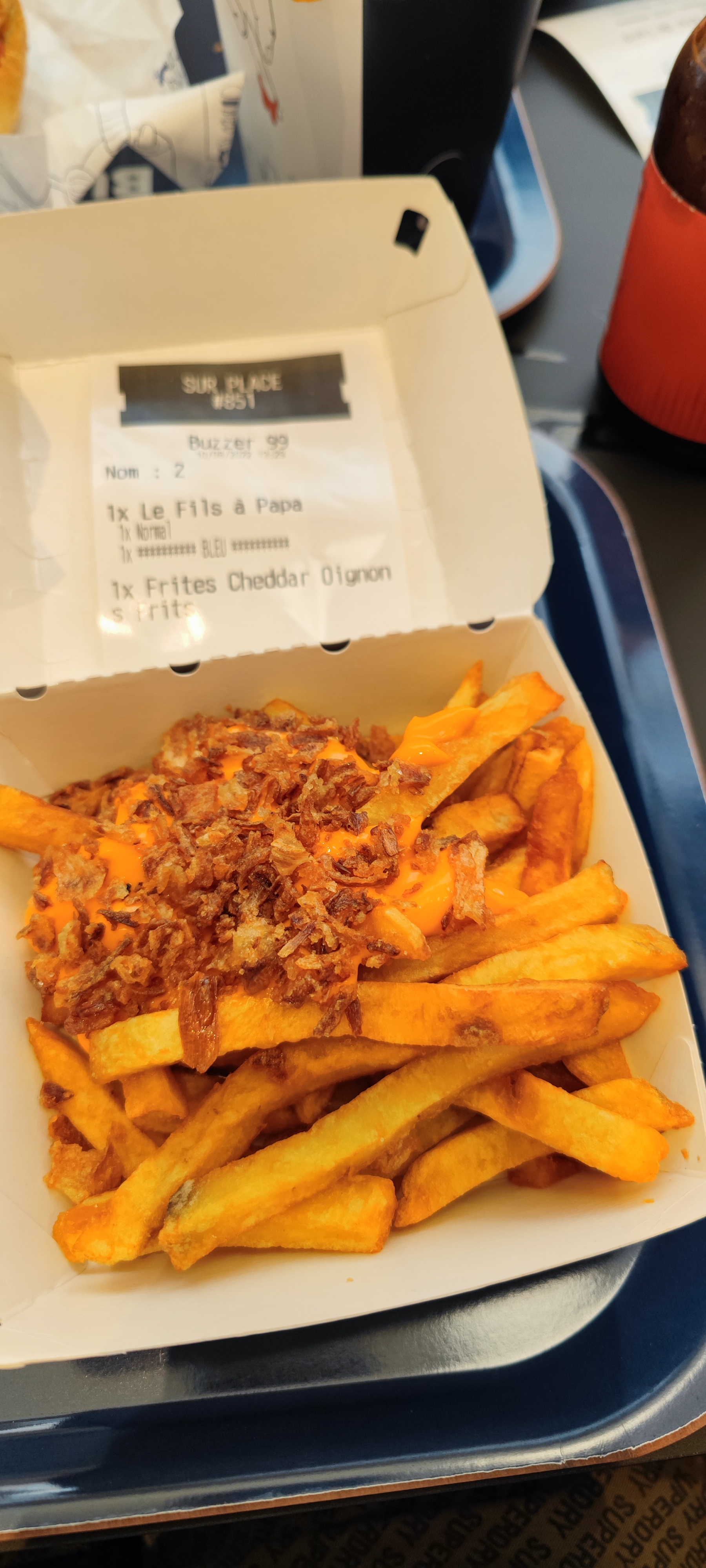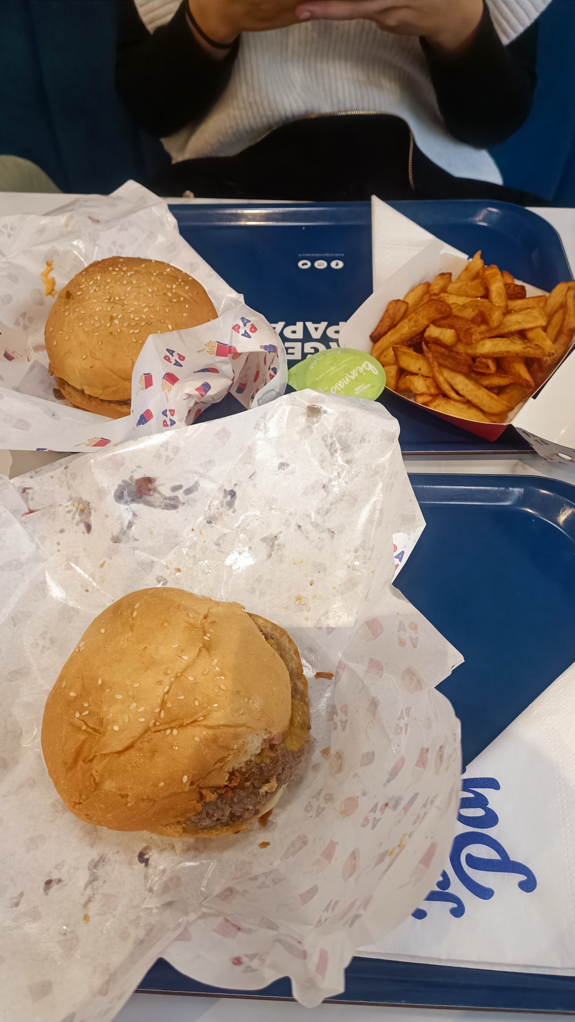 Service très rapide et très serviable malgré le rush, les frites et le burger étaient très bons. Toutefois ce snack porte bien son nom les burger de papa on voit bien que papa a tapé dedans après avoir été chercher le lait. J'ai pris le grand papa qui était en effet grand pour un nain le daron.