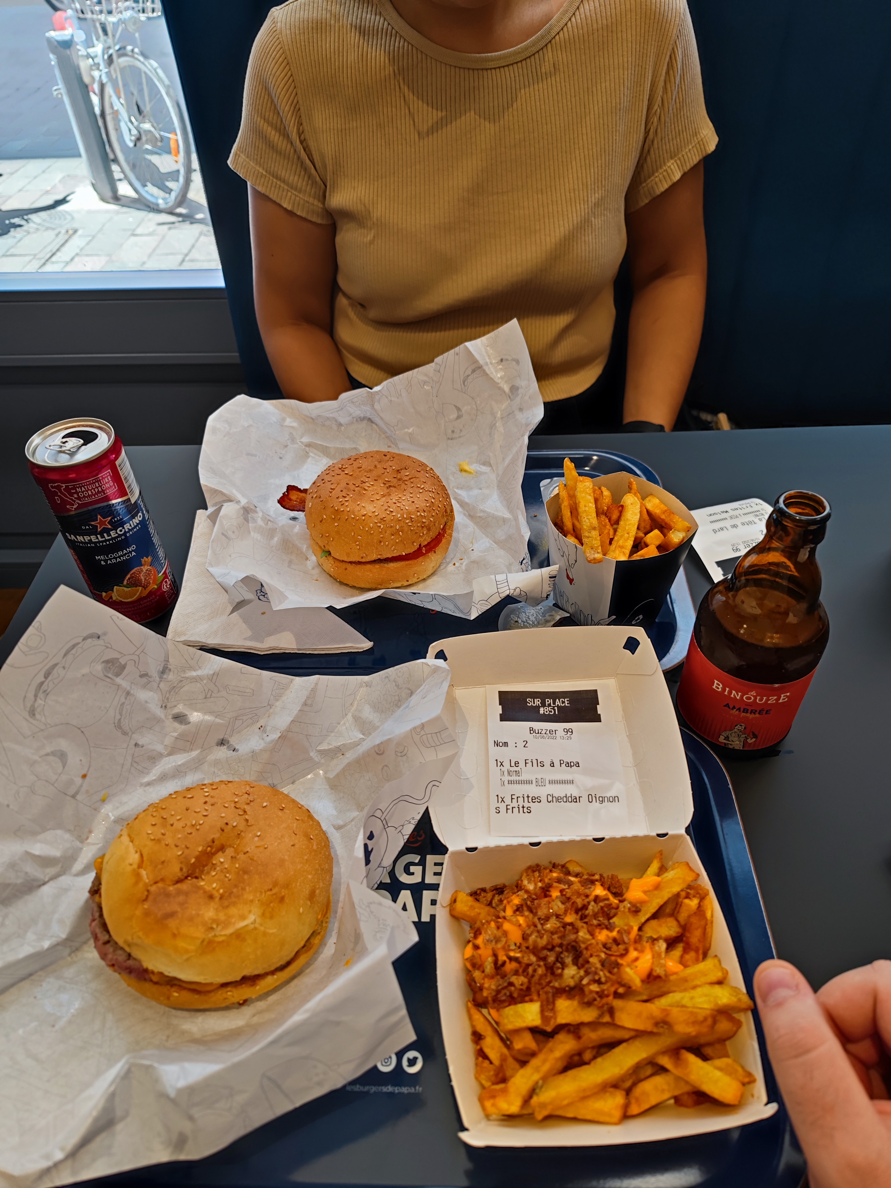 Nous venons de manger aux burgers de papa et nous nous sommes vraiment régalés. Les burgers sont délicieusement garnis dans un pain tendre. On apprécie la viande du boucher a l'intérieur. Nous avons aimes la bière et les nuggets. Et pour les frites, j'ai adoré, car ceux sont de vraies frites maison comme la Ch'ti que je suis les aime. Papa, c'est de la qualité, et la qualité, c'est ce que j'aime !