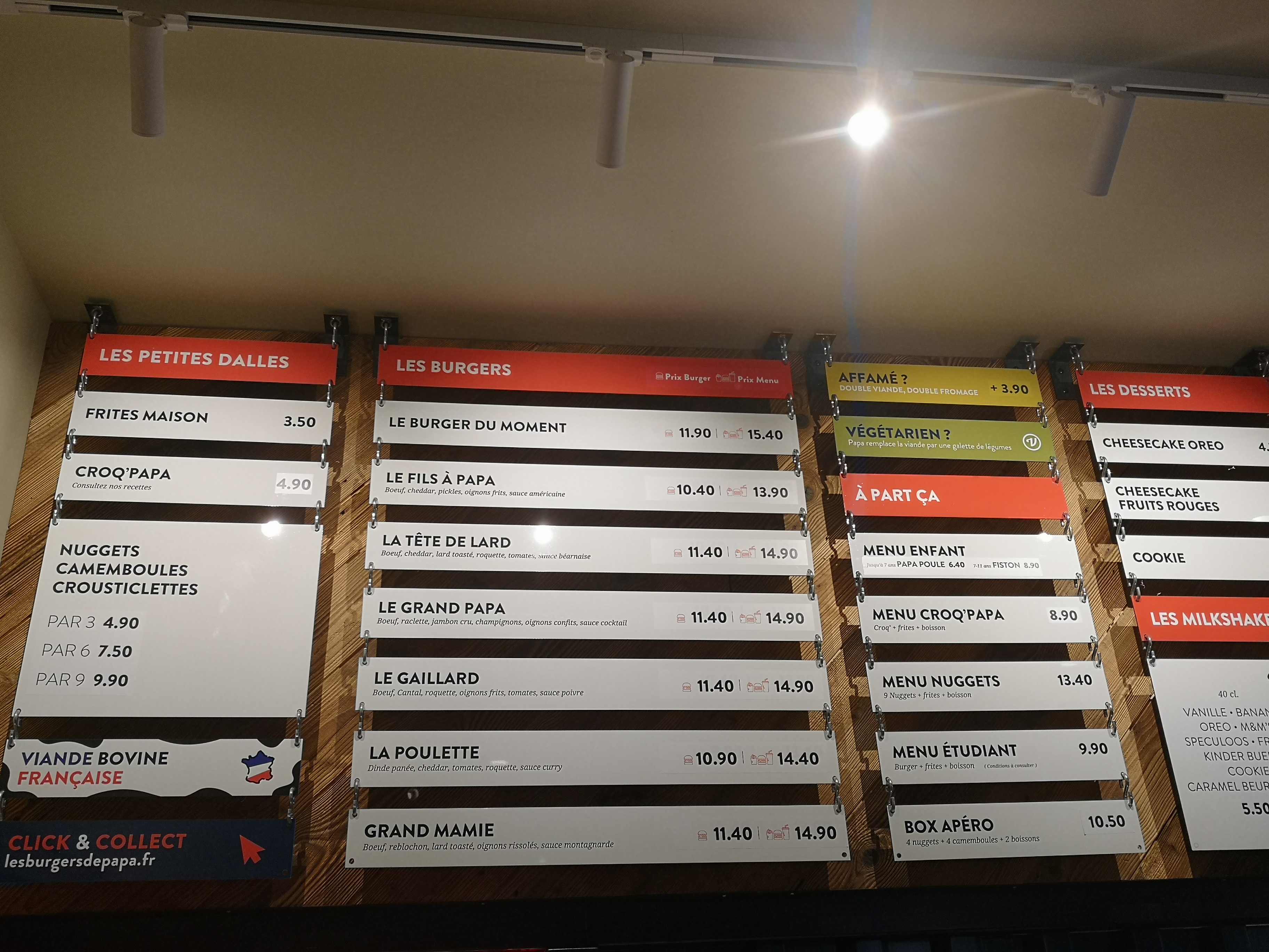 Les prix sont attractifs : j'ai pris un menu ''Fils à papa'' qui est à 13,40 euros (mais qui passe à 9,90 euros avec la carte étudiante). Les portions sont généreuses, les frites très bonnes (maison), le burger était bon mais le pain trop sec malheureusement (le seul point négatif du repas, mais le pain c'est la base dans un burger).