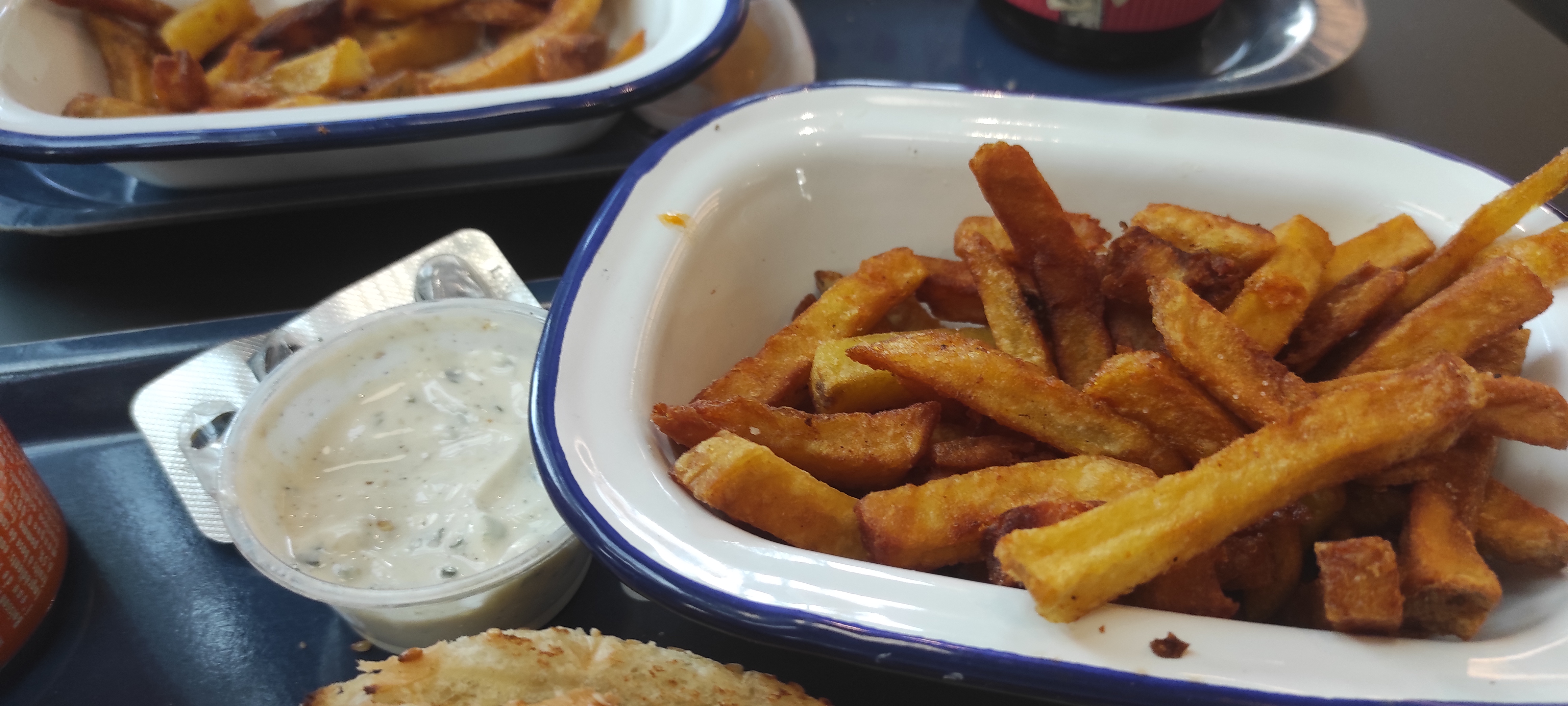 Frites peu goûteuses et sèches. Allo,nous cherchons le petit steak trop cuit qui a certainement réduit à la cuisson.Oui oui, on peut avoir des bons produits frais et locaux sans savoir bien les cuisiner. Dommage les photos et publicités étaient alléchantes et généreuses mais pas conforme à la réalité !Rapport qualité prix à revoir 20 euros un menu hamburger à composer avec 1 steak...3 convives venus ,biens déçus et surtout pas repus! On s'est nourri du cadre et paysage très reposant et calme et des sourires du jeunes personnels au comptoir.