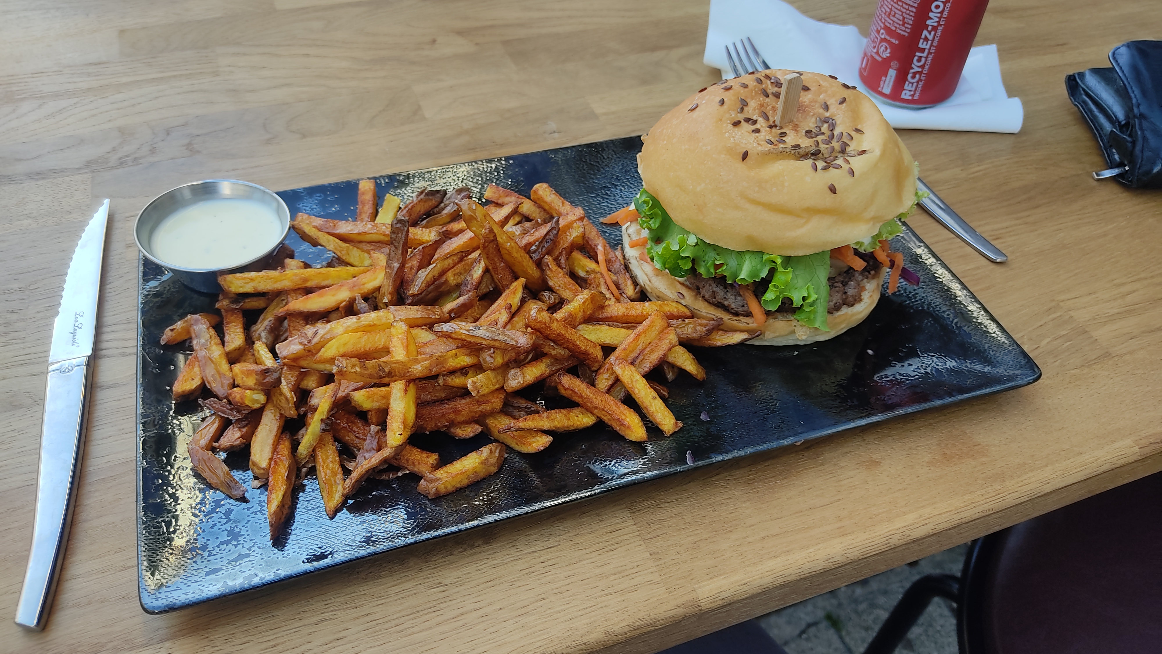 Nous n’avons pas eu l’occasion de goûter ces magnifiques burgers, mais l’accueil est très chaleureux et la bonne humeur au rendez vous ! Nous avons été reçu à la table du resto pour manger notre propre repas, puisque les cuisines du restaurant étaient fermées (pour cause il était presque 15h). Mais nous avons quand même eu droit à un service généreux de boissons, couverts, cafés…et tout ce dont nous avions besoin 👌 Nous avons hâtes de repasser dans le coin pour déguster ces burgers !