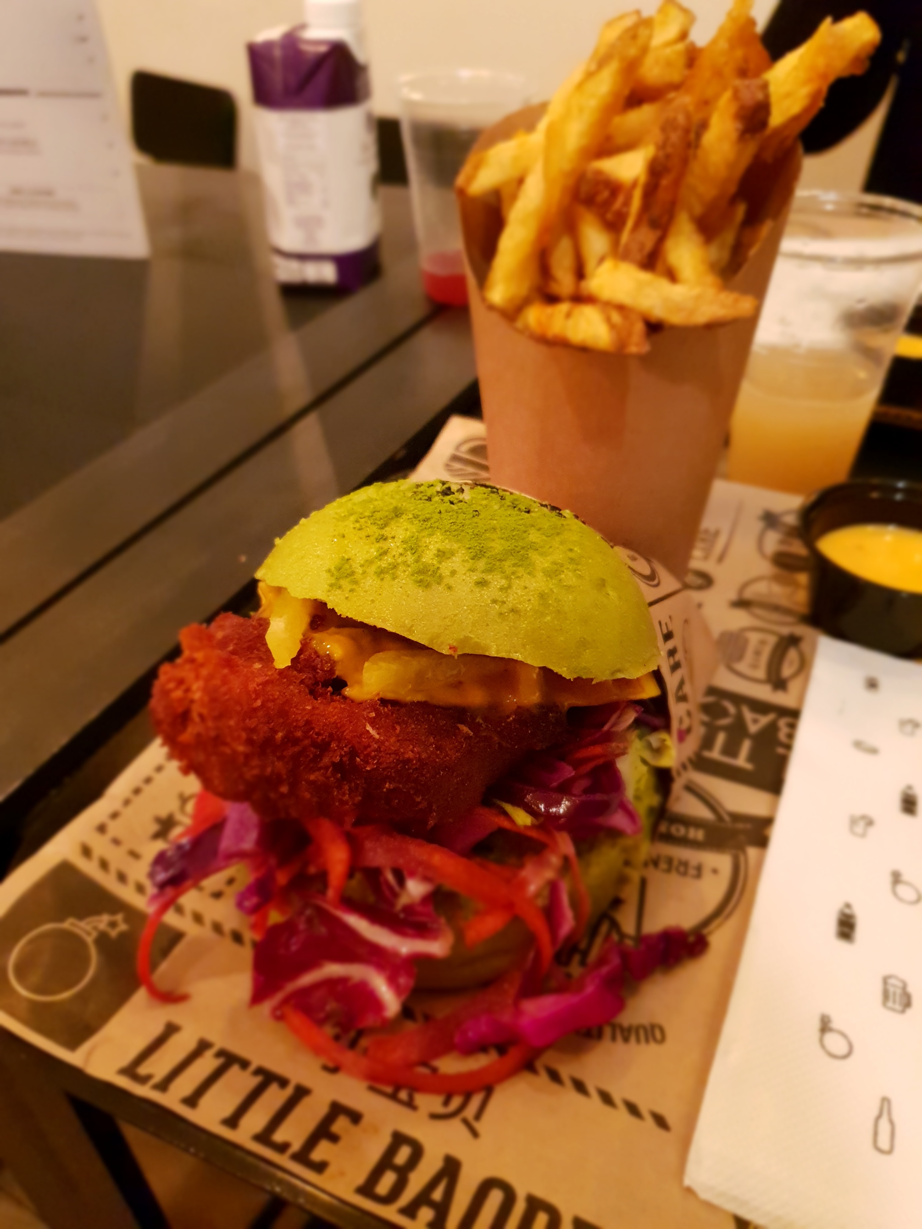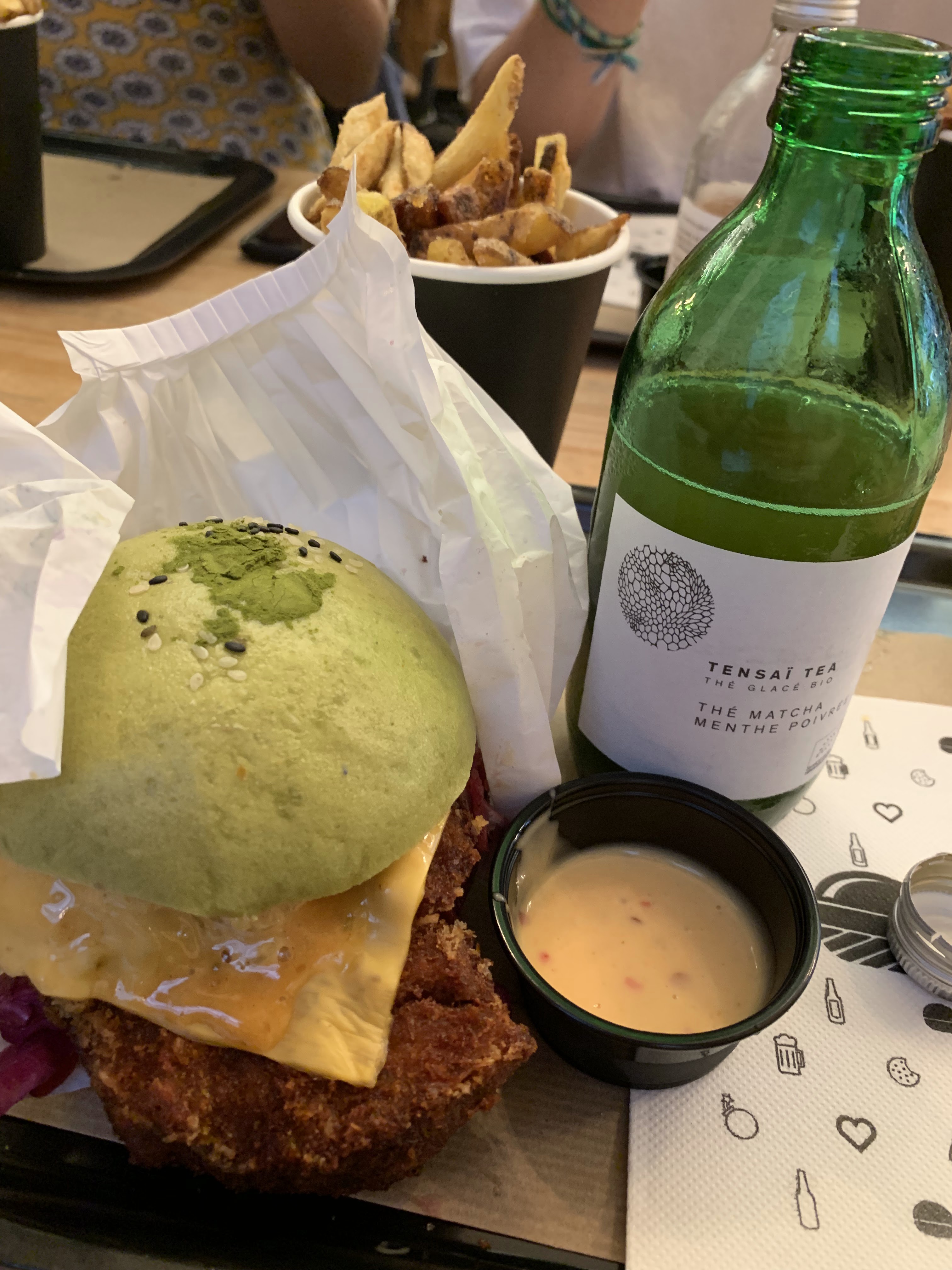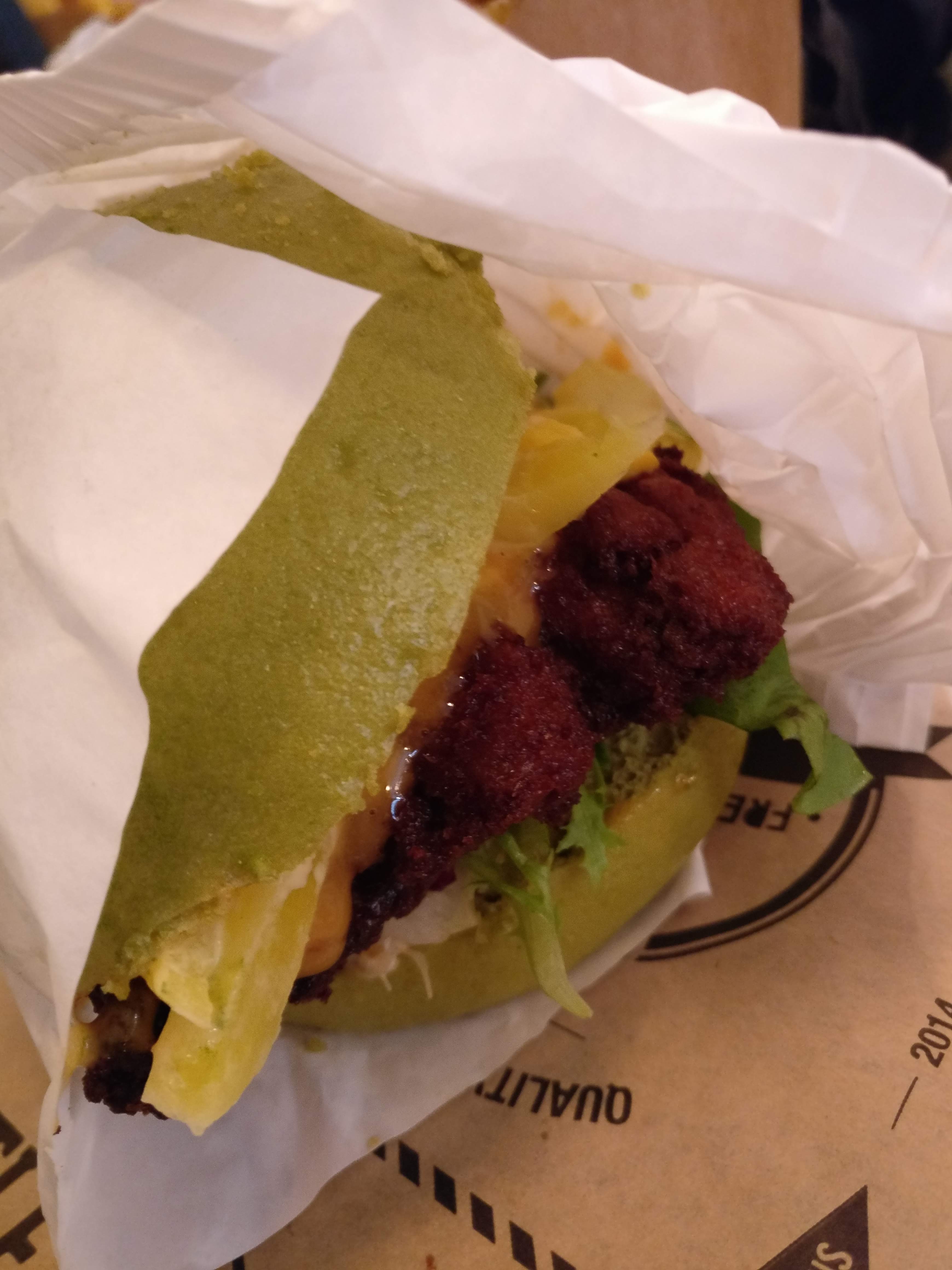 Un burger différent, au matcha mélange sucré/salé intéressant et qui cale bien.