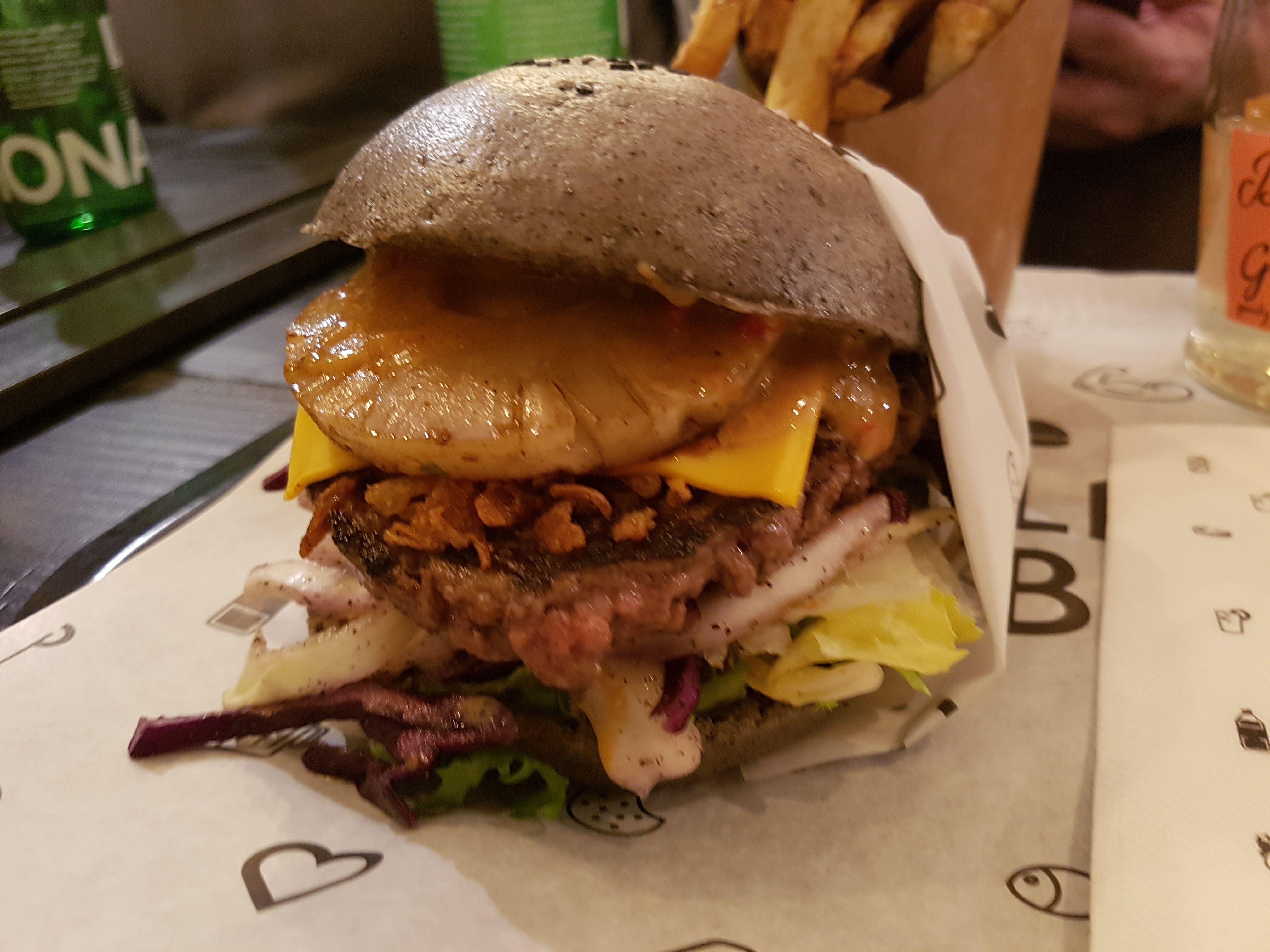 Dans l'ensemble ça allait mais les frites sont vraiment à revoir, elles sont certes maison mais la qualité reste déplorable l’huile utilisée doit être de mauvaise qualité et en plus de ça elles étaient froides. Le burger est ok c'est assez original. Mais le prix n'est clairement pas justifié (15 balles) alors que au final ça reste un simple burger avec des frites.