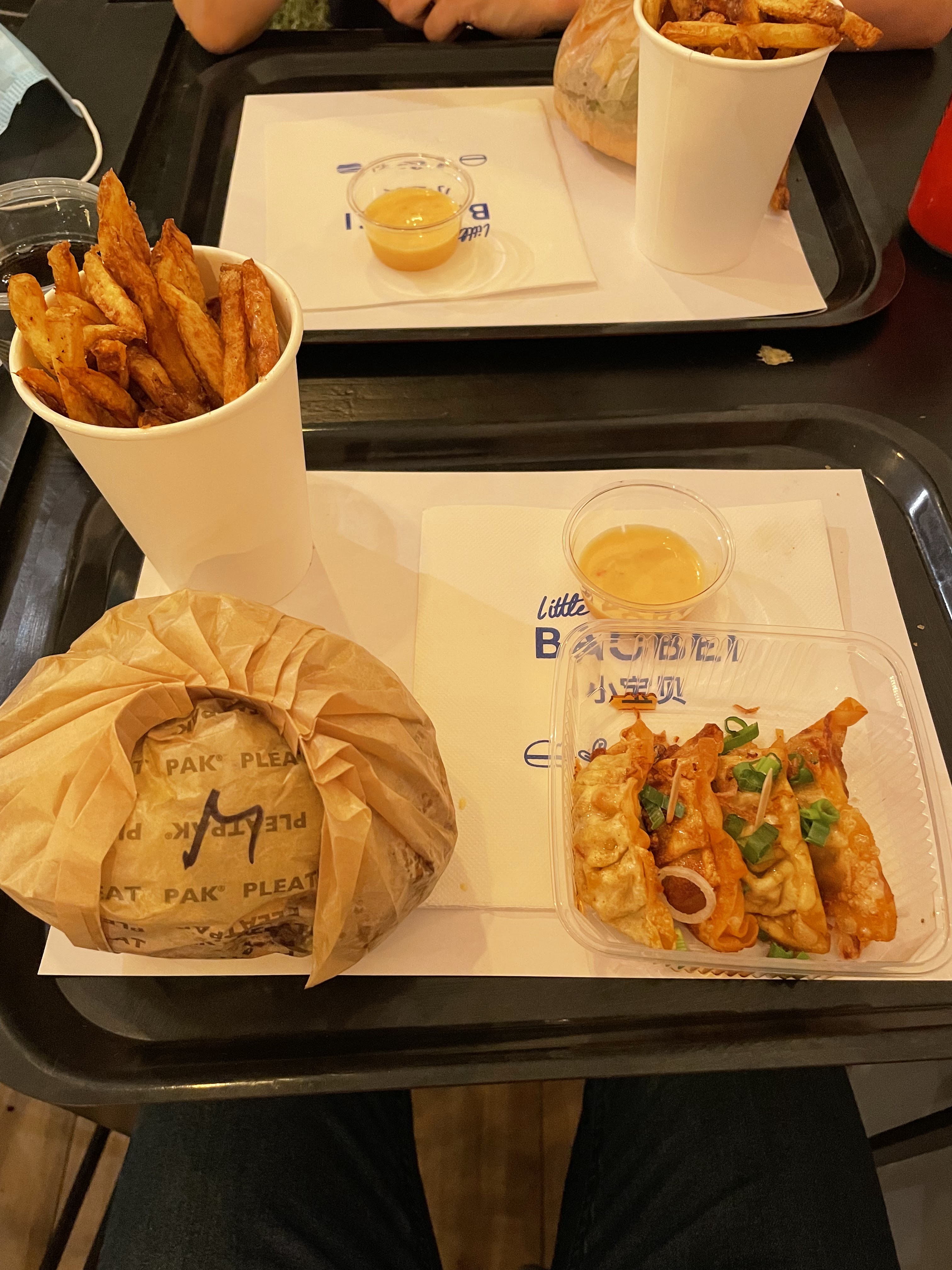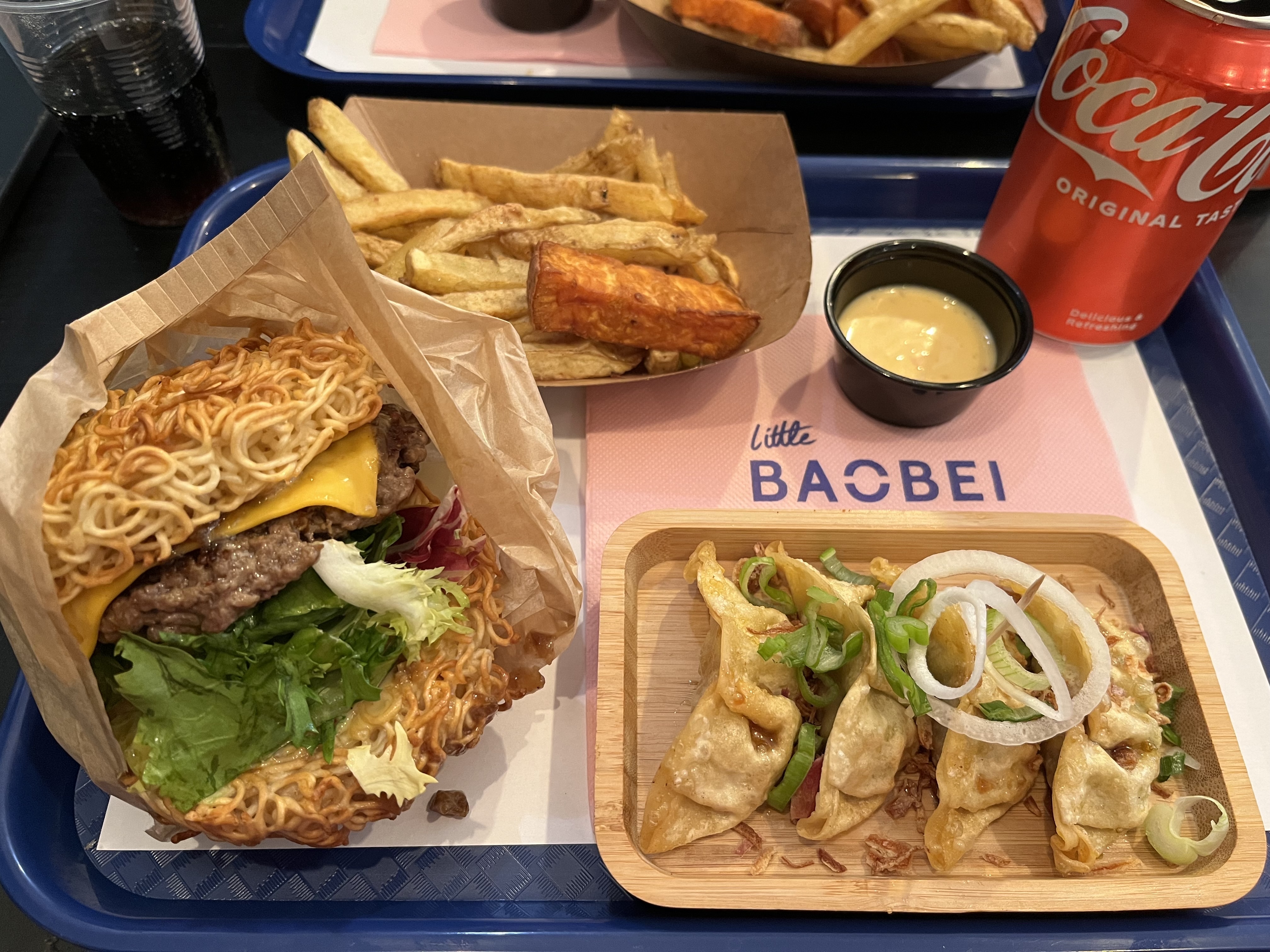 Concept génial, dur de faire le choix entre les nouilles et les bao ! Gyozas excellent ! Le mélange frite classique et patate douce est fabuleux ! Et le poulet frit aussi..🥹