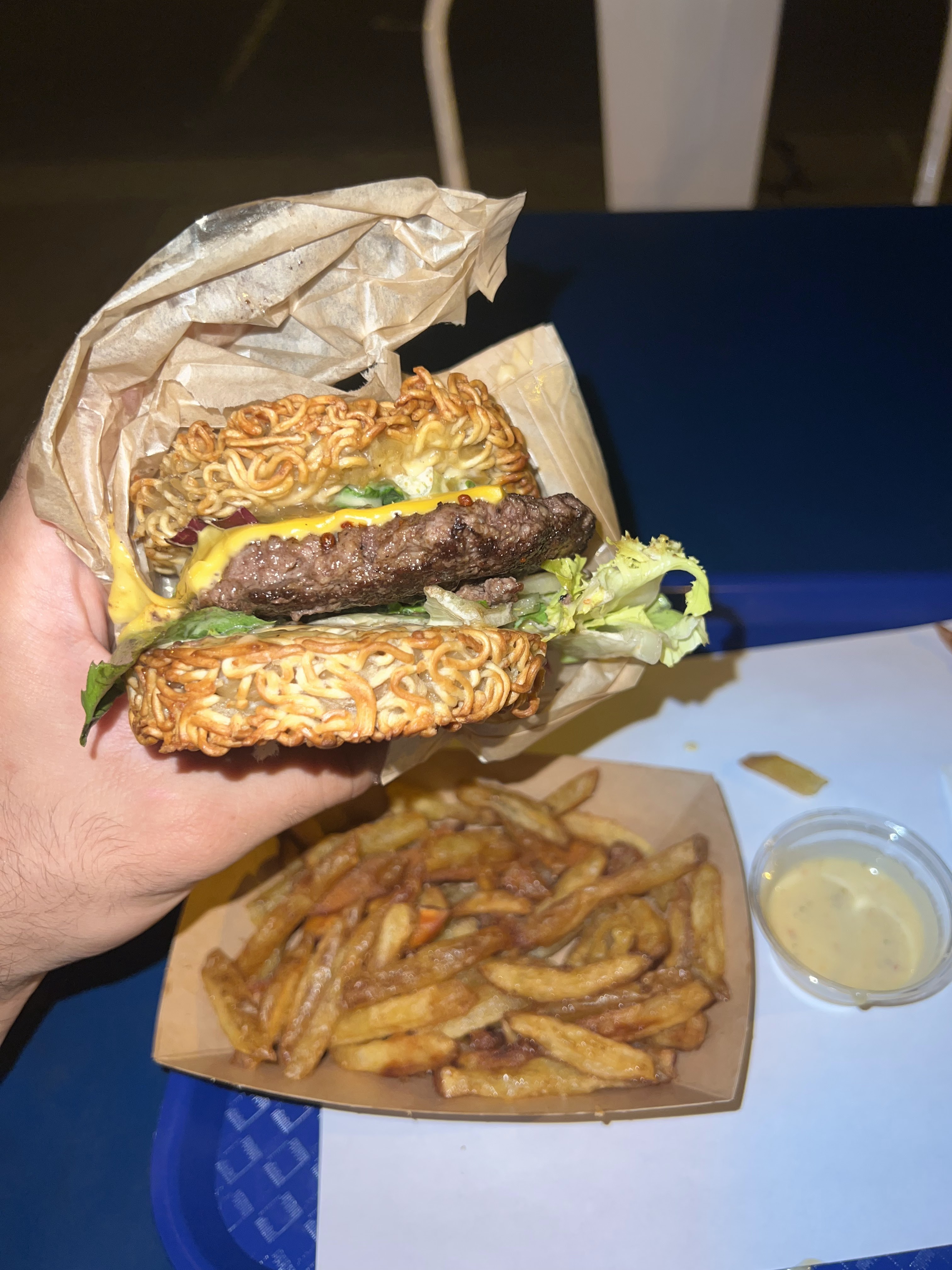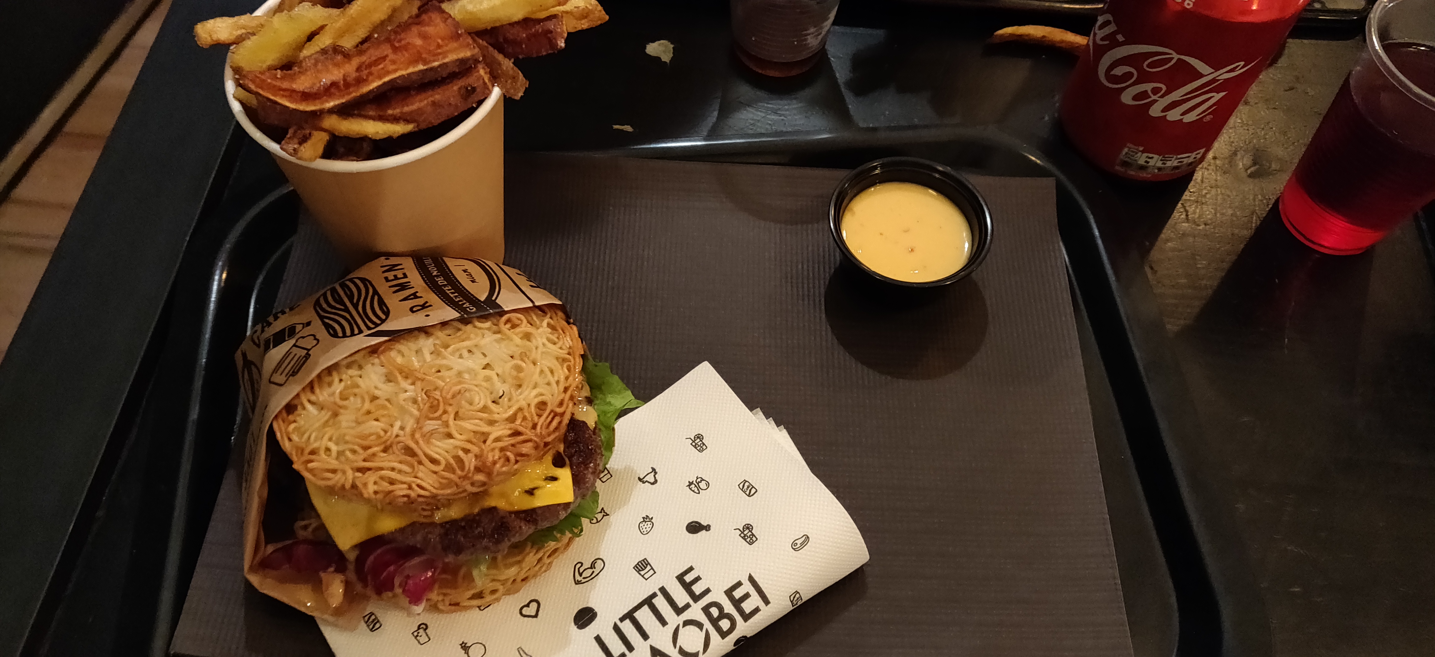 Très bon Burger aux ramens ou pain boa (brioche chinoise). Juste parfait avec une sauce asiatique qui se marie très bien l’ensemble. Les frites sont maison avec un mélange de patates douces qui rappel le sucré/salé du burger . Très bon rapport qualité/prix également ! Tout simplement une bonne adresse, je recommande.