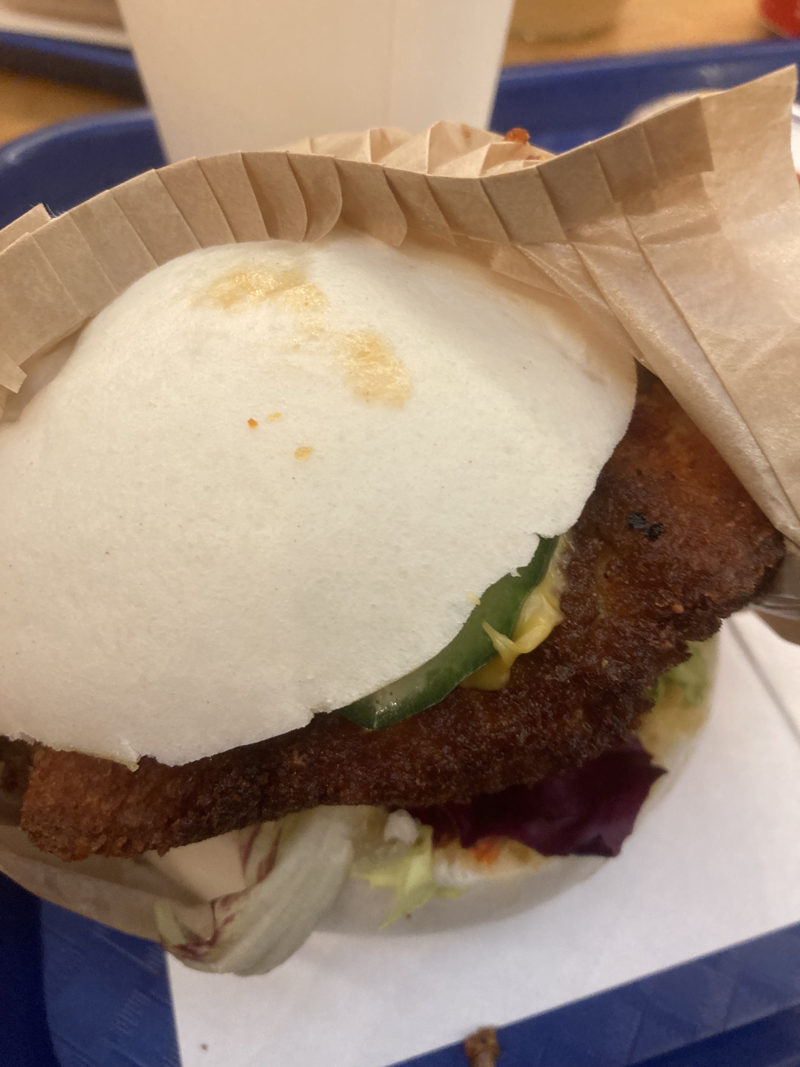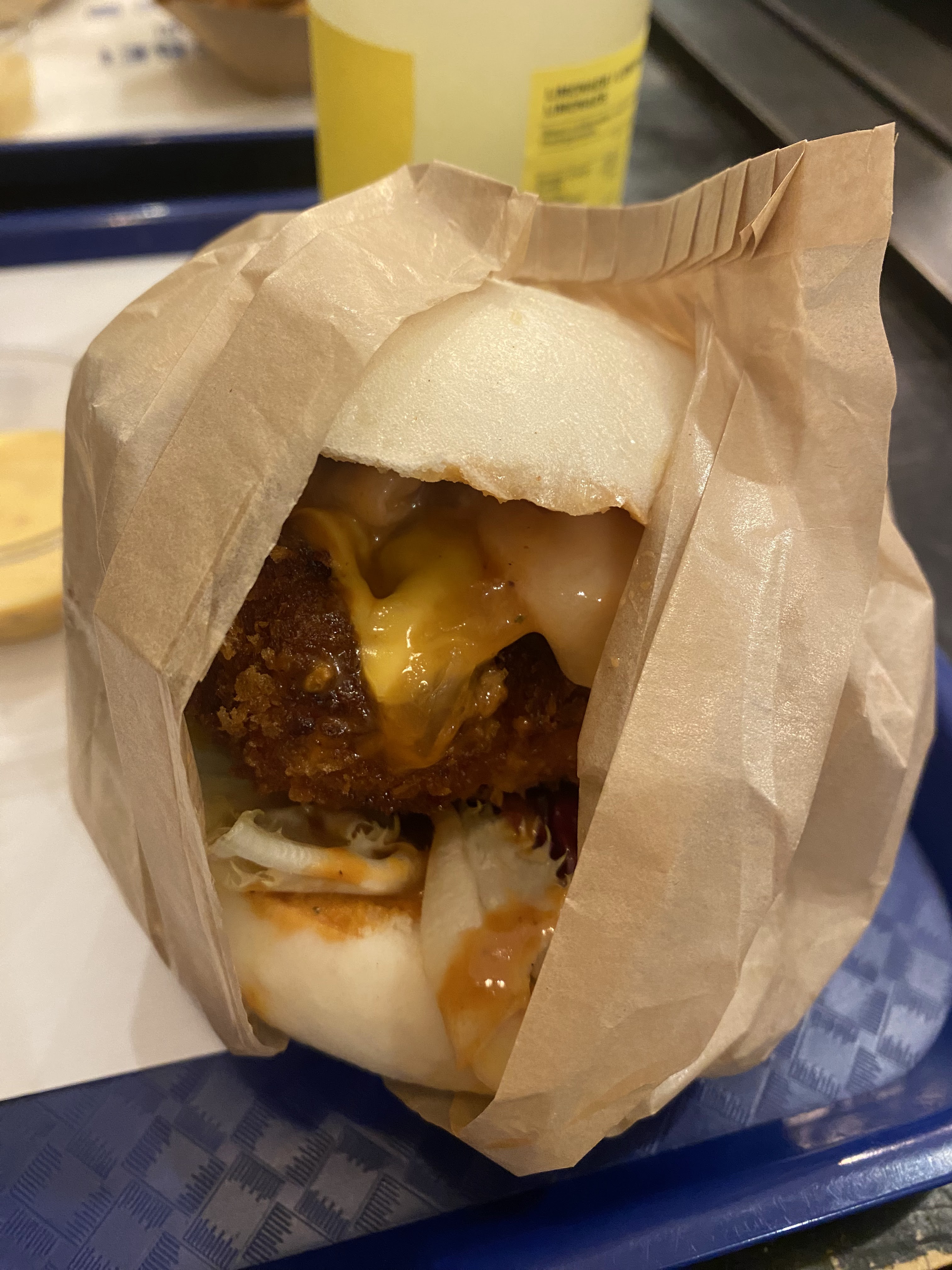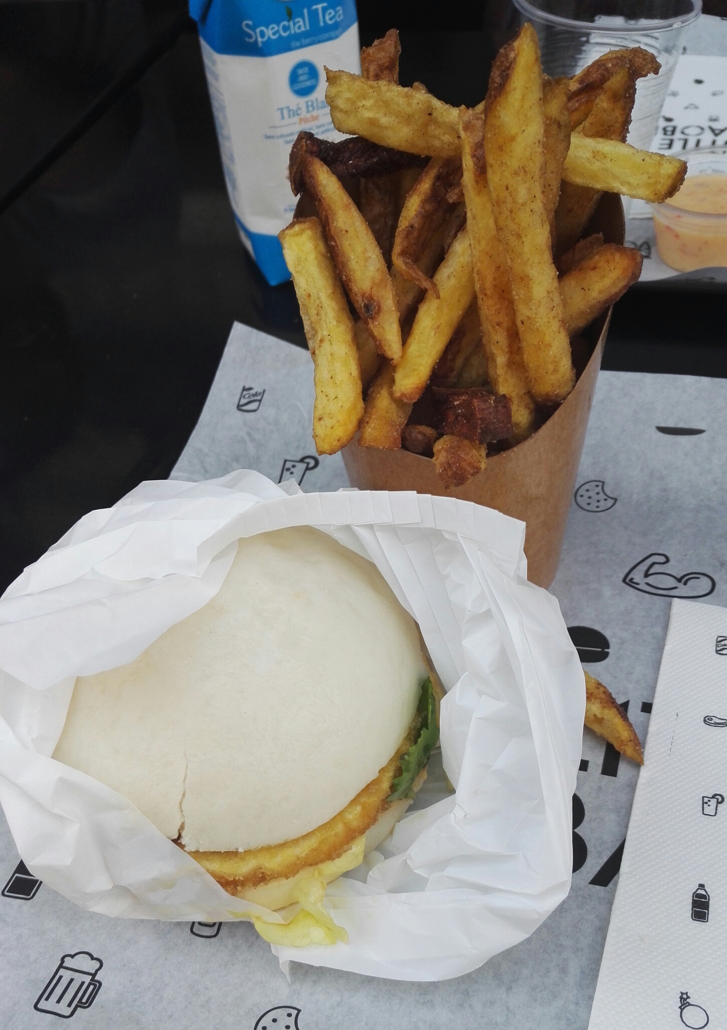 Délicieux (bao poulet croustillant) et copieux. Les frites étaient assaisonnées sucré salé, j'ai apprécié mais ce n'est pas au goût de tout le monde. Par contre l'endroit est vraiment petit et nous avons un peu attendu pour nous faire servir, dans un nuage de graillon 😅