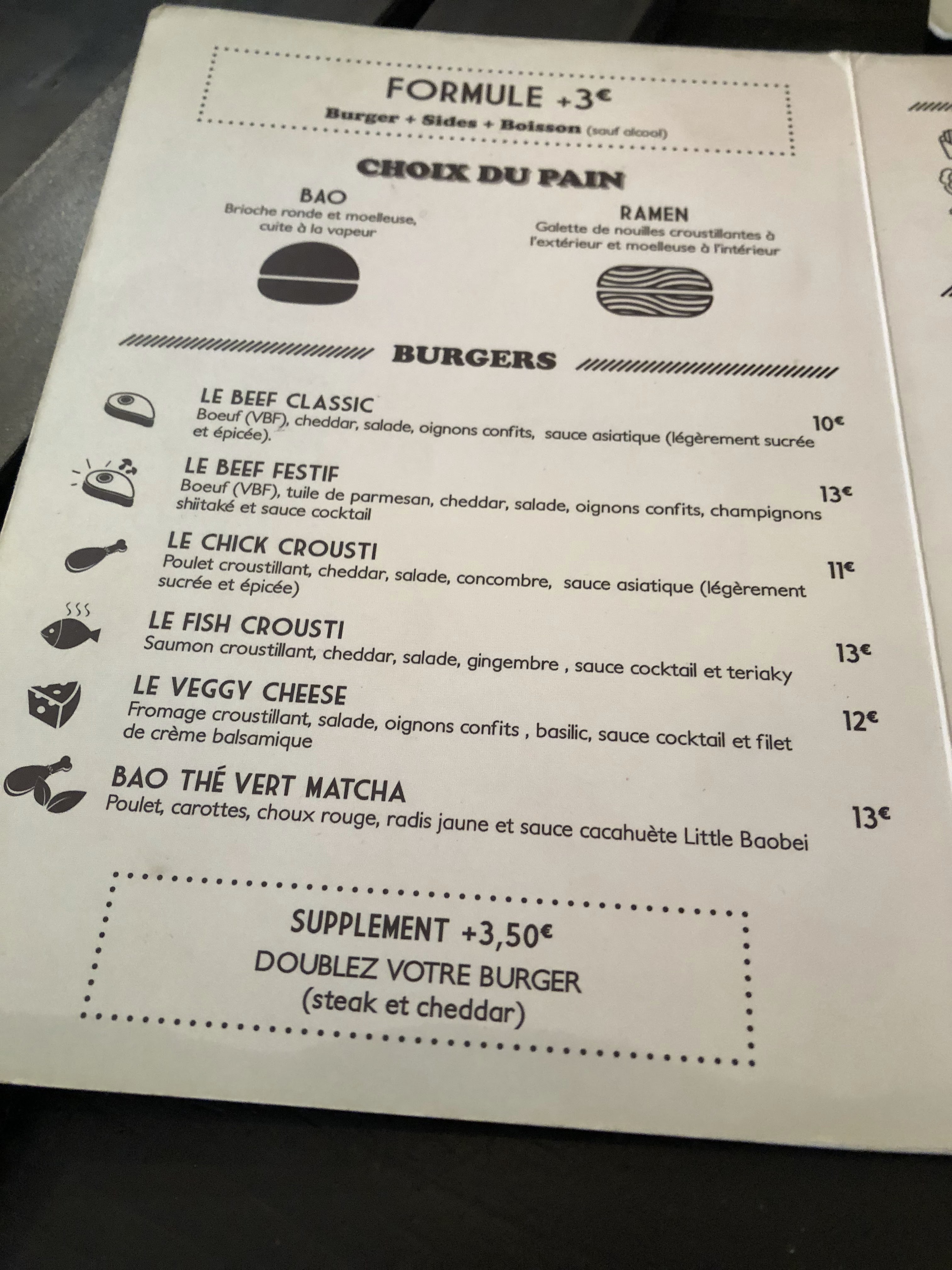 Mes amies et moi avons adoré ces burgers originaux et savoureux. Je conseille les pains bao traditionnels mais les plus audacieux peuvent tenter les ramens burgers.