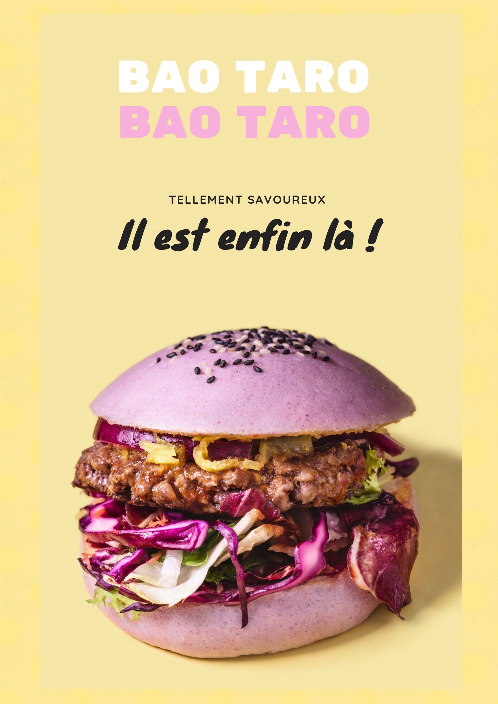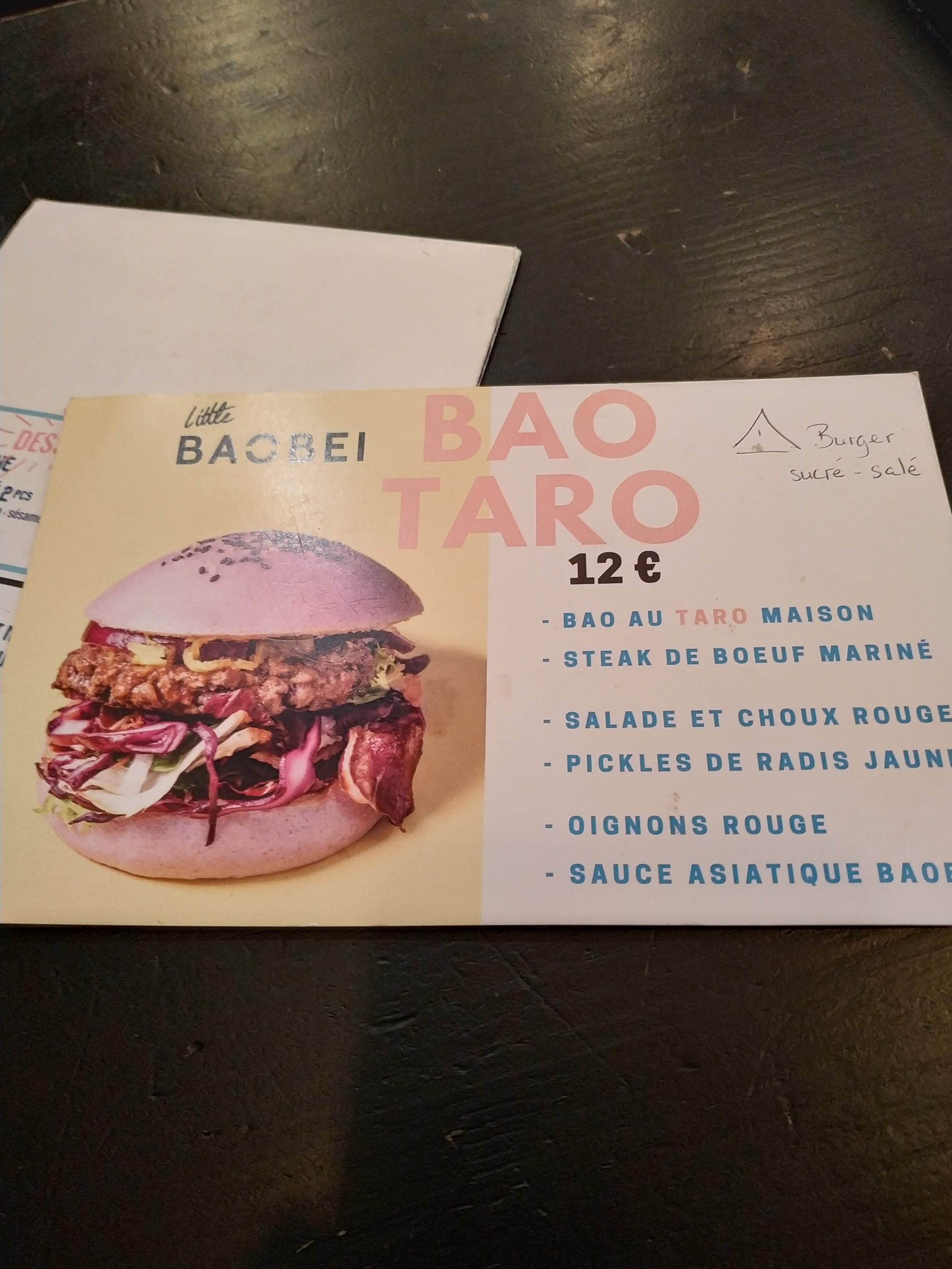 Belle découverte ! Rencontre entre Bao et burger. J'ai goûté au Bao Taro, super équilibre Steak mariné / goût umami / bun soft et croquant du choux rouge. Le radis jaune ajoute une touche asiatique marquée vraiment sympa, très gourmand. Pour manger sur place c'est un peu enfumé, la hotte n'aspire pas assez. Mais je recommande tout de même.
