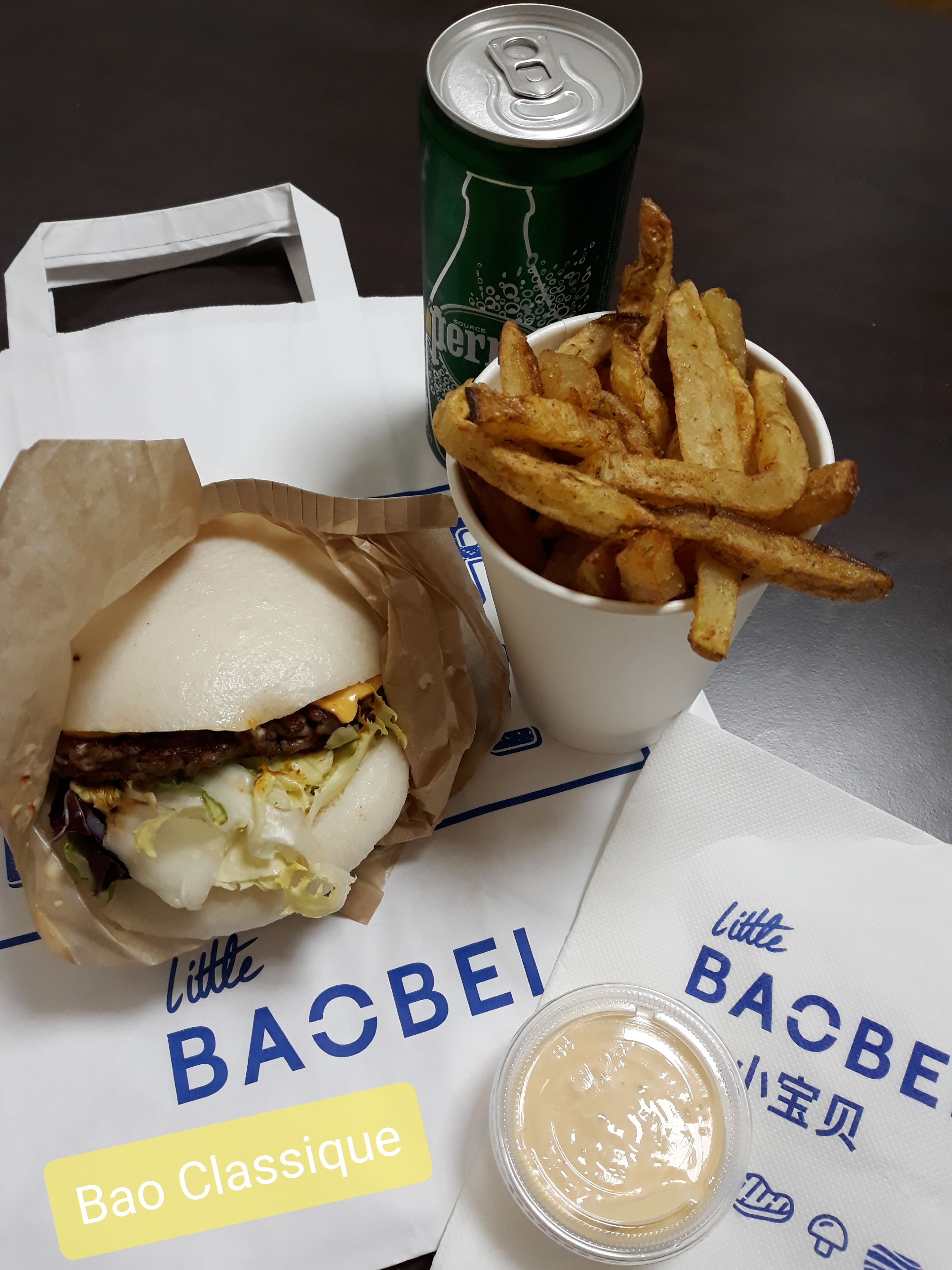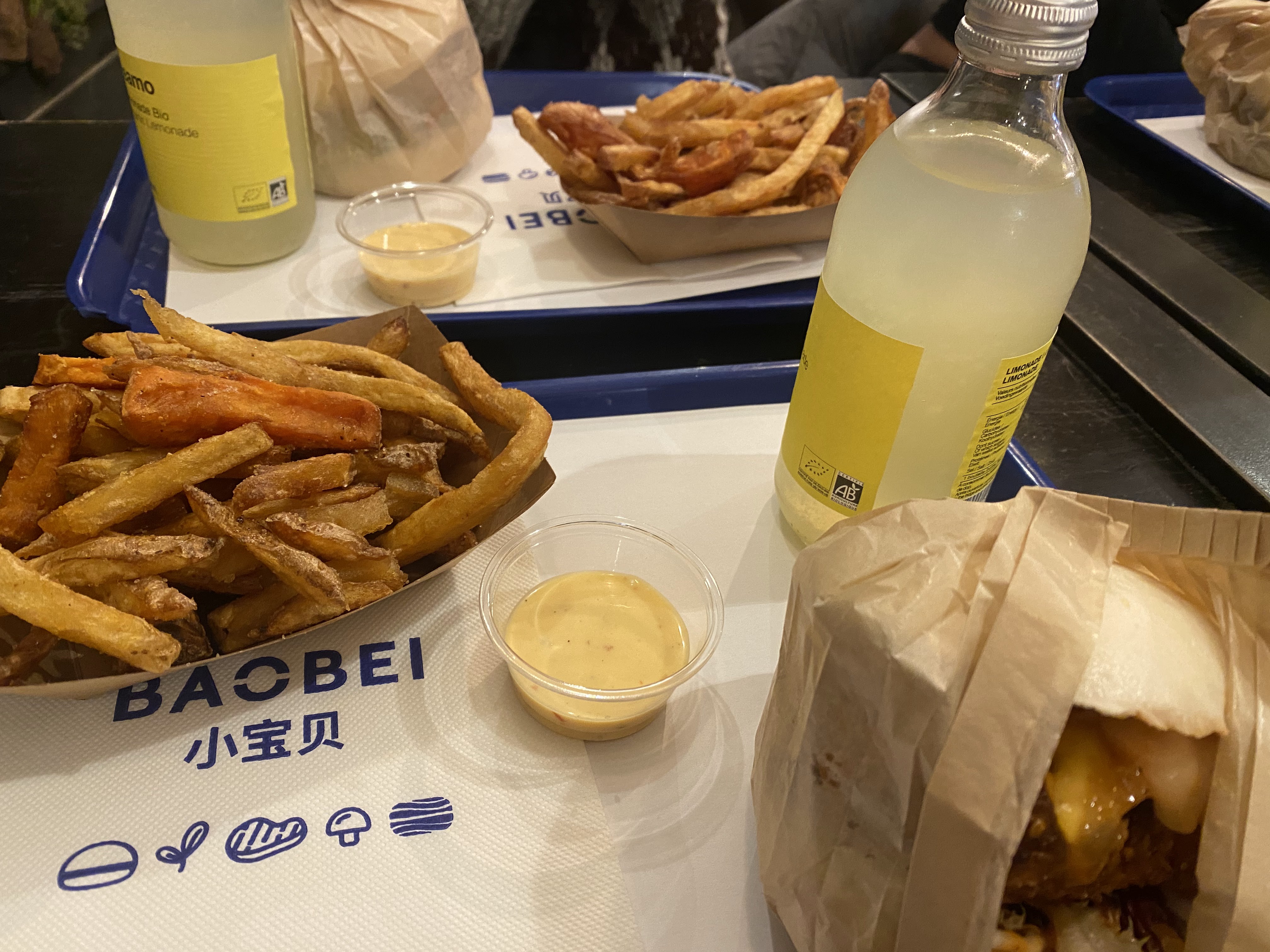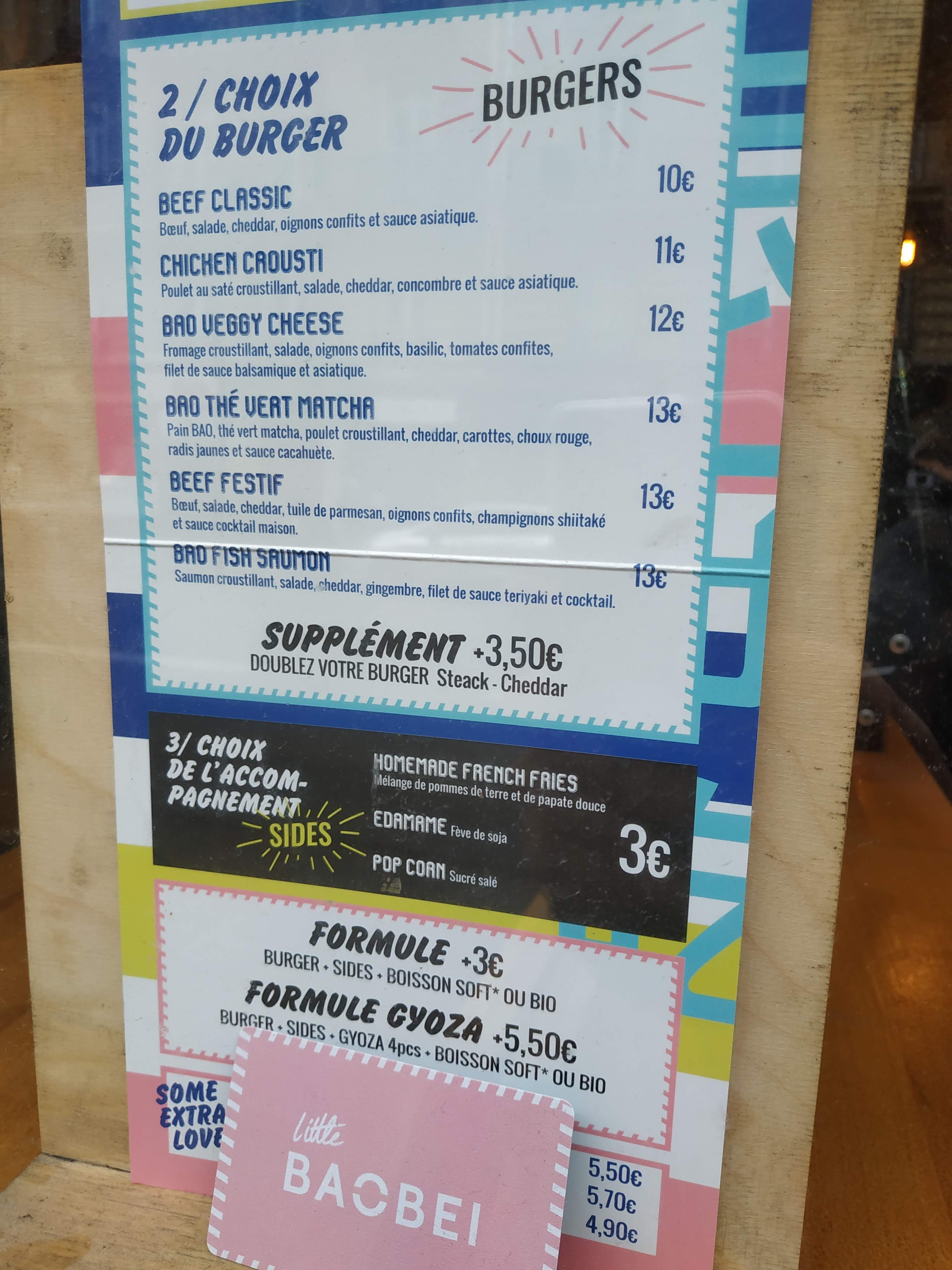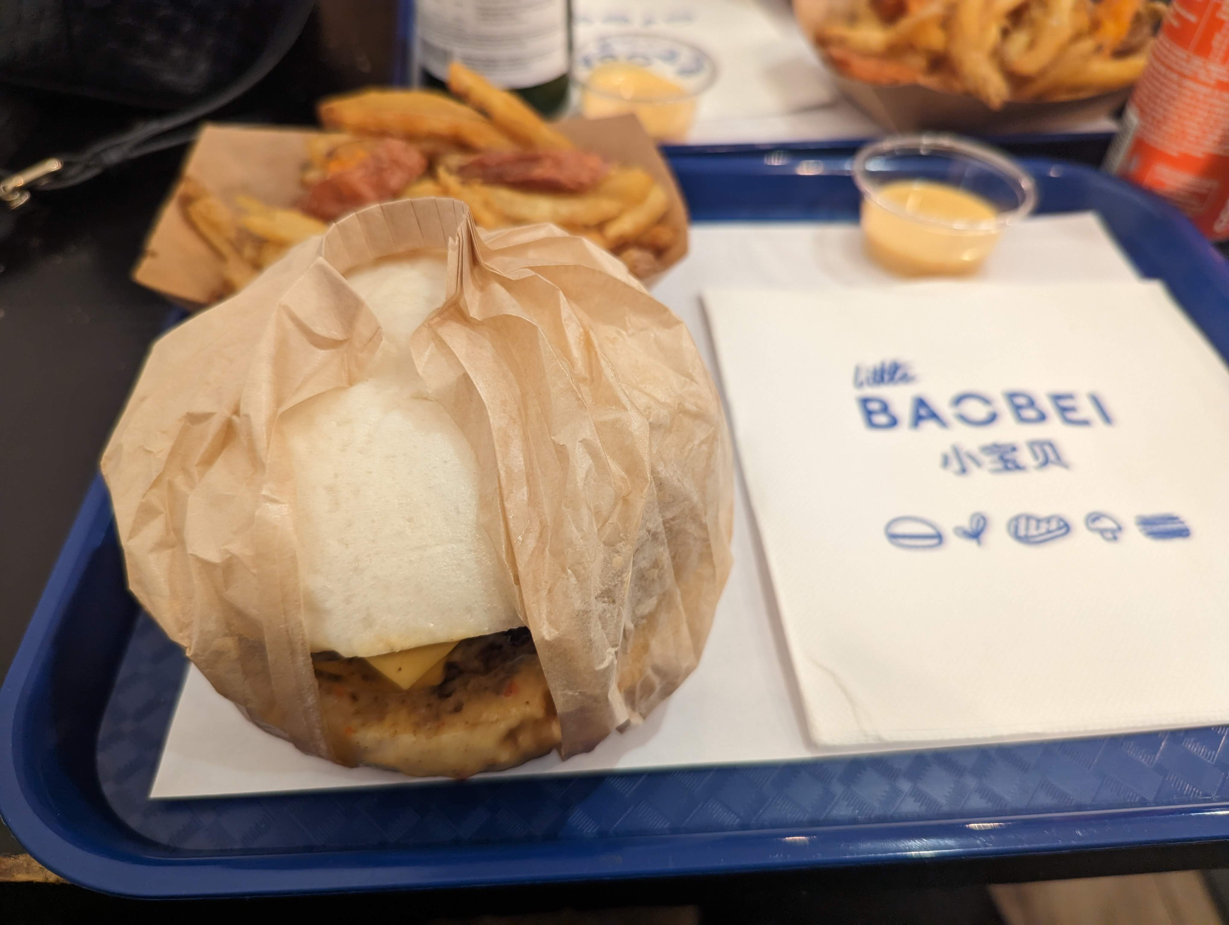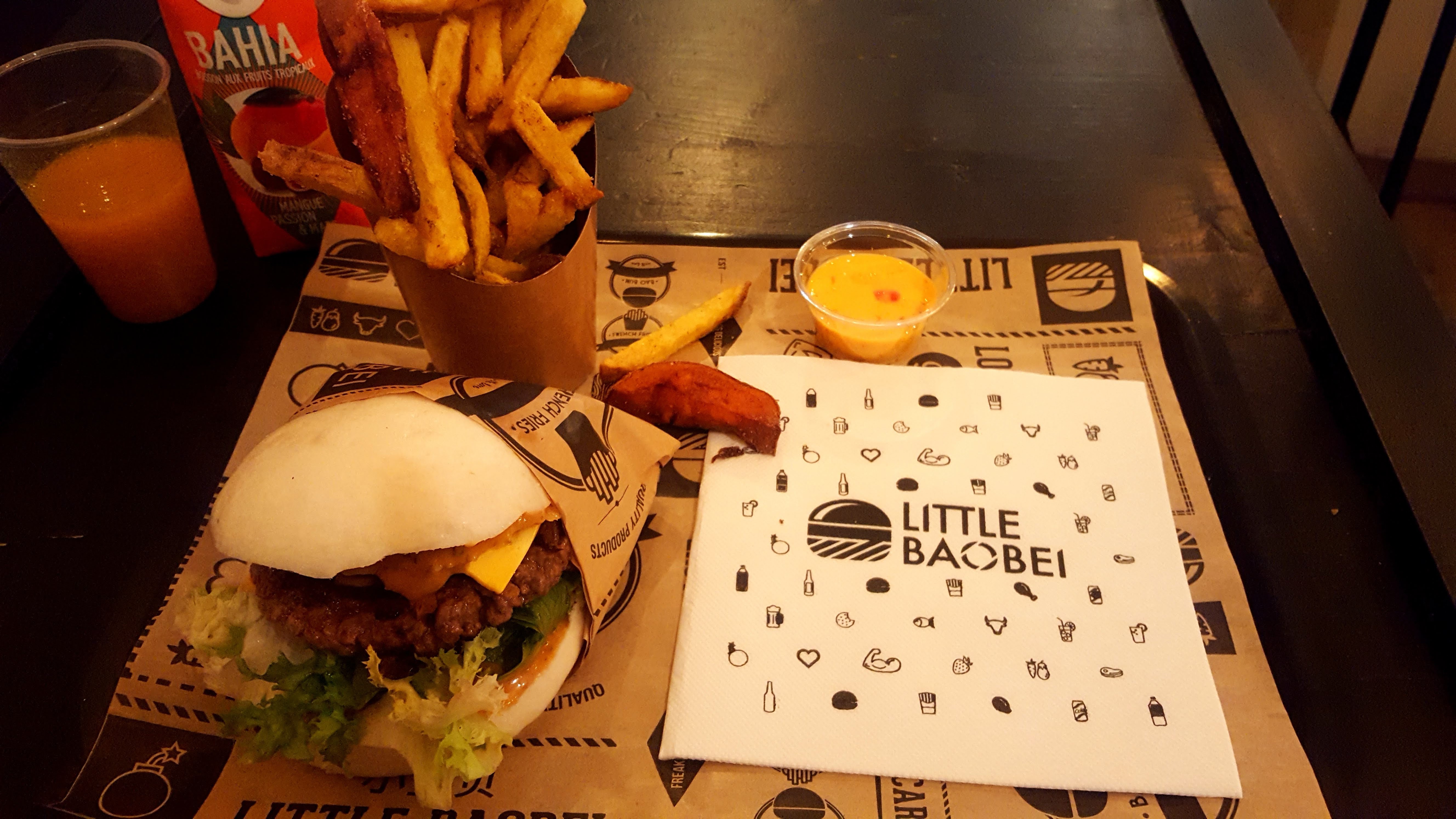 Cela fait un bon moment que je mange chez Little Baobei, j’appelle ce restaurant la valeur sure car le gout du burger festif n’a jamais changé et reste délicieux. La sauce frite maison est également superbe. Le prix est parfaitement convenable pour la qualité des produits. Le service est rapide ainsi que la prise de commande. Il n’y a pas beaucoup de places donc à ne pas venir en grand groupe et vous ne pouvez pas réserver. - : il n’y a plus la poudre sur les frites et on a perdu des gouts sur les limonades