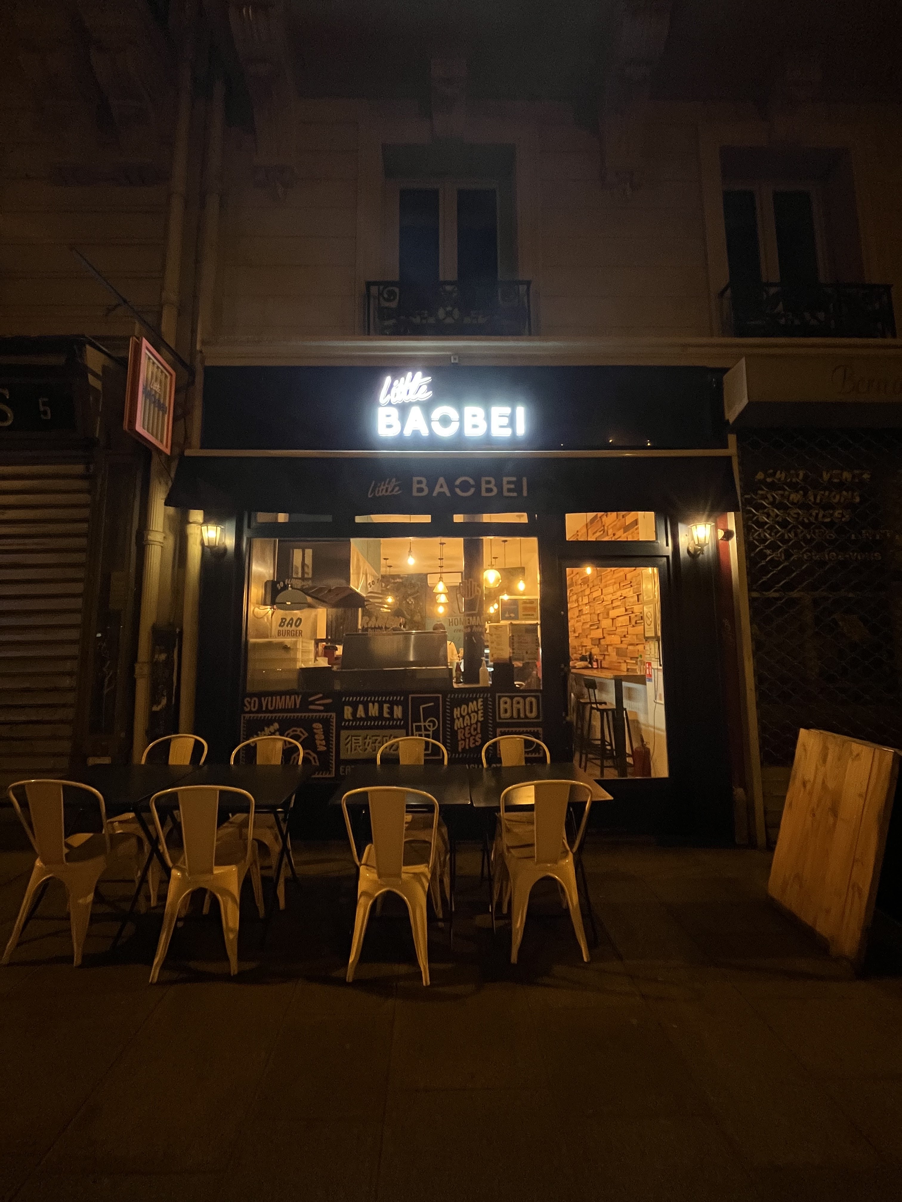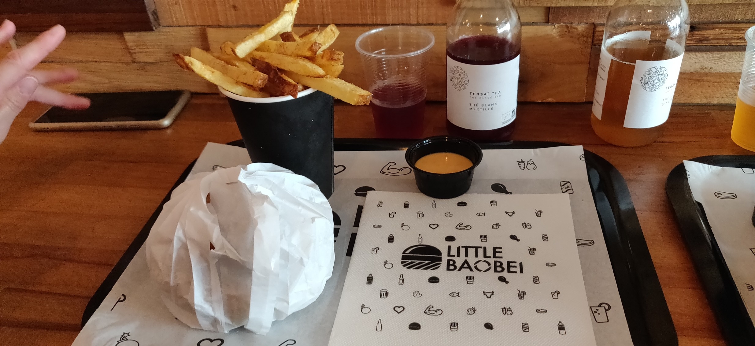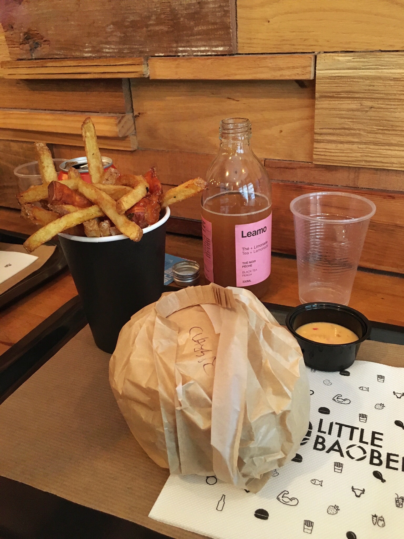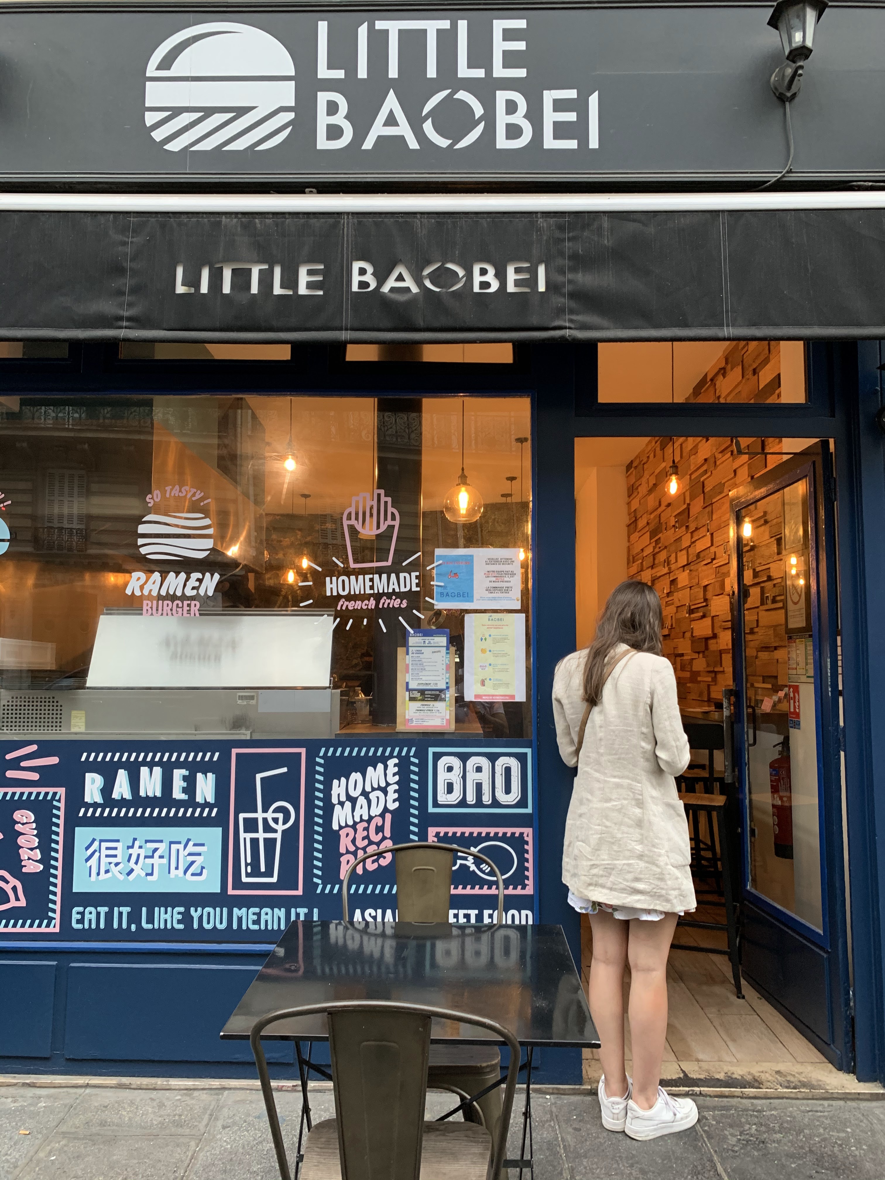 Cela fait un bon moment que je mange chez Little Baobei, j’appelle ce restaurant la valeur sure car le gout du burger festif n’a jamais changé et reste délicieux. La sauce frite maison est également superbe. Le prix est parfaitement convenable pour la qualité des produits. Le service est rapide ainsi que la prise de commande. Il n’y a pas beaucoup de places donc à ne pas venir en grand groupe et vous ne pouvez pas réserver. - : il n’y a plus la poudre sur les frites et on a perdu des gouts sur les limonades