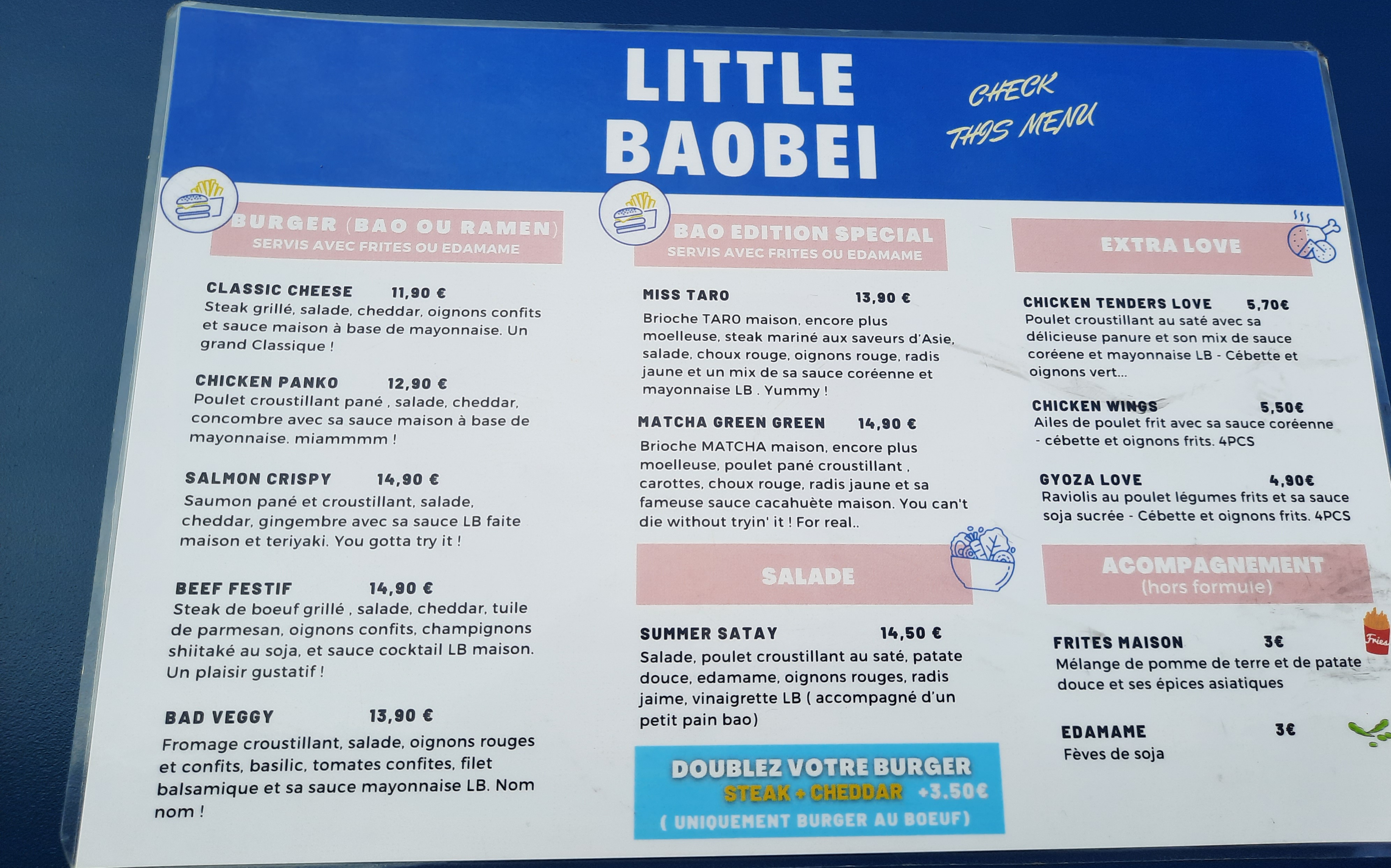 Trop trop bon ! Allez-y les yeux fermés ! Le bao cheese est trop bon ! Les frites aussi faites maison, les boissons. Dédicace à Flo tjrs sympa et accueillant