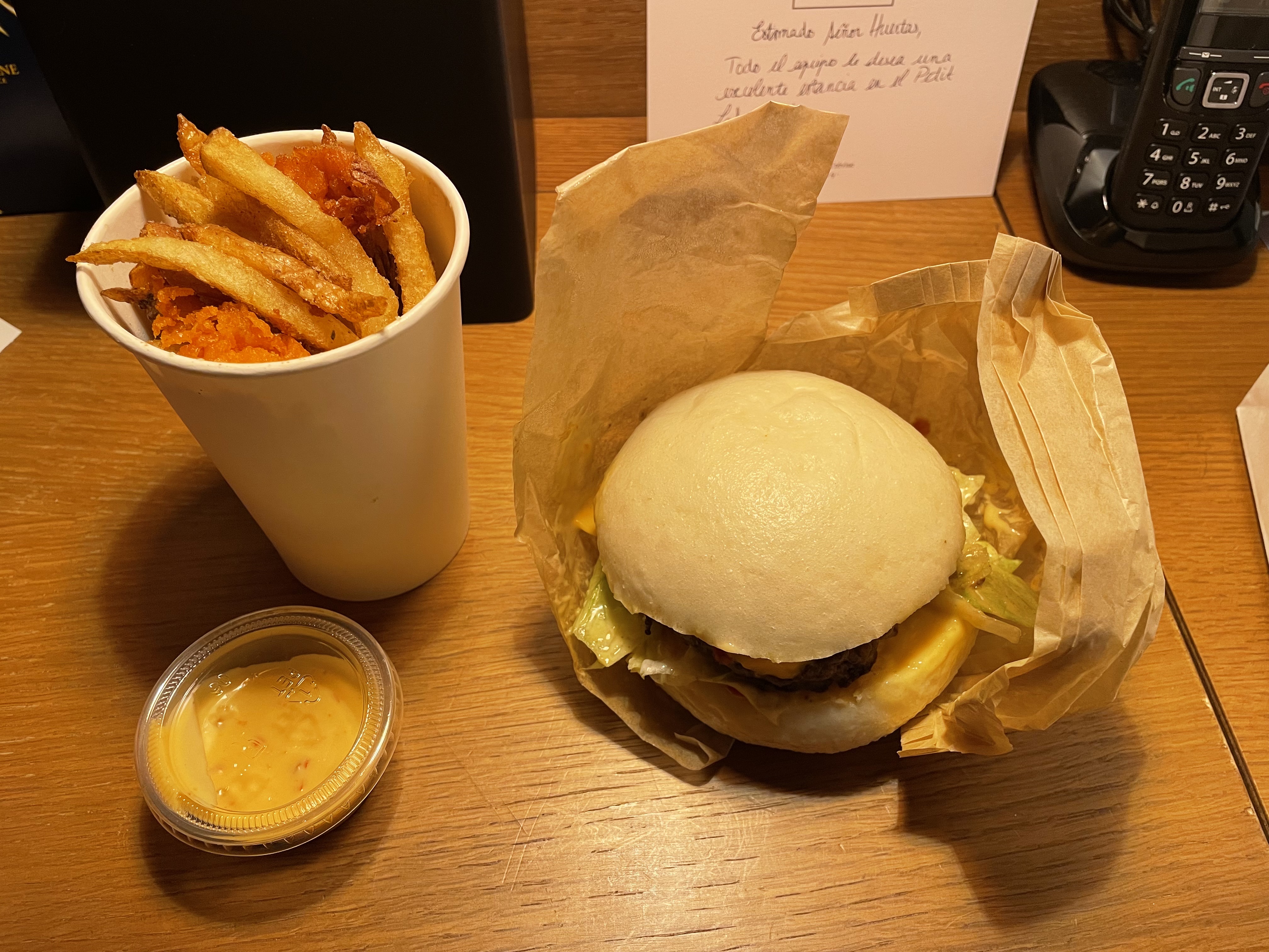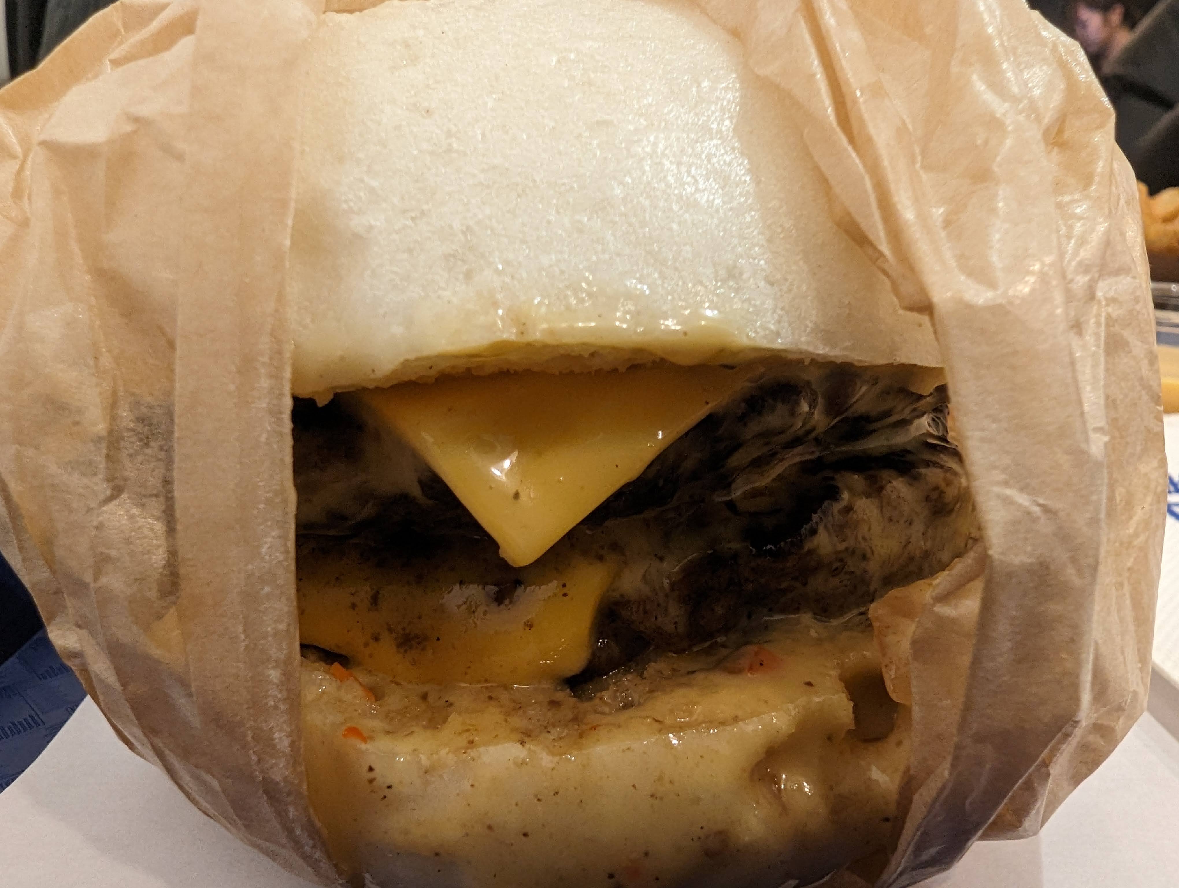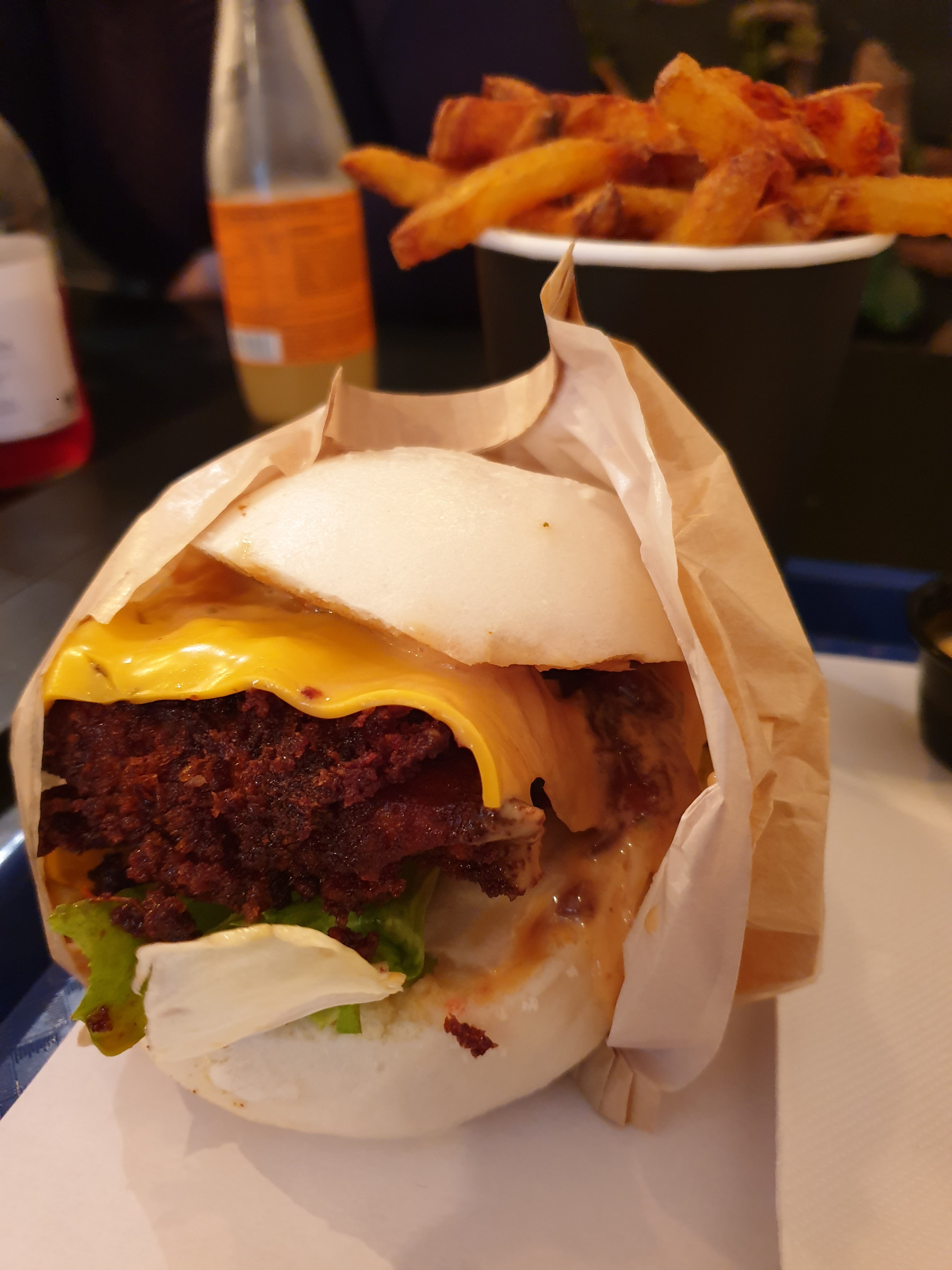 J'ai commandé sur glovo 2 burgers et des frites. Un veggy cheese et un beef classic. Les frites, passait, c'était un goût intéressant. Mais mon copain a goûté son burger beef et déjà il m'a dit que le pain était terrible, mais la viande était encore pire. J'ai goûté un peu et je peux dire que je n'ai jamais mangé quelque chose si dégueulasse. Si vous pensez que ça c'est mauvais, attendez pour le veggie cheese. J'avais l'impression de manger une espèce de gras trooop sucré qui laisse le pain vide car l'intérieur recule tout le temps. N'ayant pas envie de le rattraper, j'ai abandonné la tâche si difficile de manger une telle monstruosité.