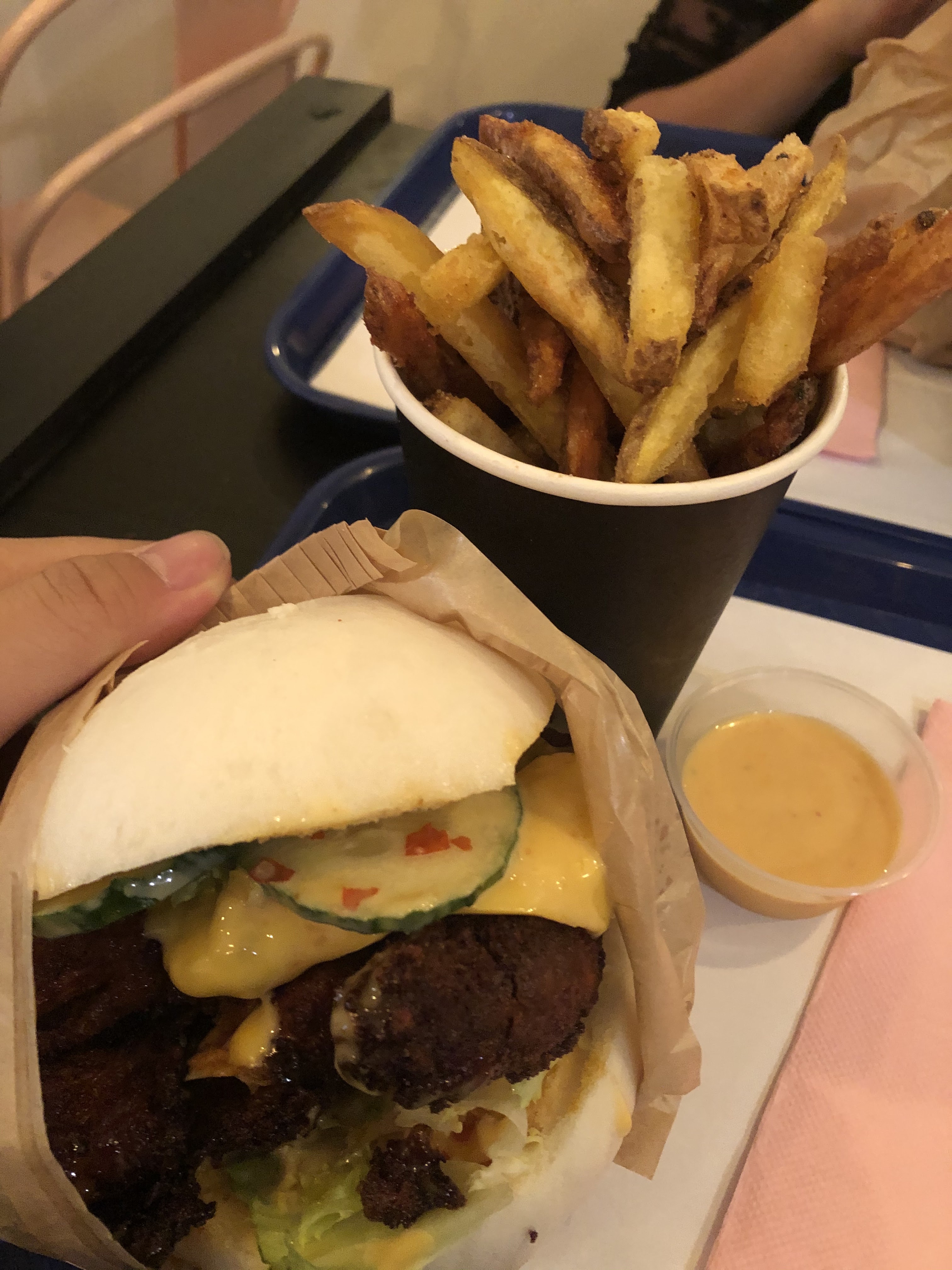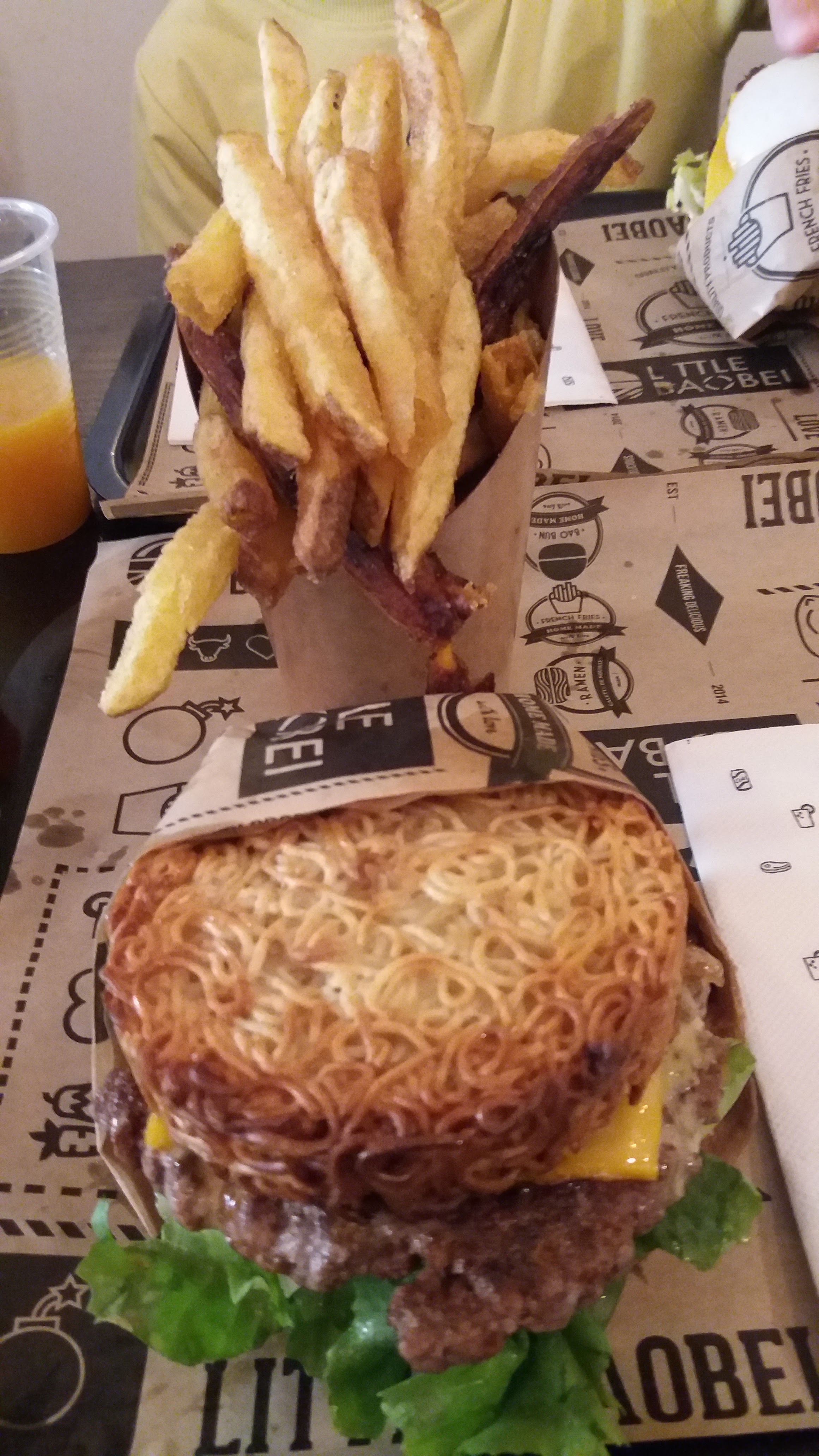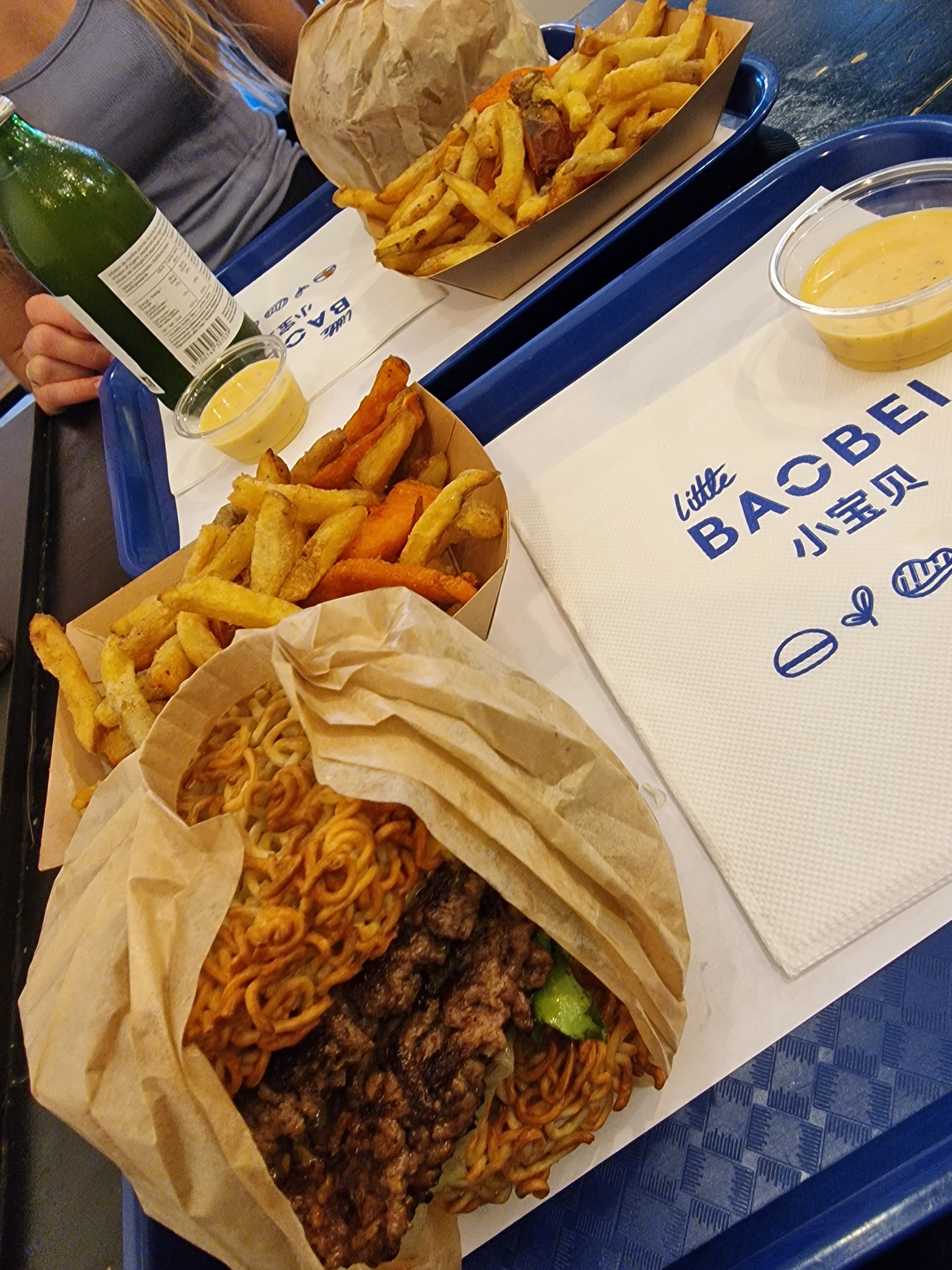 Concept intéressant Par contre les bao burger ne sont pas pratique à manger, ça dégouline de partout. Les frites mixtes ne l’étaient que de nom car je n’avais qu’1 frite de patate douce dans ma portion et ma collègue 2, de plus la variété des pommes de terre serait à revoir selon moi. De plus, il manquait du goût à ces bao (veggy cheese et crousti chicken) Du coup je me tâte à goûter les ramen burgers