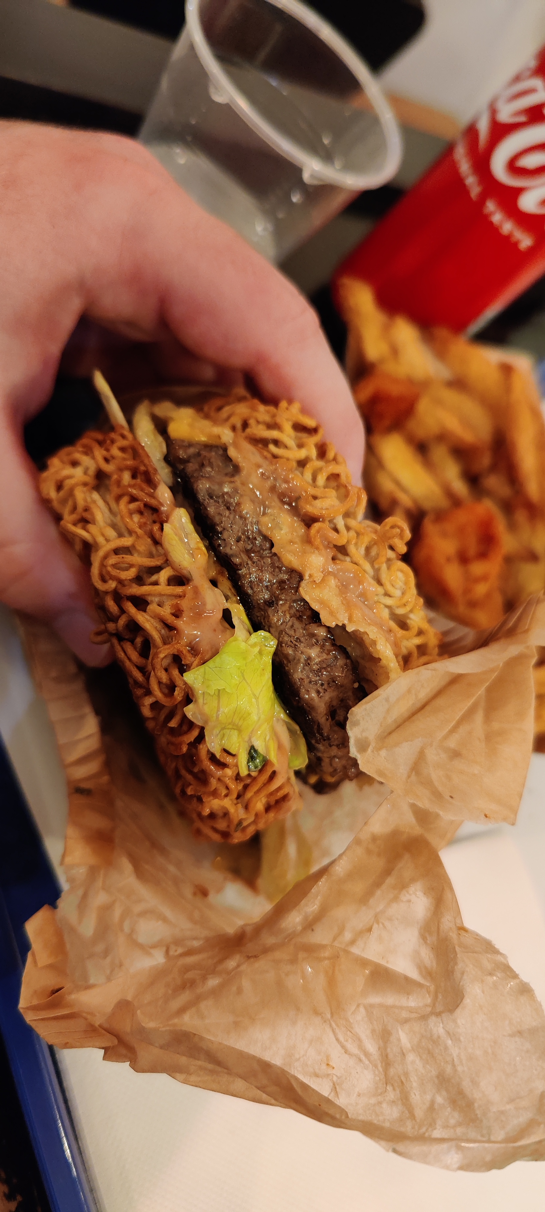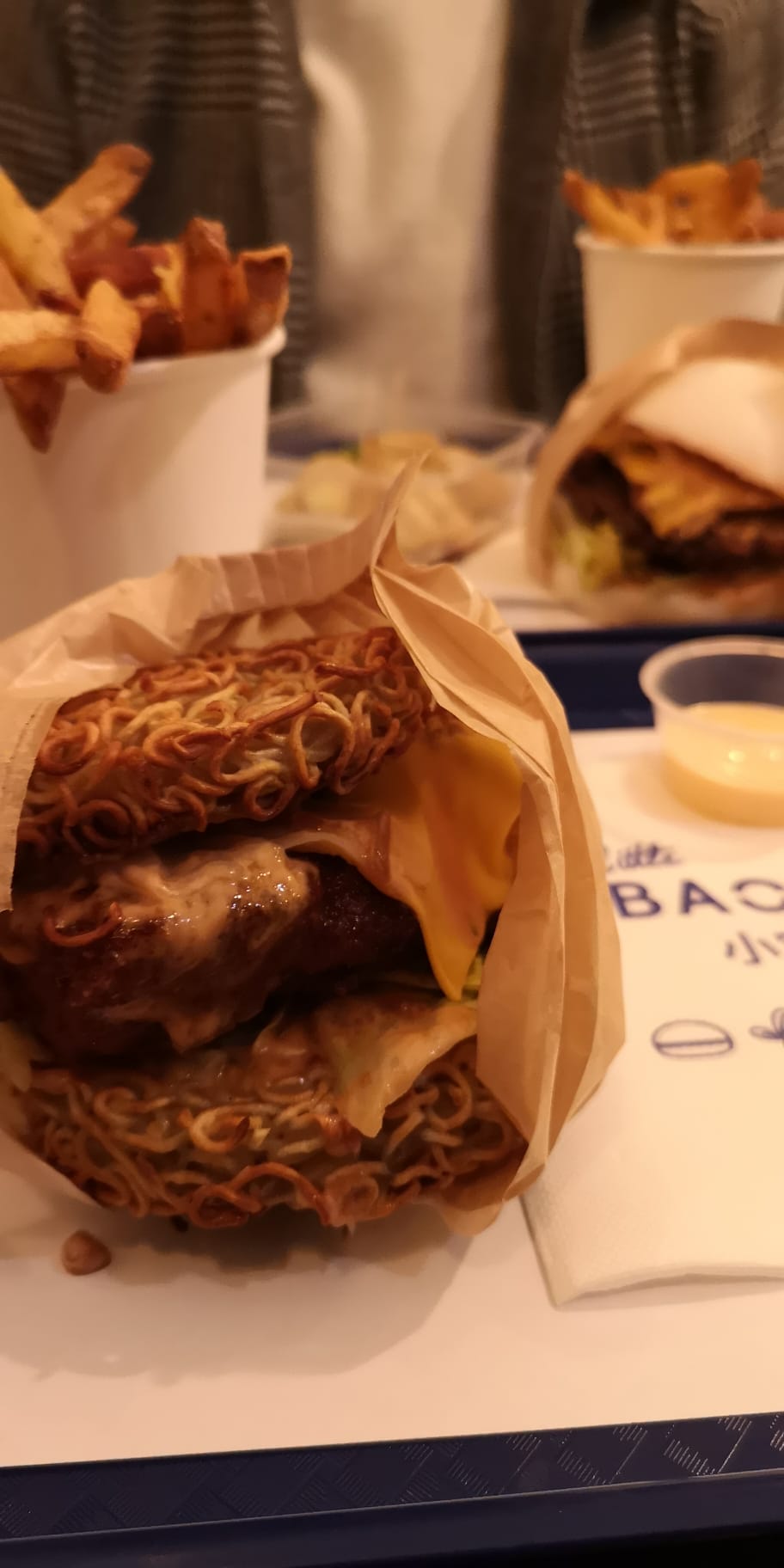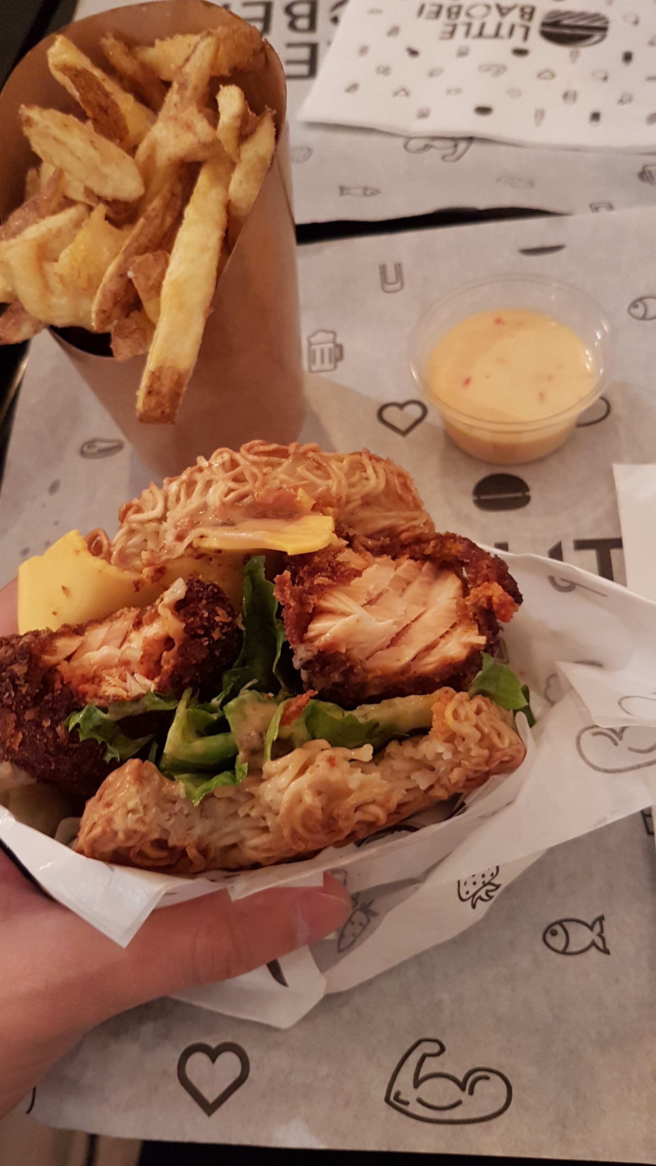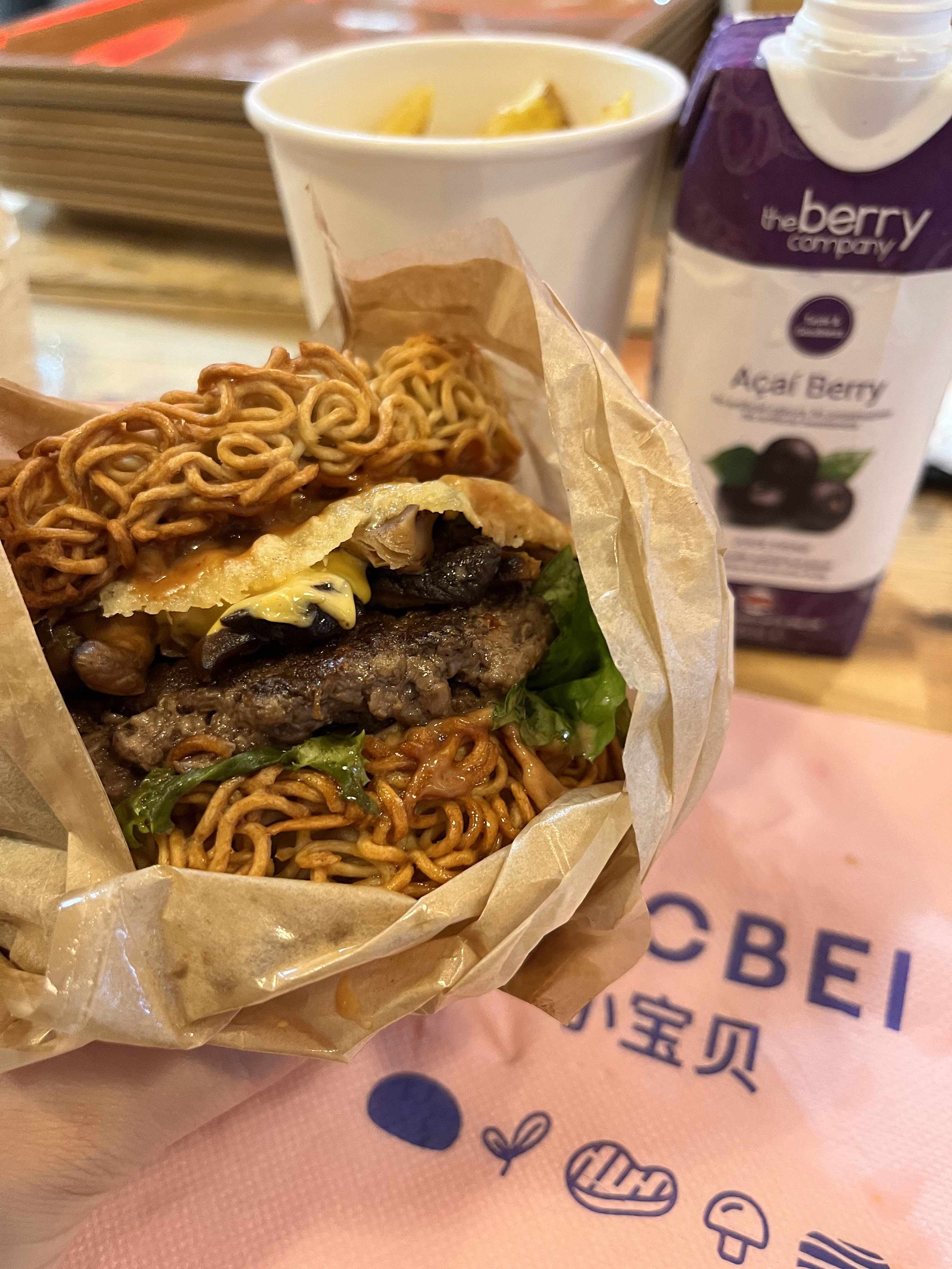 Concept intéressant Par contre les bao burger ne sont pas pratique à manger, ça dégouline de partout. Les frites mixtes ne l’étaient que de nom car je n’avais qu’1 frite de patate douce dans ma portion et ma collègue 2, de plus la variété des pommes de terre serait à revoir selon moi. De plus, il manquait du goût à ces bao (veggy cheese et crousti chicken) Du coup je me tâte à goûter les ramen burgers