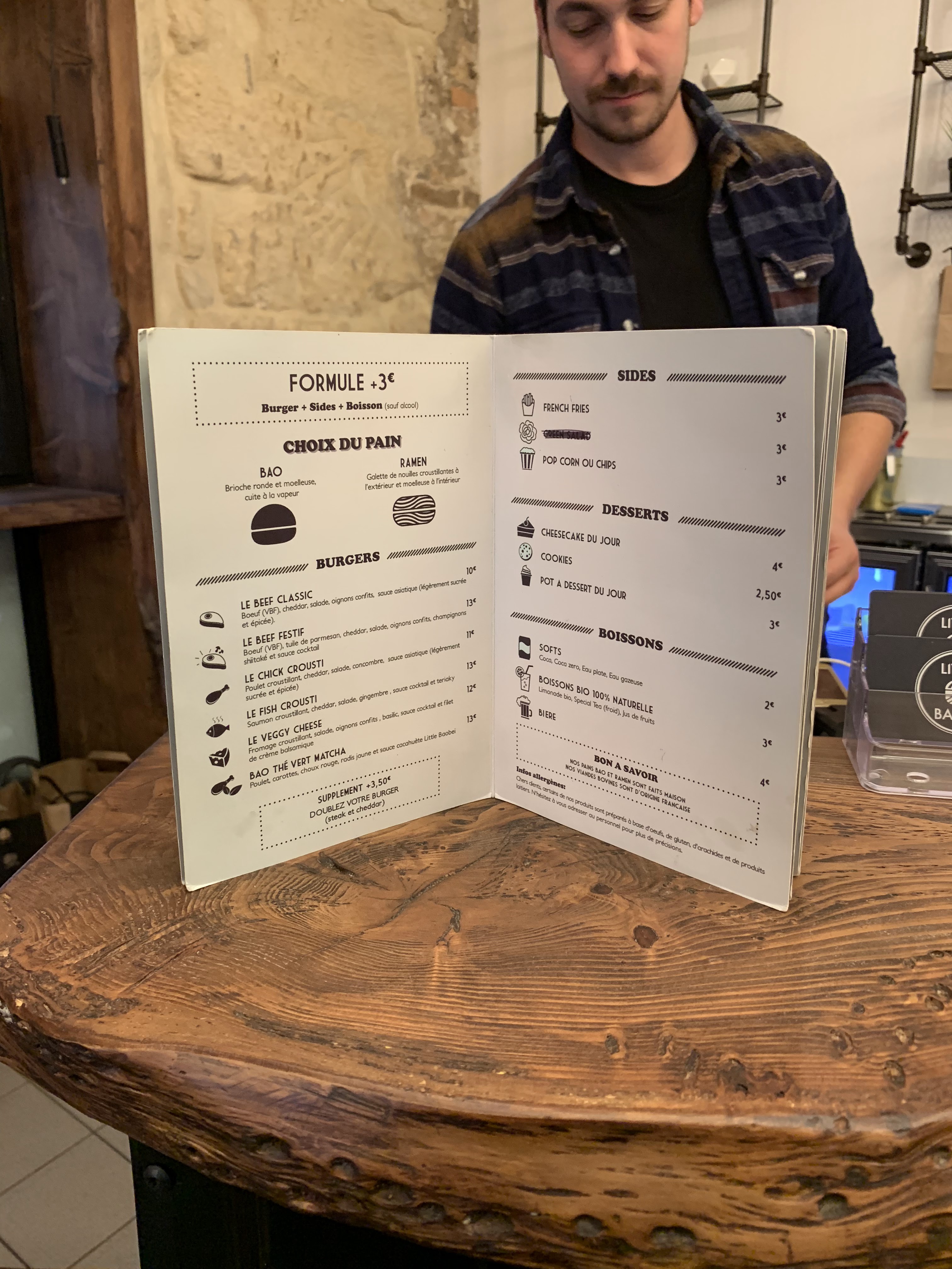 Une équipe cool et de bons baoburgers, un chicken et un classique avec frites maison. Ouvert jusque 23h ce qui nous a permis de profiter d’une scène de théâtre juste avant et de venir manger tranquillement après.