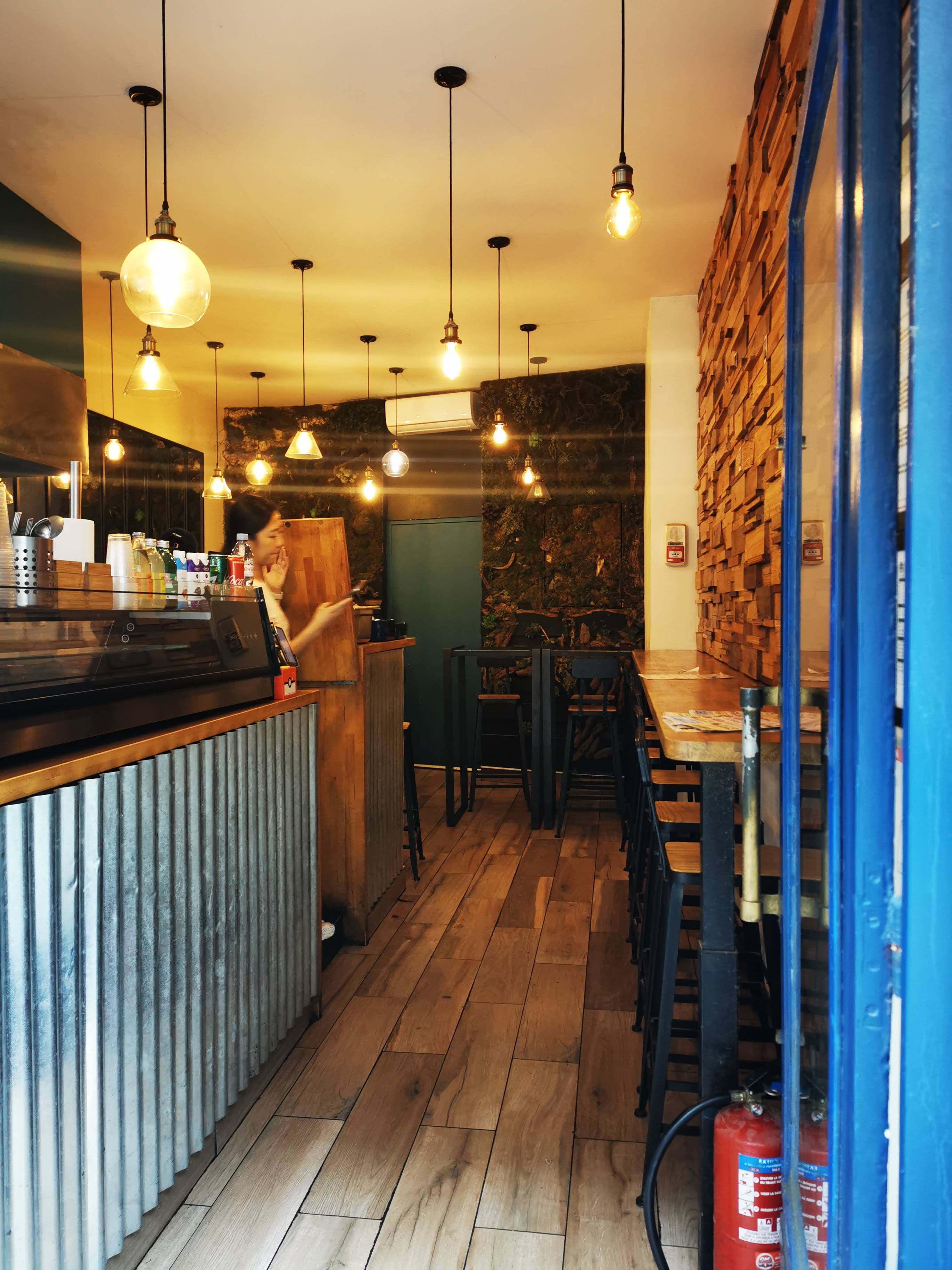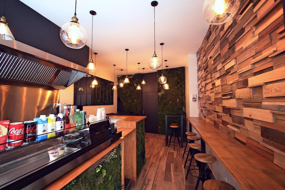 Accueil courtois. Le restaurant offre un nombre restreint de places assises mais propose des repas à emporter. Le mur végétal au fond du restaurant colle au cadre. Les burgers à la carte sont proposés avec ramen (disques de nouilles) ou bao pains cuits à la vapeur) en remplacement des pains traditionnels. Je n'ai goûté attira la version ramen: je m'attendais à quelque chose d'assez croustillant mais qui s'est avéré quelque peu pâteux. Pas mauvais pour autant. Je citerais la version bao une prochaine fois. L'accompagnement en frites en contient quelques unes faites de patate douce. Llée tout, un peu gras, se laisse manger avec plaisir, surtout trempé dans la sauce fournie. Les boissons proposées contiennent quelques jus de fruit exotiques que l'on ne trouve pas partout. Globalement, j'y retournerai avec plaisir même si je trouve les prix un peu élevés (16€ le burger+frites+boisson).