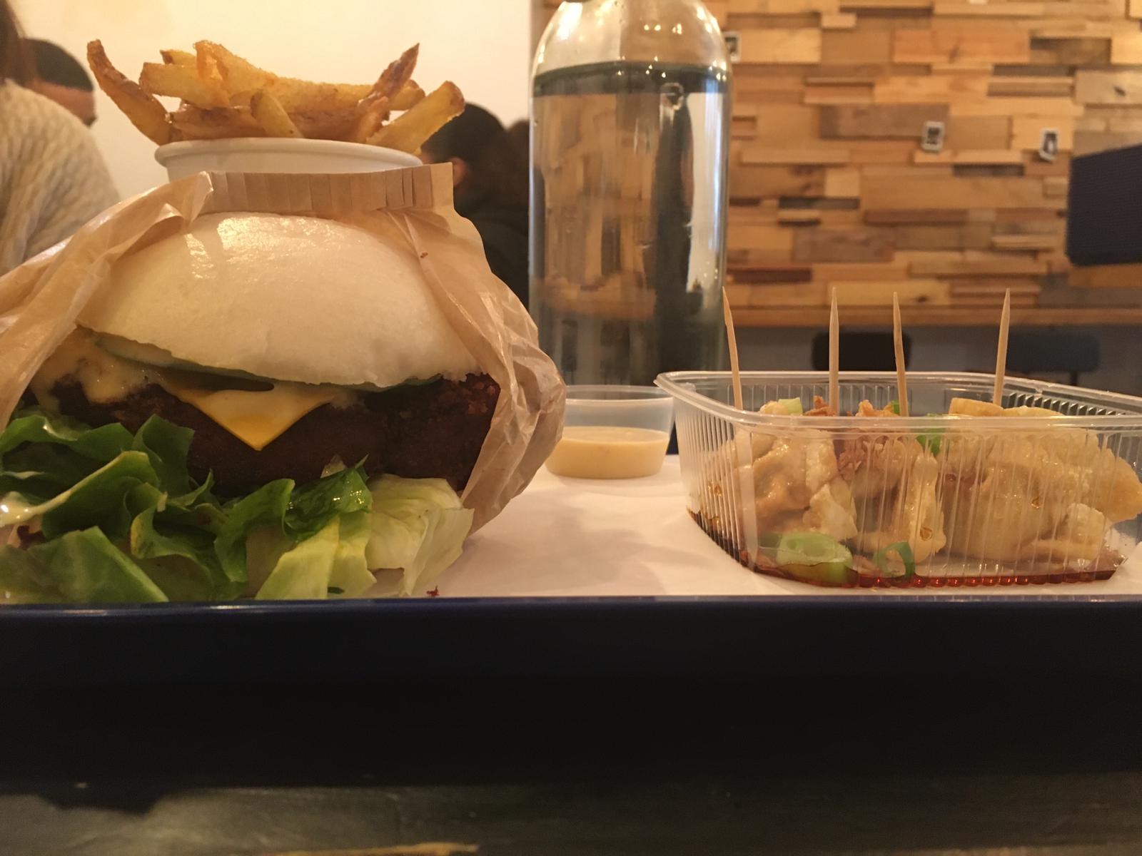 À la recherche d'un repas à emporter pour 5 personnes, nous avons commandé 3 burgers ramen veg, 2 bau burgers veg en formule menus avec accompagnement des gyozas et frites. Tous le monde a pu choisir sans difficulté et la préparation a été vite, assez chaudes et efficacement servi pour le déplacement. Nous avons considéré que dans les burgers le fromage frit était un peu trop arrogant dans l'équilibre du goût, cependant nous avons bien remarqué la nouveauté des nouilles asiatiques adoptés comme pan pour un burger. La note négative du menu est du au manque de choix vegan et à la pauvreté d'options végétarien (un seul burger et pas de gyoza veg), quel dommage ! Les boissons fraîches biologiques étaient très appréciées, au même titre que les prix : correctes. Nous avons pas de regrets, et nous conseillons de goûter les propositions de Little Baobei sous le signe de l'originalité !