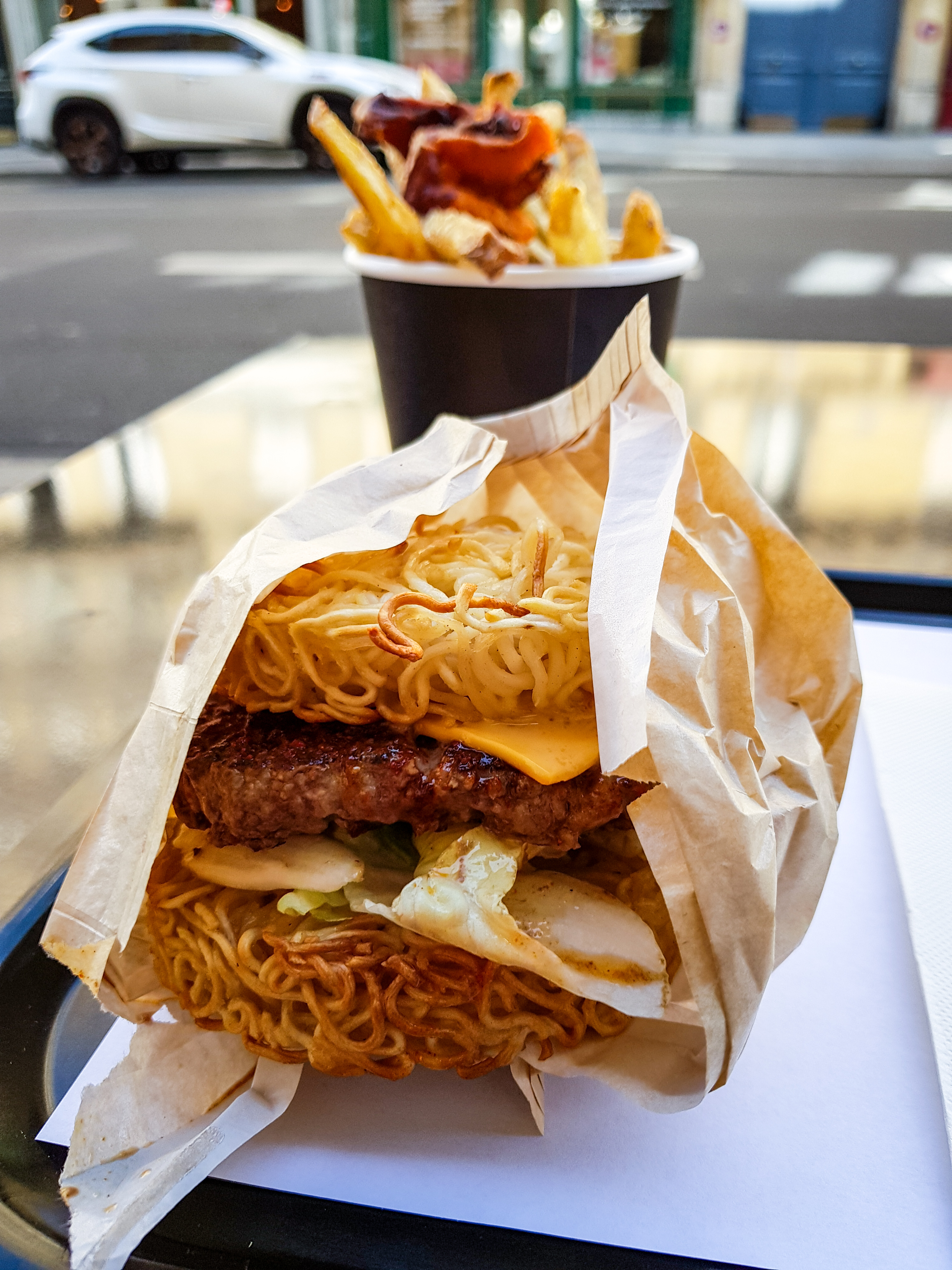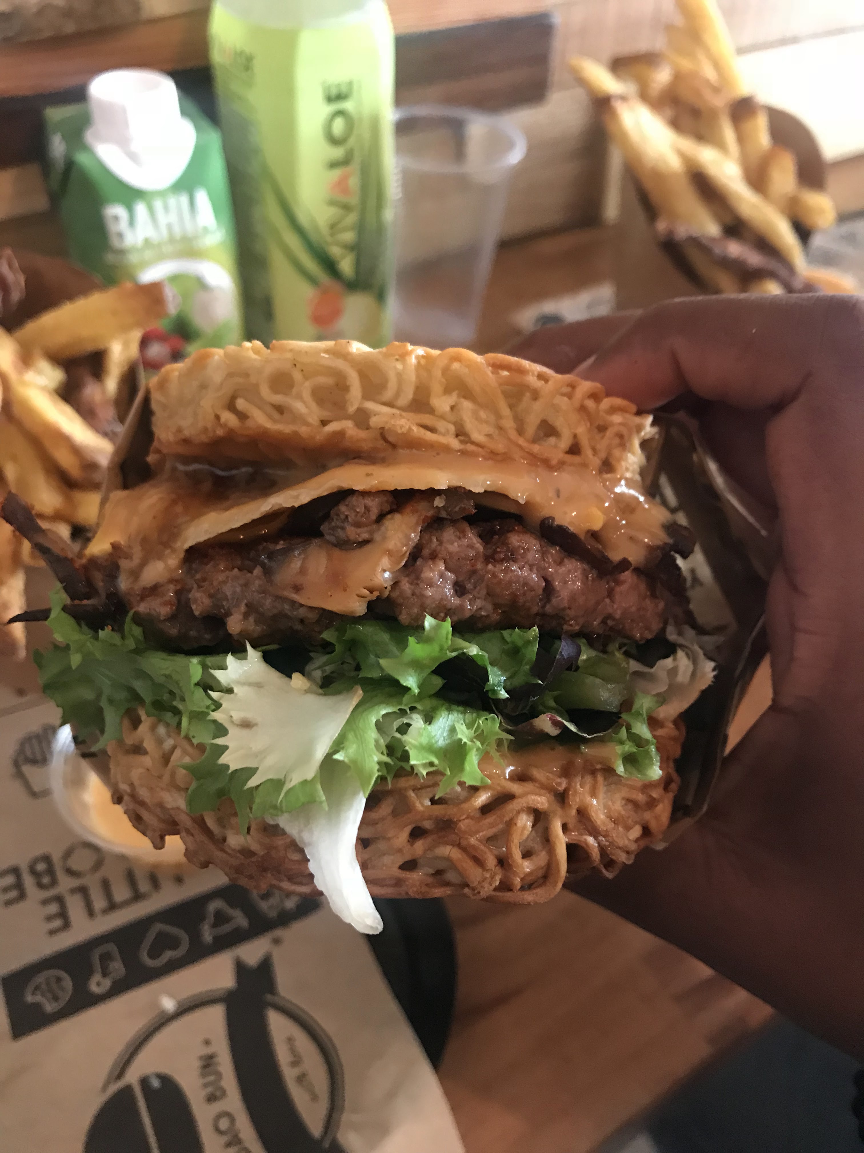 Excellent burger. Les nouilles (au four) remplacent le bun. C'estest à tester pour l'originalité et CE GOÛT ! Le bœuf est très bon, bien cuit. Les frites ... ! Elles vous feront oublier toutes les autres. Conseil perso: Prenez un thé blanc myrtille en accompagnement (Bio sans goût de sucre)