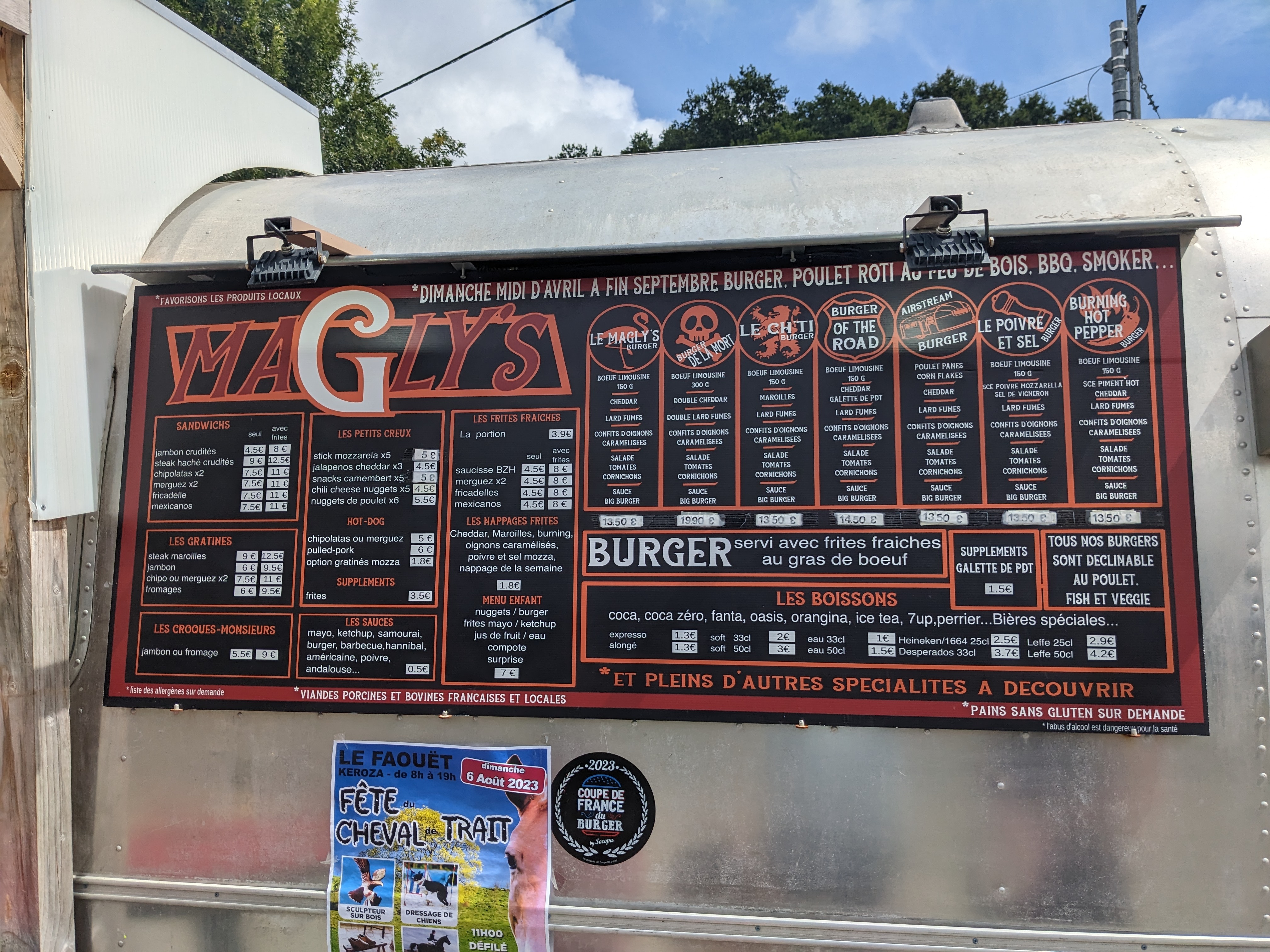 je ne voudrais pas être sévère ... car c'est vrai l’accueil est sympa ... le concept est original ... et les produits de bonne qualités ... toutefois ... après avoir gouté le burger Magly's .. ((sur un choix de 3 burgers y compris le burger surprise)) je n'ai pas retrouvé l'hamburger qui réveil les papilles .. oui le steak est gros oui les produits sont frais oui on sent un peu l'oignon caramélisé , etc ... cependant le Why Not au centre de Plouay fait beaucoup mieux en terme de gout et de prix ... ** chez Magly's la sauce dans l'hamburger ne met pas en valeur le composition du sandwich .. les frites sont bonnes et surtout en gras saturé avec la gras de bœuf ((ne pas on abuser..)) ... bref a mon sens il manque un peu pour devenir un lieu incontournable ... PS: pour manger sur place ... ça serait plus sympa d'avoir sa commande sur un plateau ...