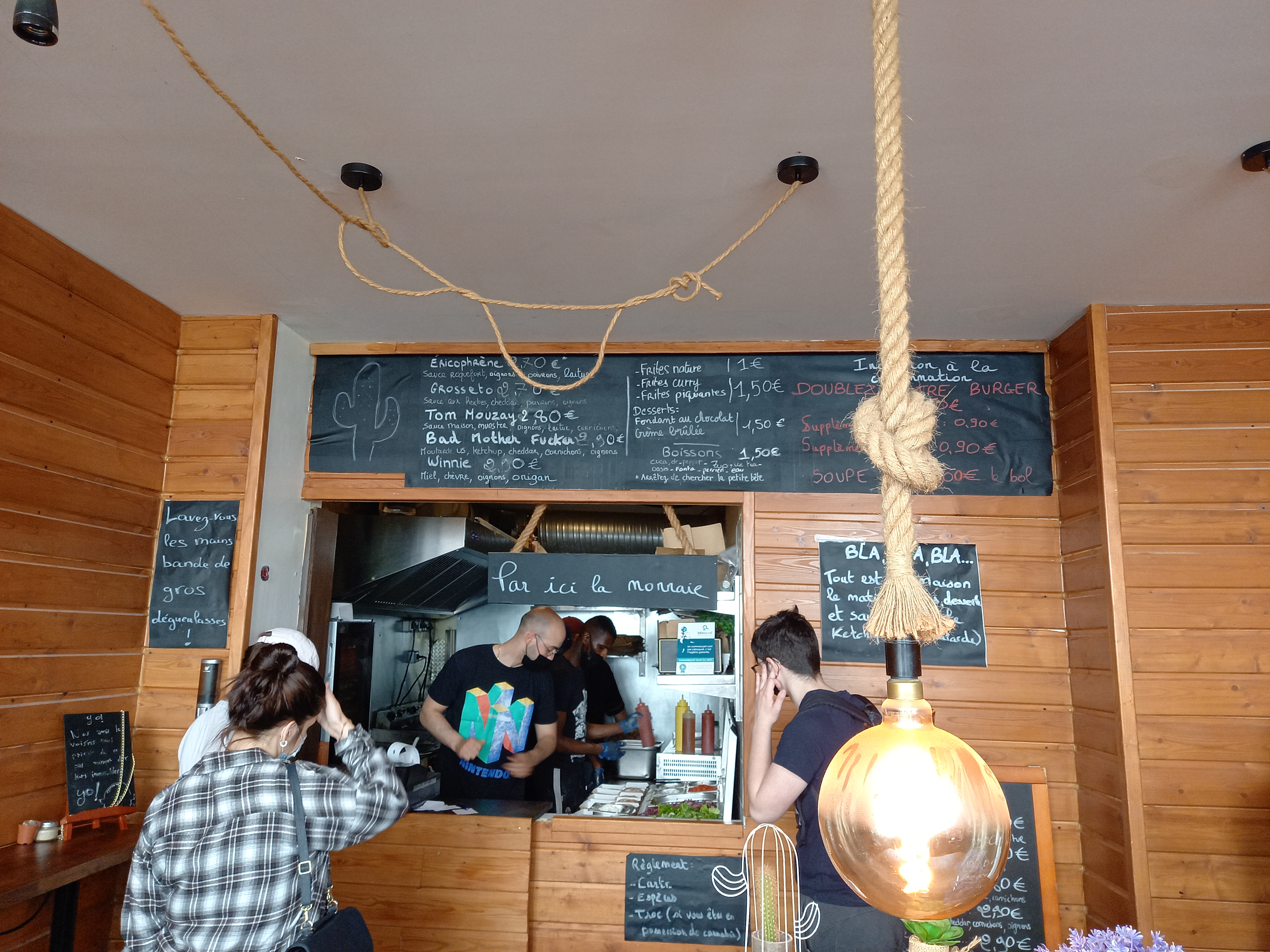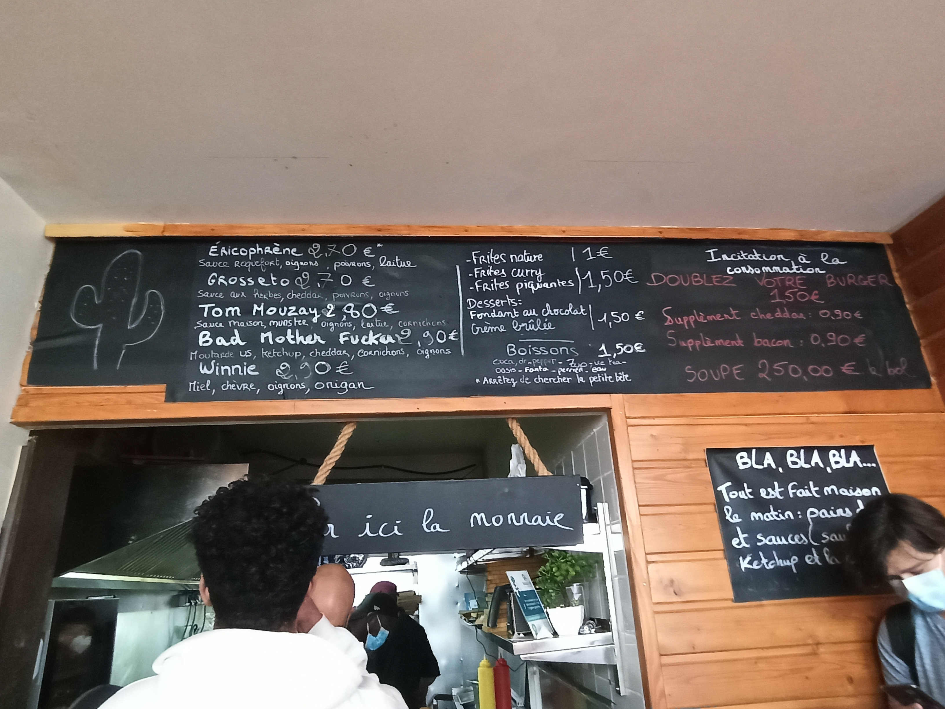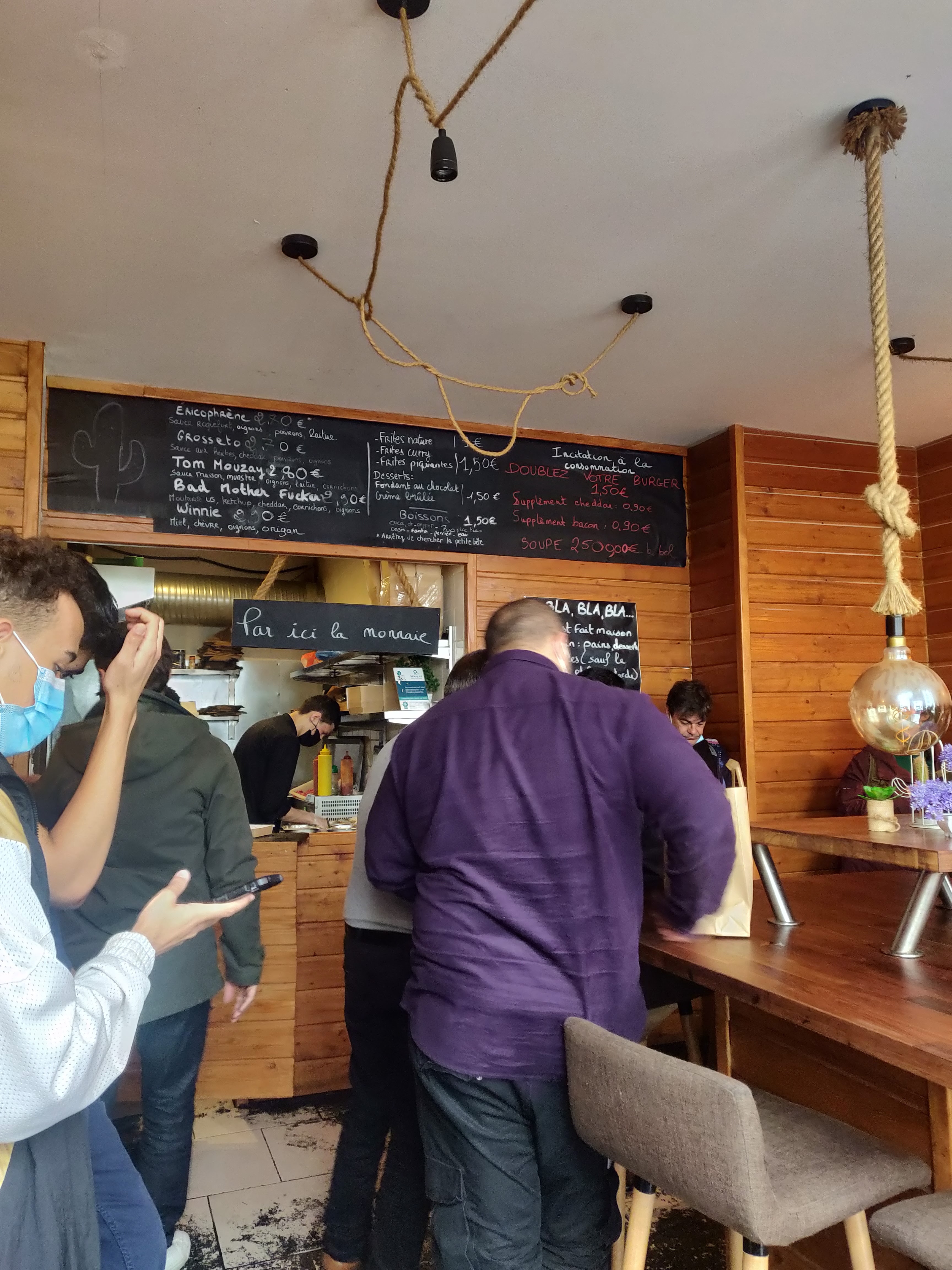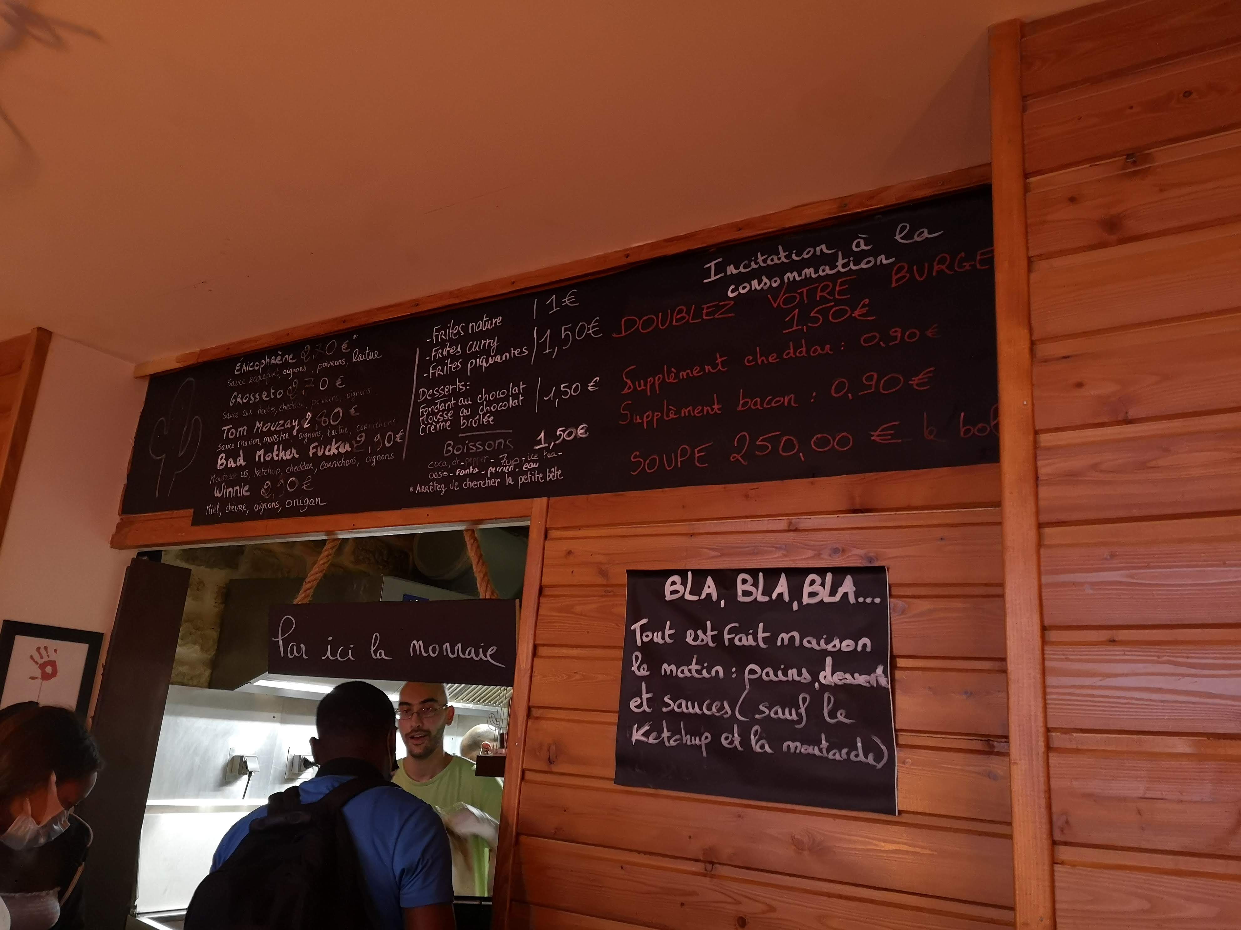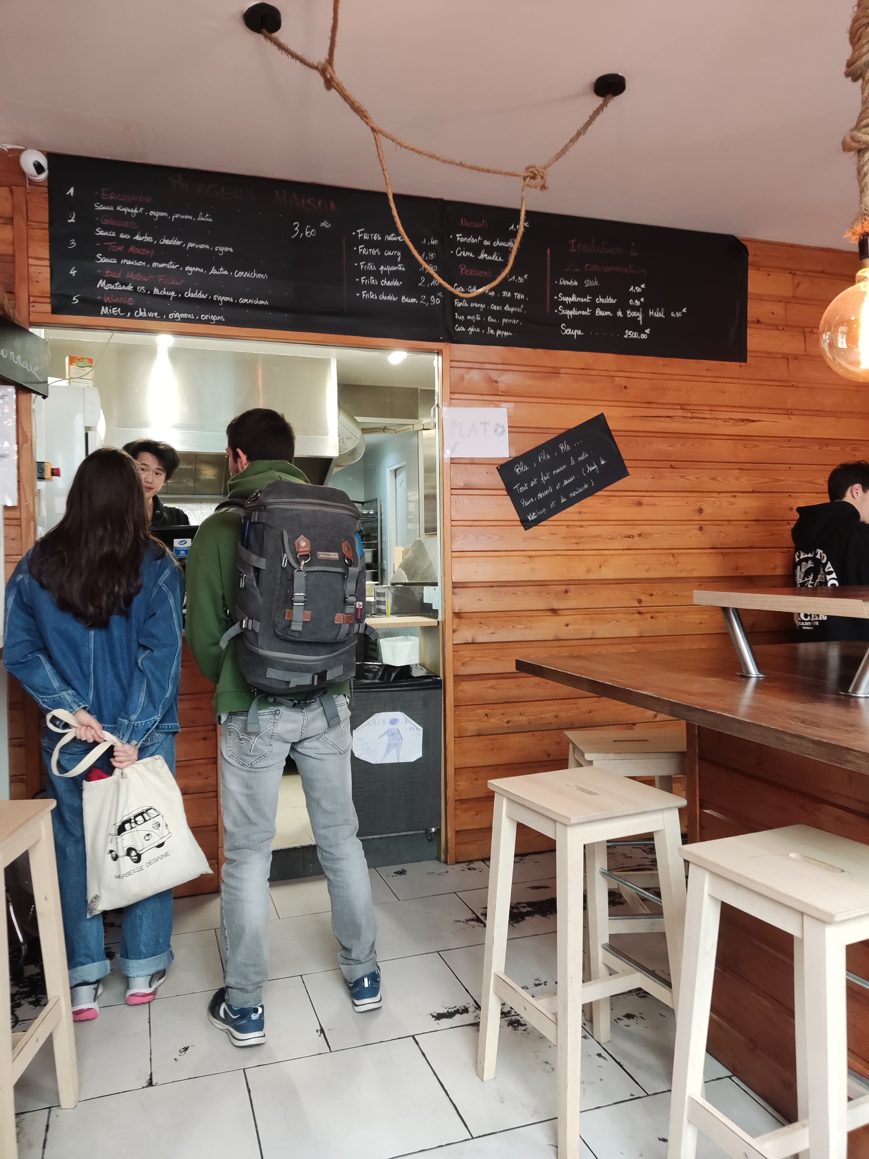 Petit conseil, venir à 19h maximum, car arriver à 19h30, c'est 2h en moyenne d'attente. Mais c'est trop bon ! On a adoré le burger, moins les frites, le dessert aussi très bon. Lieu où tout est fait maison sauf la moutarde et le ketchup, à des prix dérisoires, 2,70€ à 2,90€ le burger, 1€ les frites, 1,50€ le dessert ou la boisson. À l'intérieur des petits mots plein d'humour et personnel très agréable.