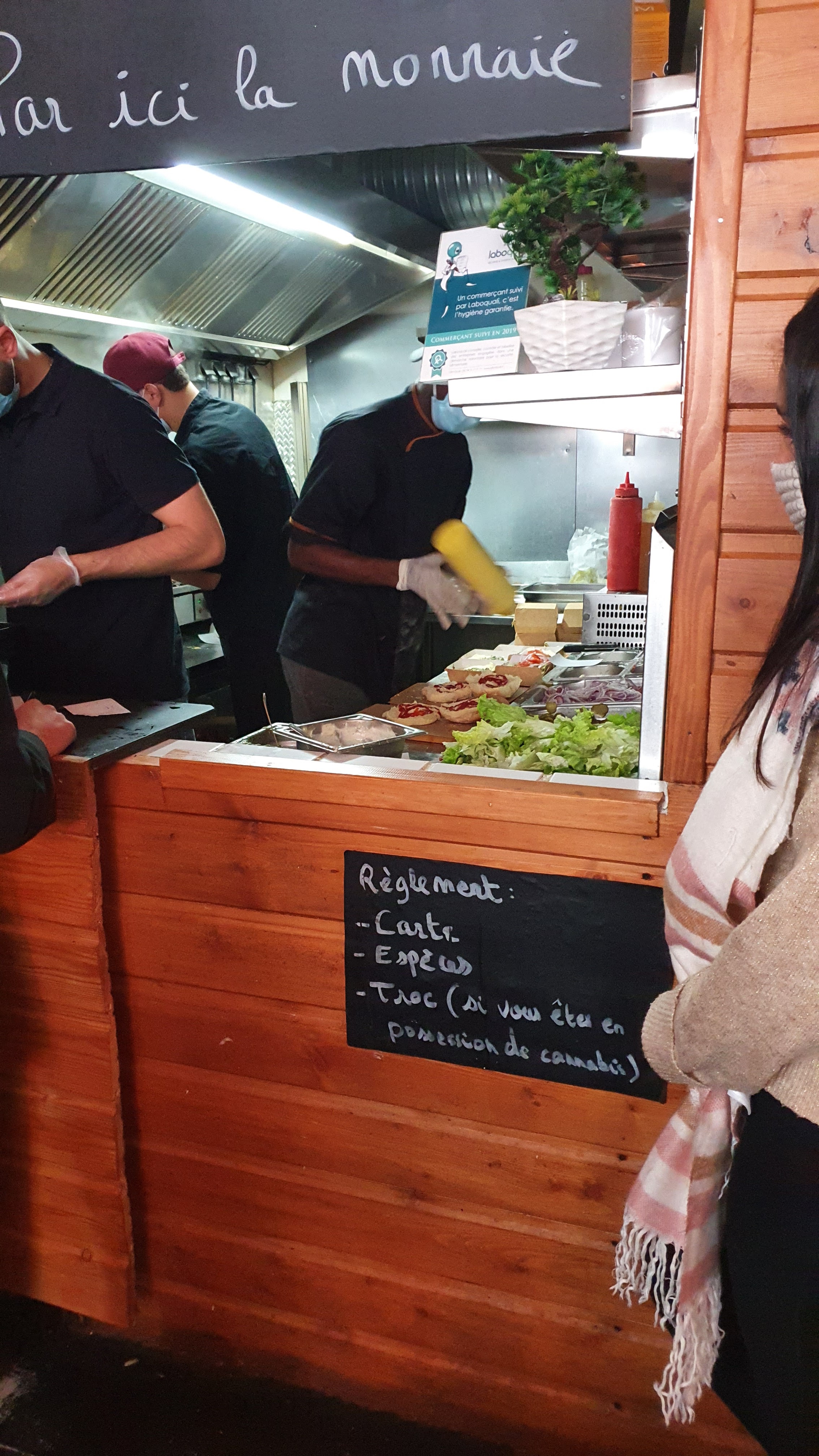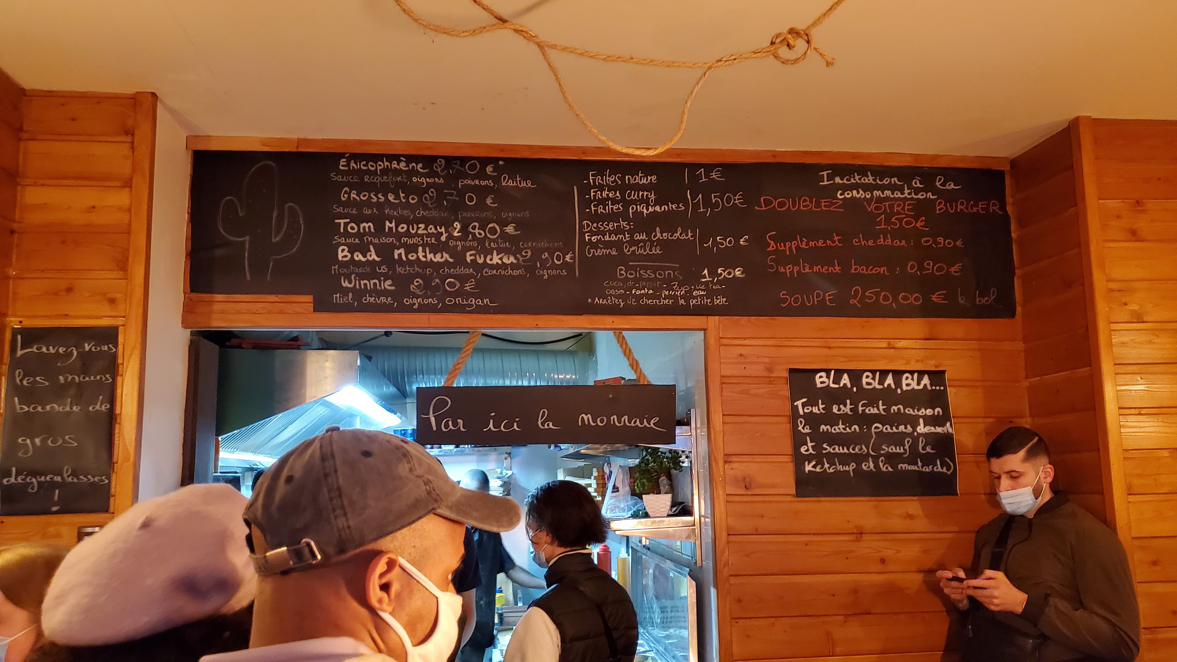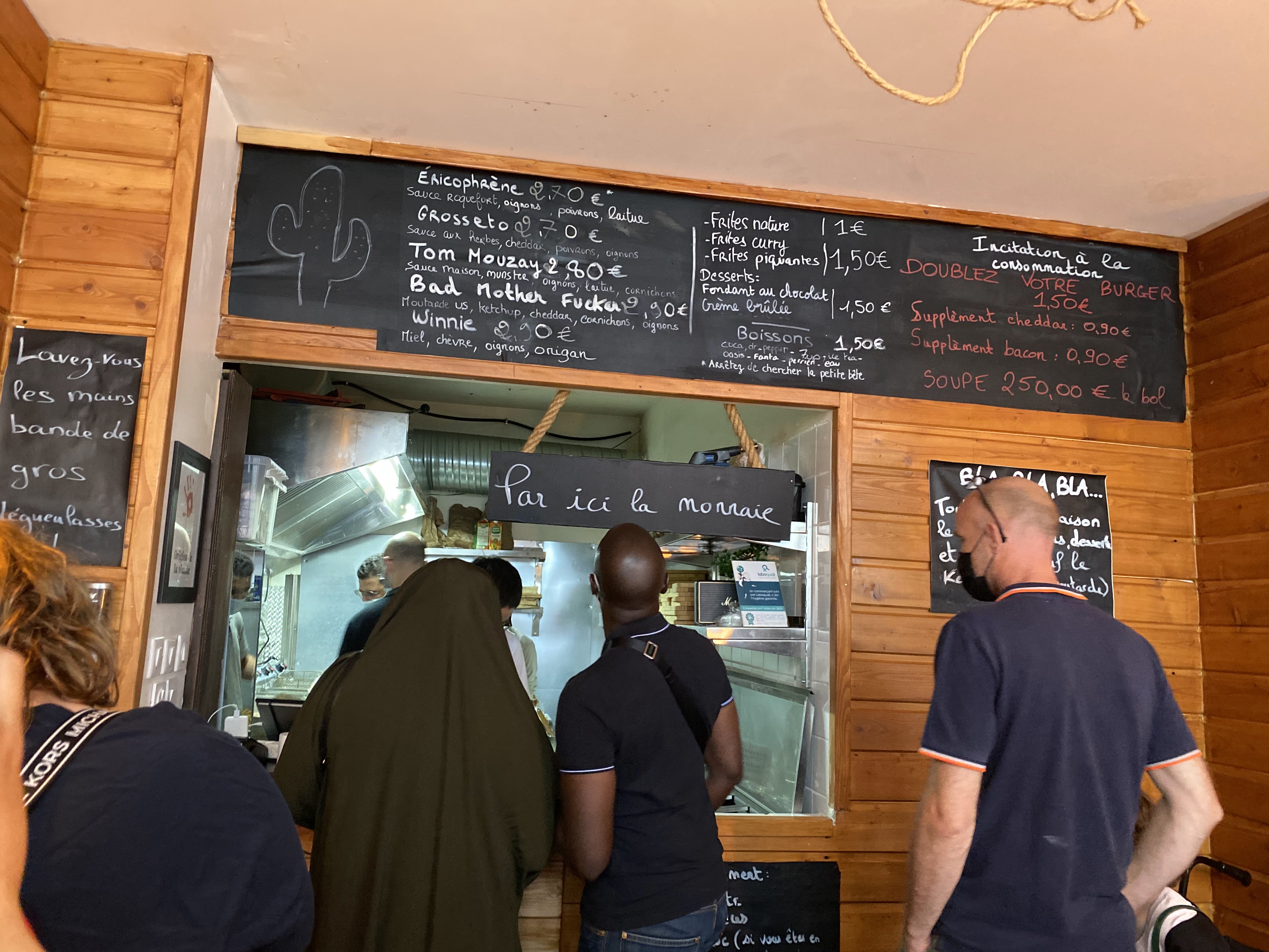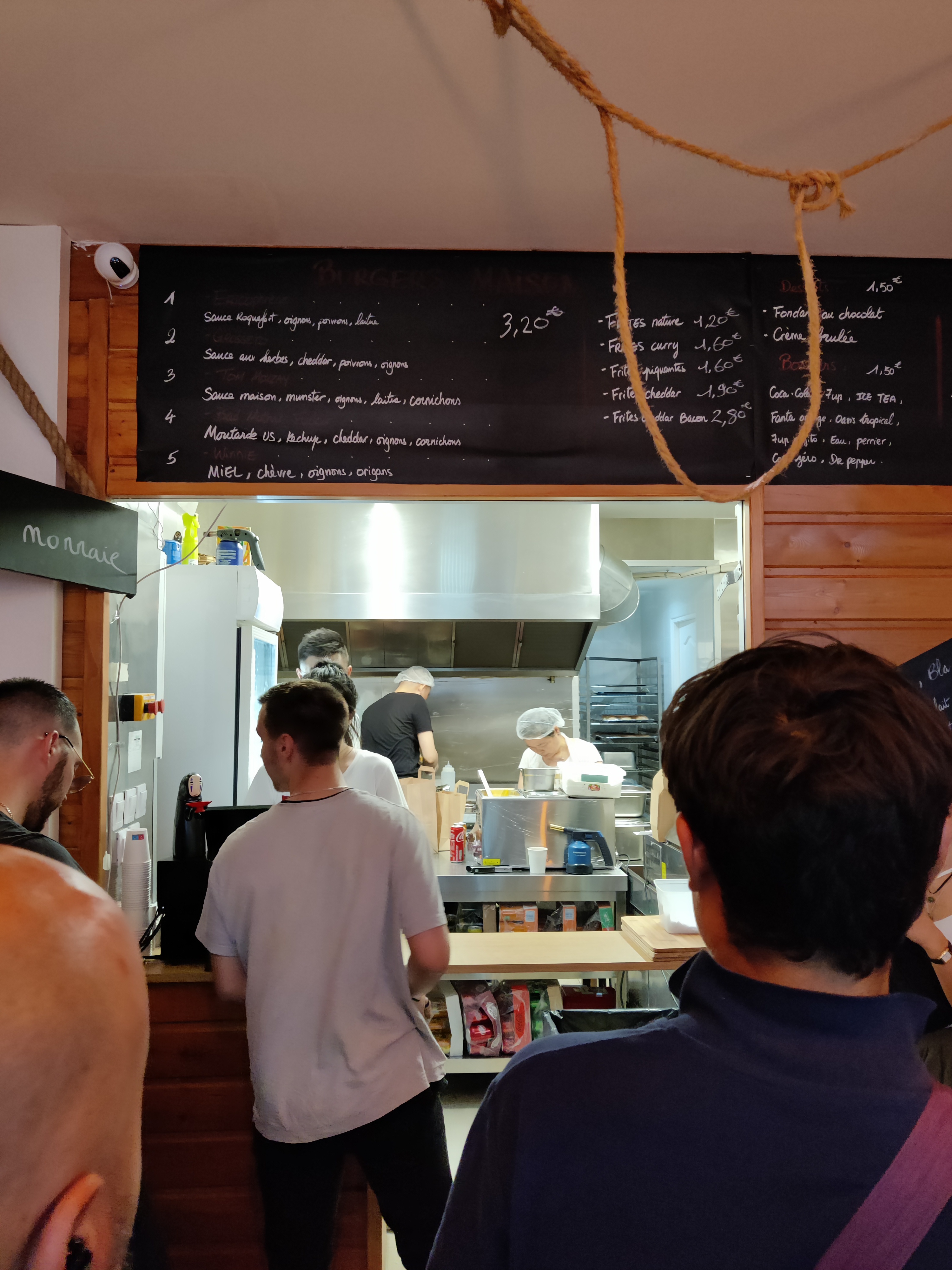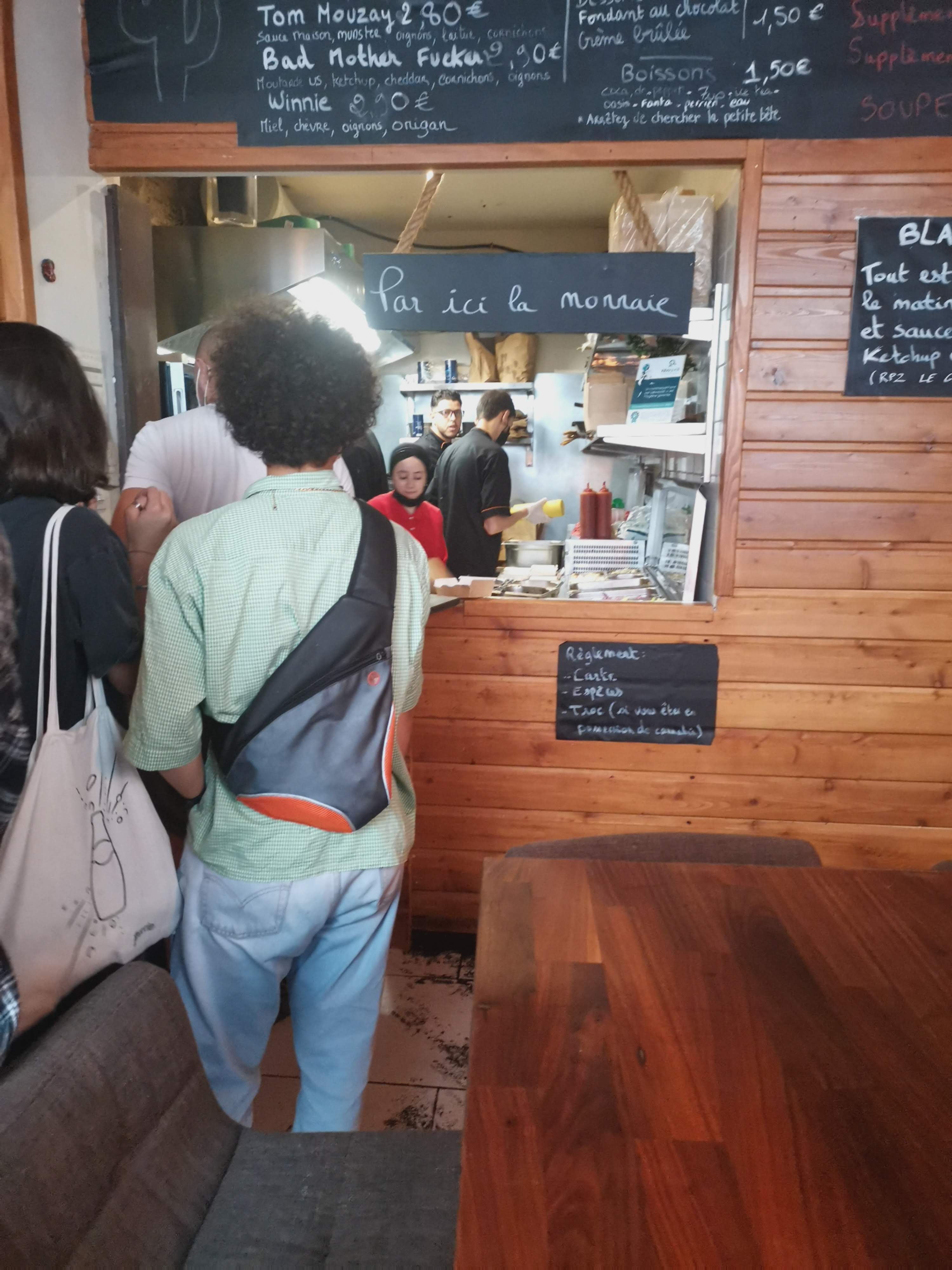 Petit conseil, venir à 19h maximum, car arriver à 19h30, c'est 2h en moyenne d'attente. Mais c'est trop bon ! On a adoré le burger, moins les frites, le dessert aussi très bon. Lieu où tout est fait maison sauf la moutarde et le ketchup, à des prix dérisoires, 2,70€ à 2,90€ le burger, 1€ les frites, 1,50€ le dessert ou la boisson. À l'intérieur des petits mots plein d'humour et personnel très agréable.